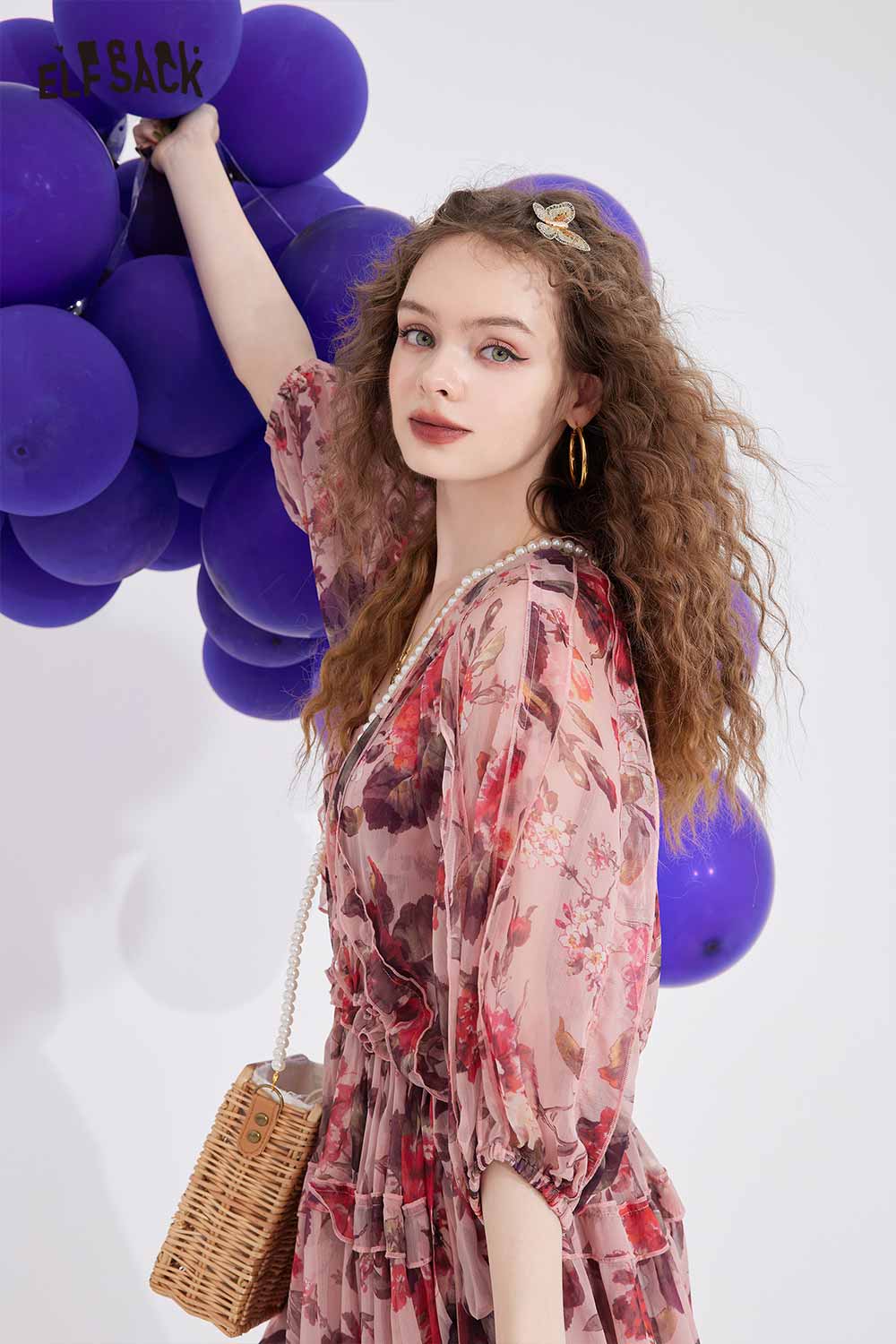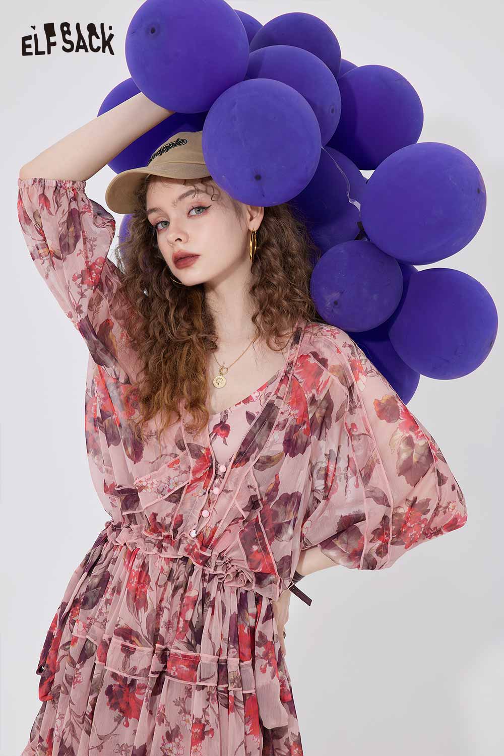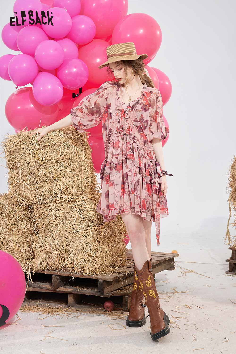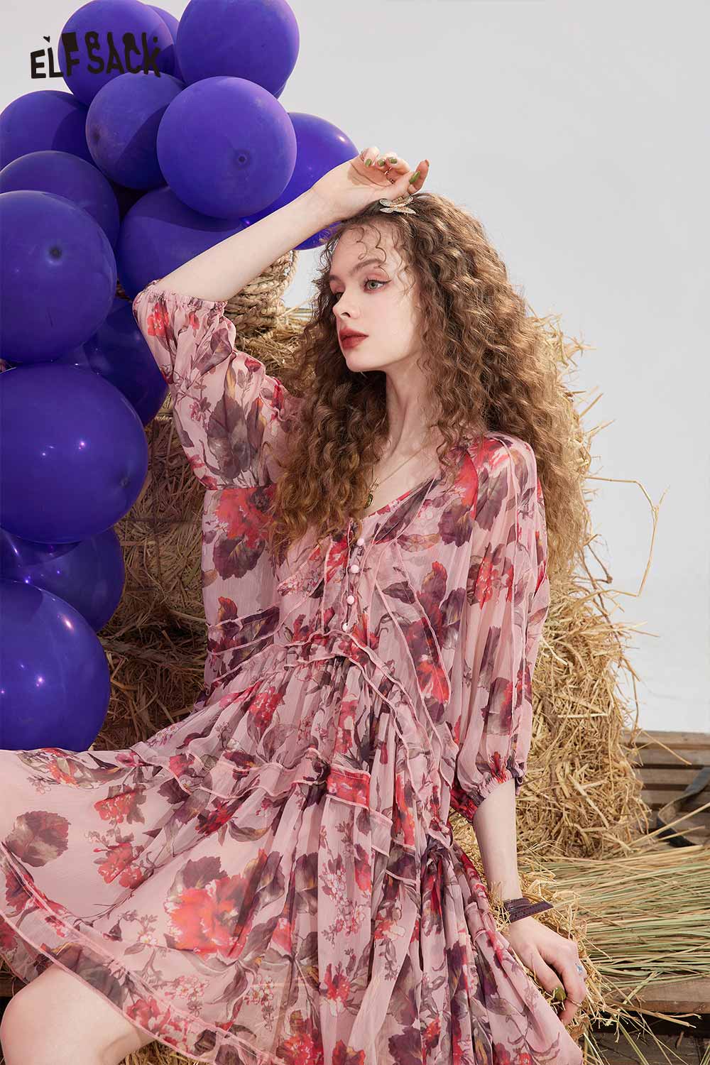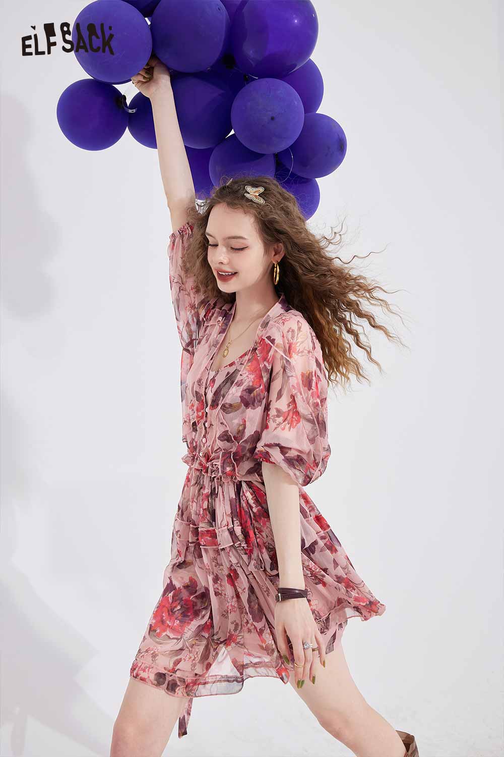 Floral Chiffon V Neck Waist Tie Dress