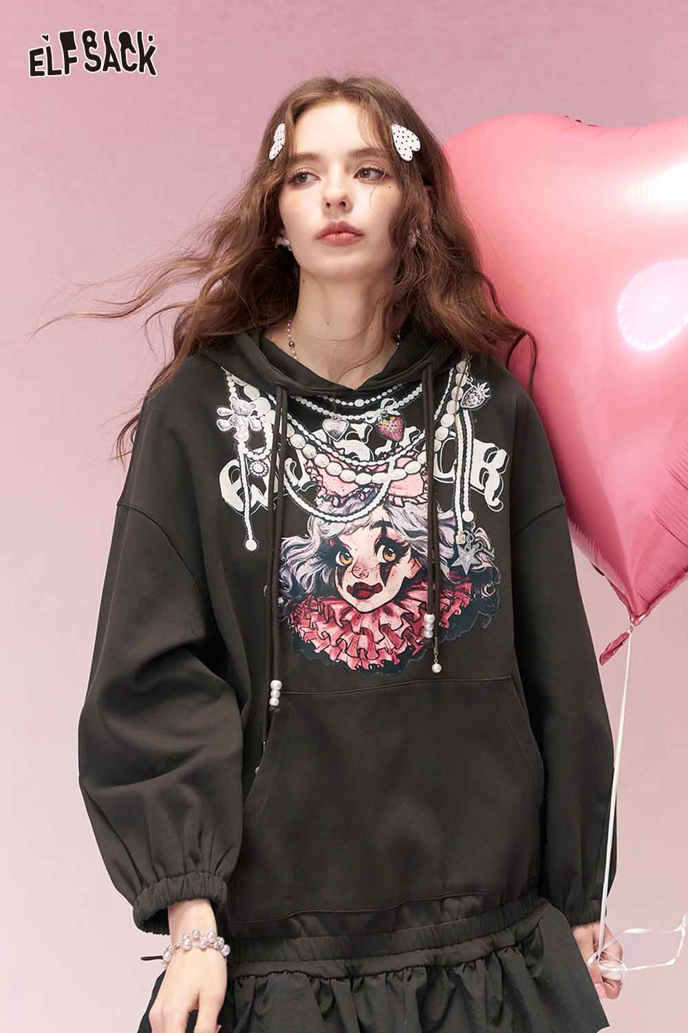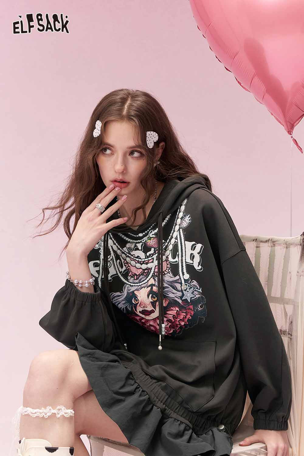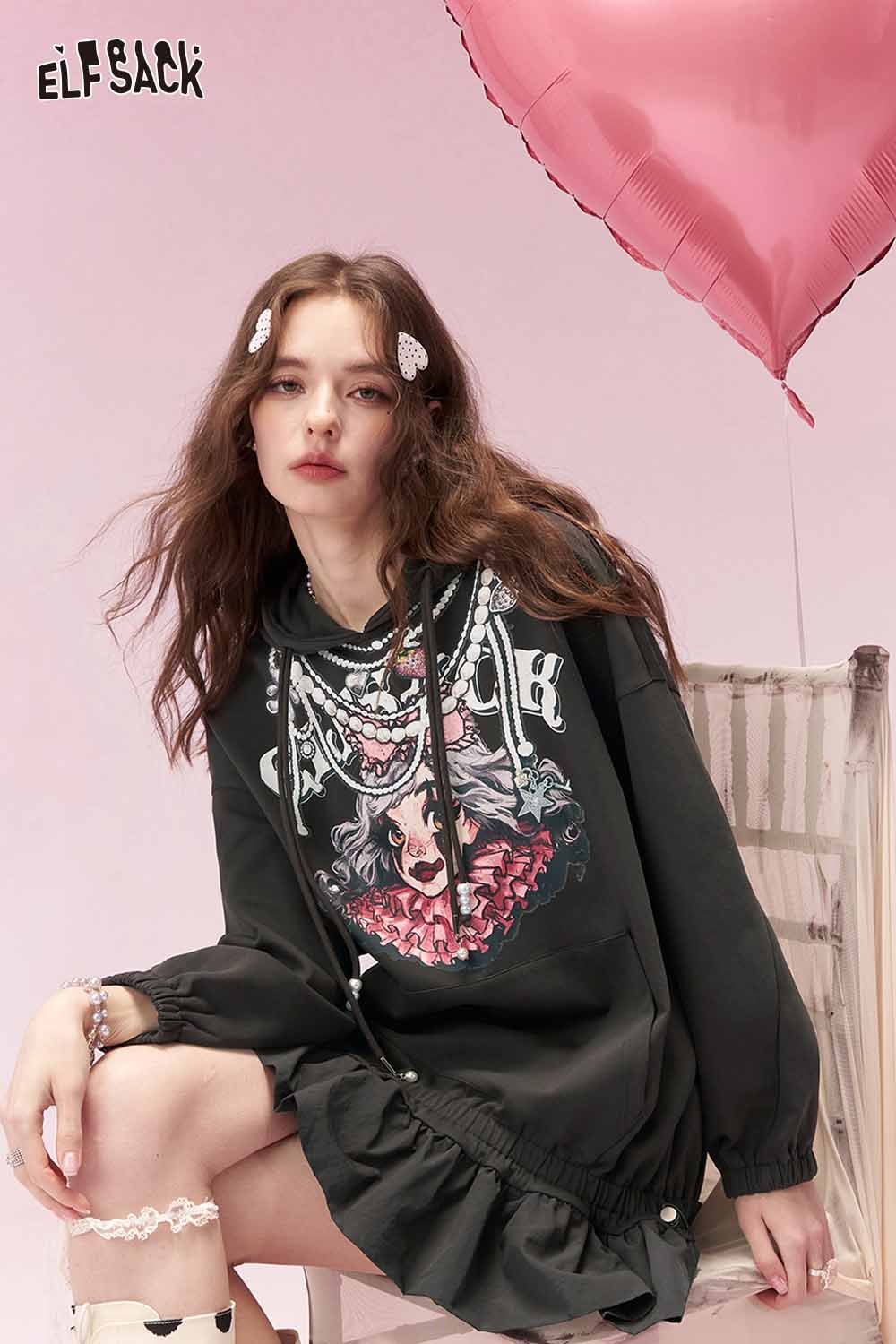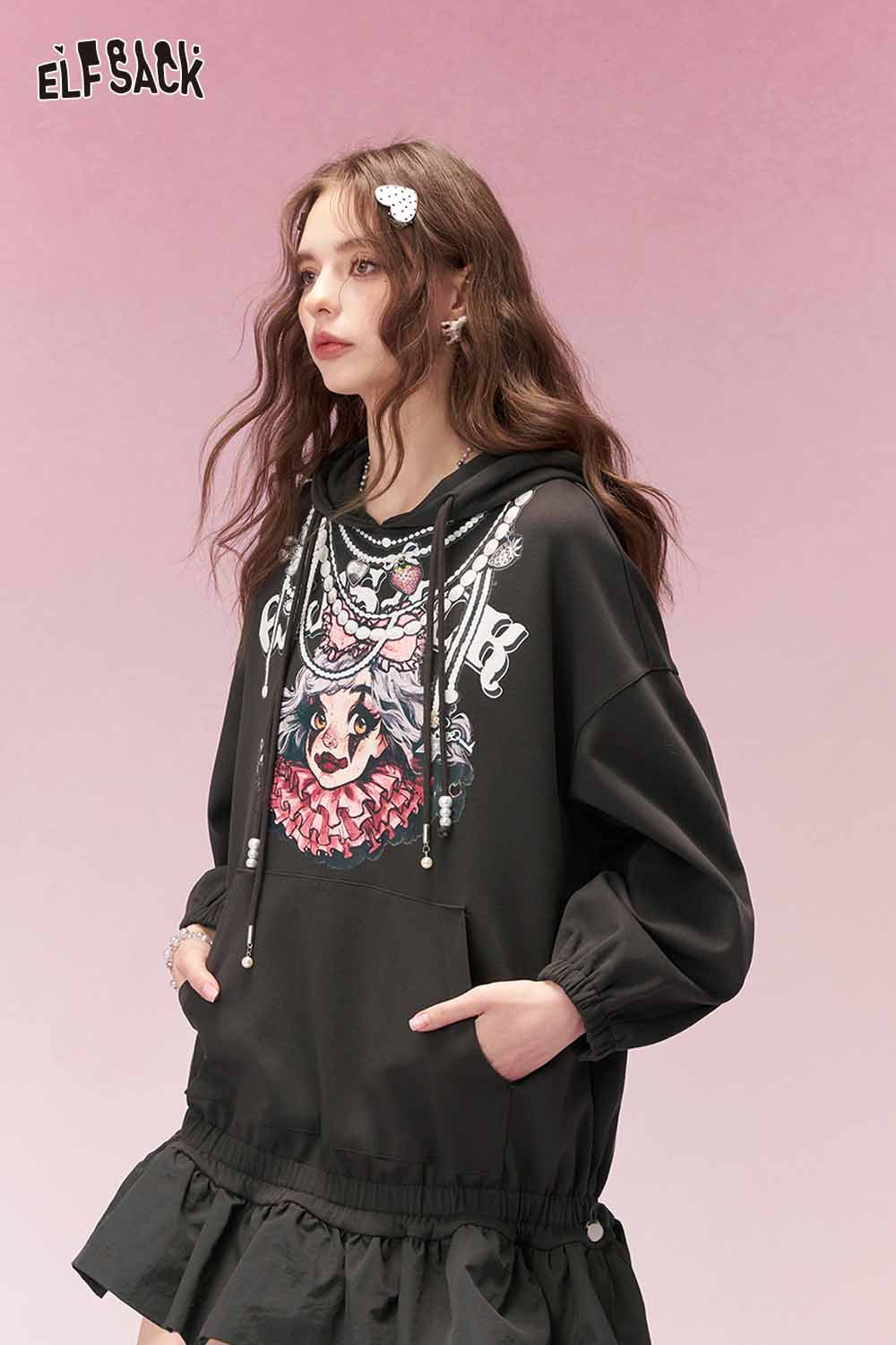 ELFSACK black preppy clown girl print sweatshirt dress with a hood and ruffled hem for a trendy look