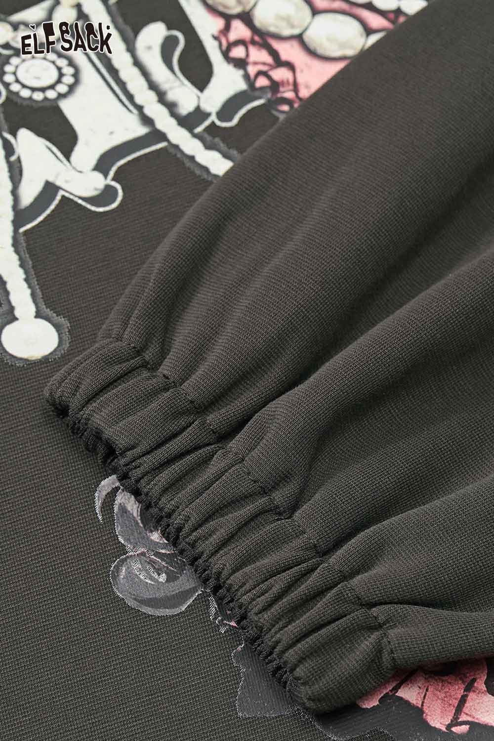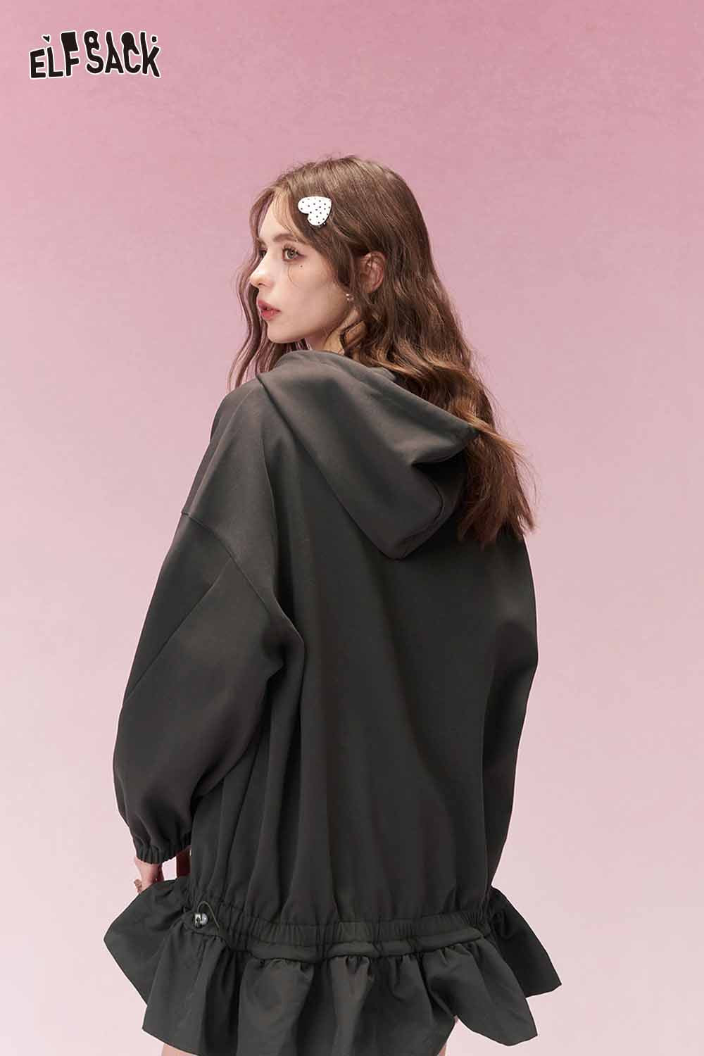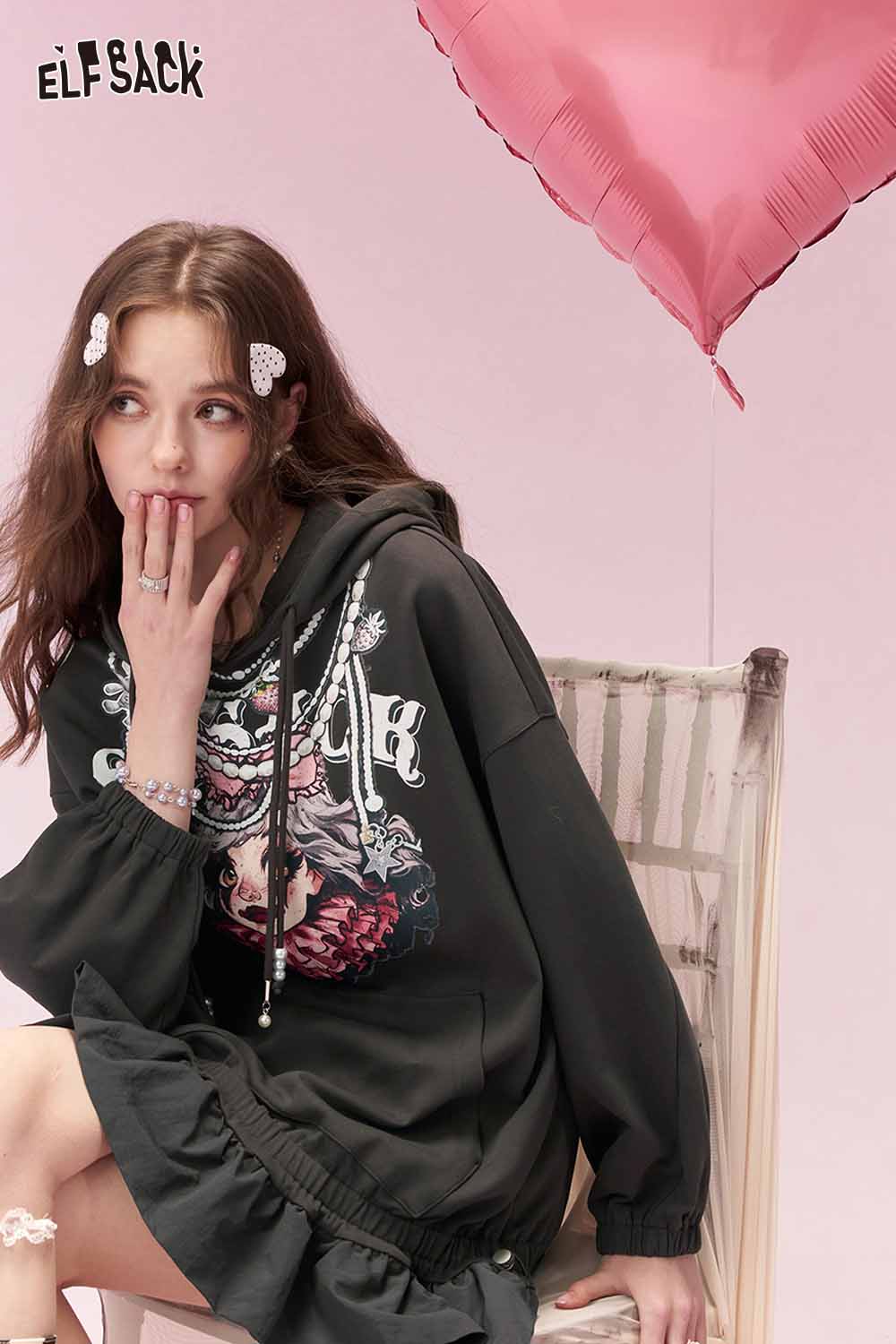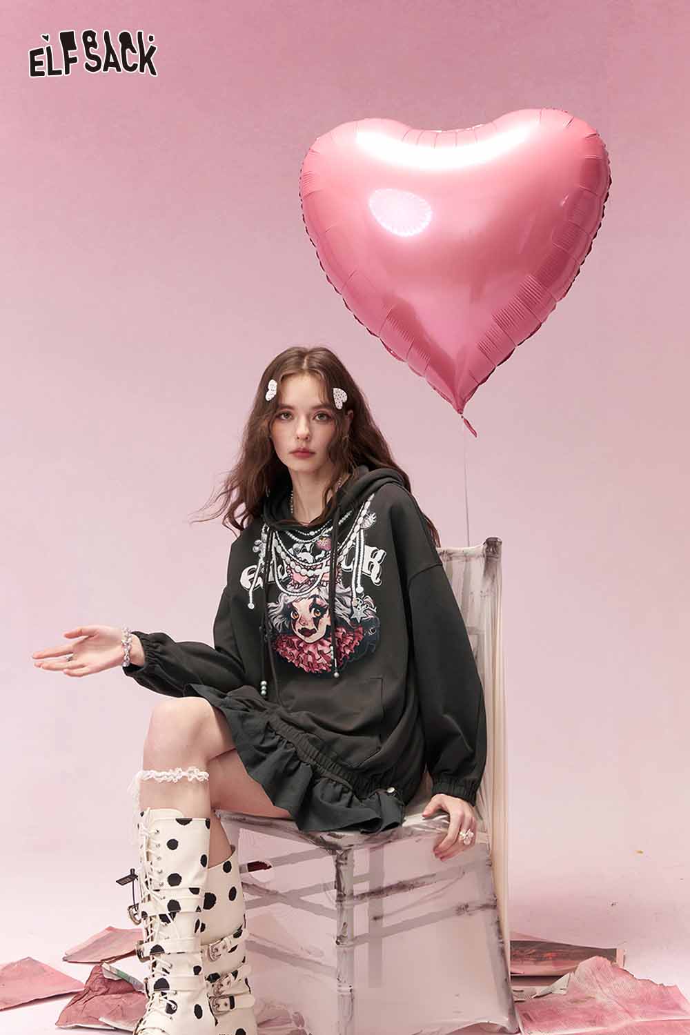 ELFSACK black preppy clown girl print sweatshirt dress with a hood and ruffled hem for a trendy look