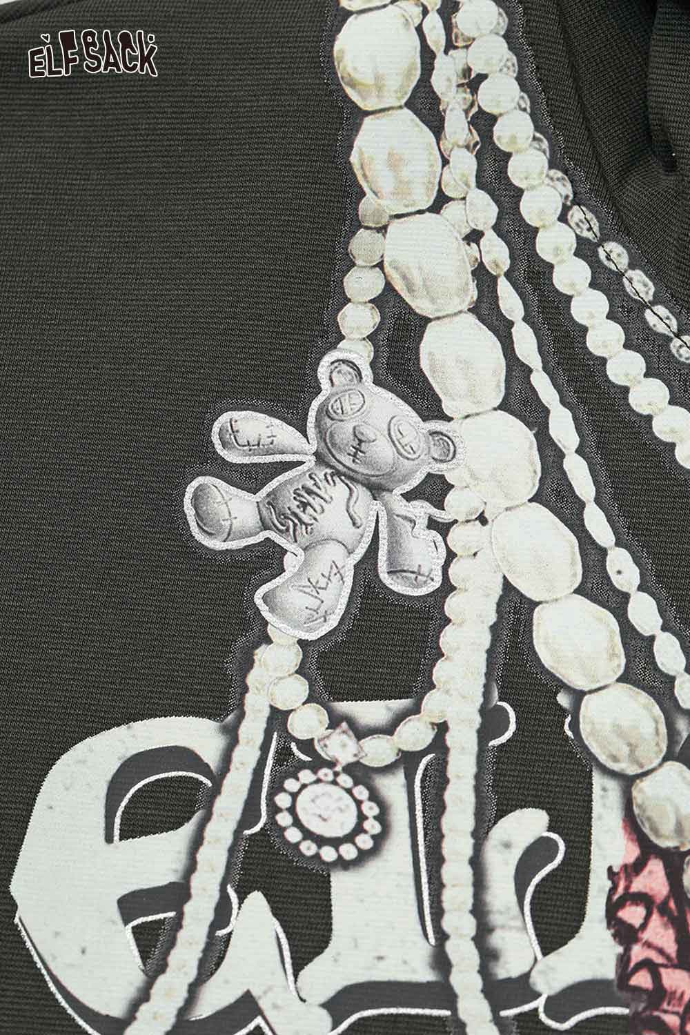 ELFSACK preppy clown girl print sweatshirt dress featuring a playful teddy bear and pearl necklace design