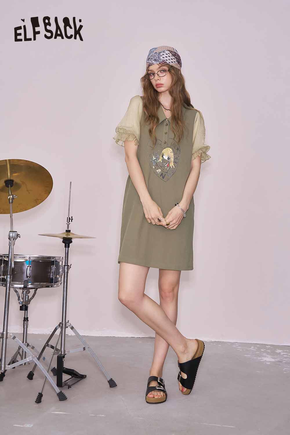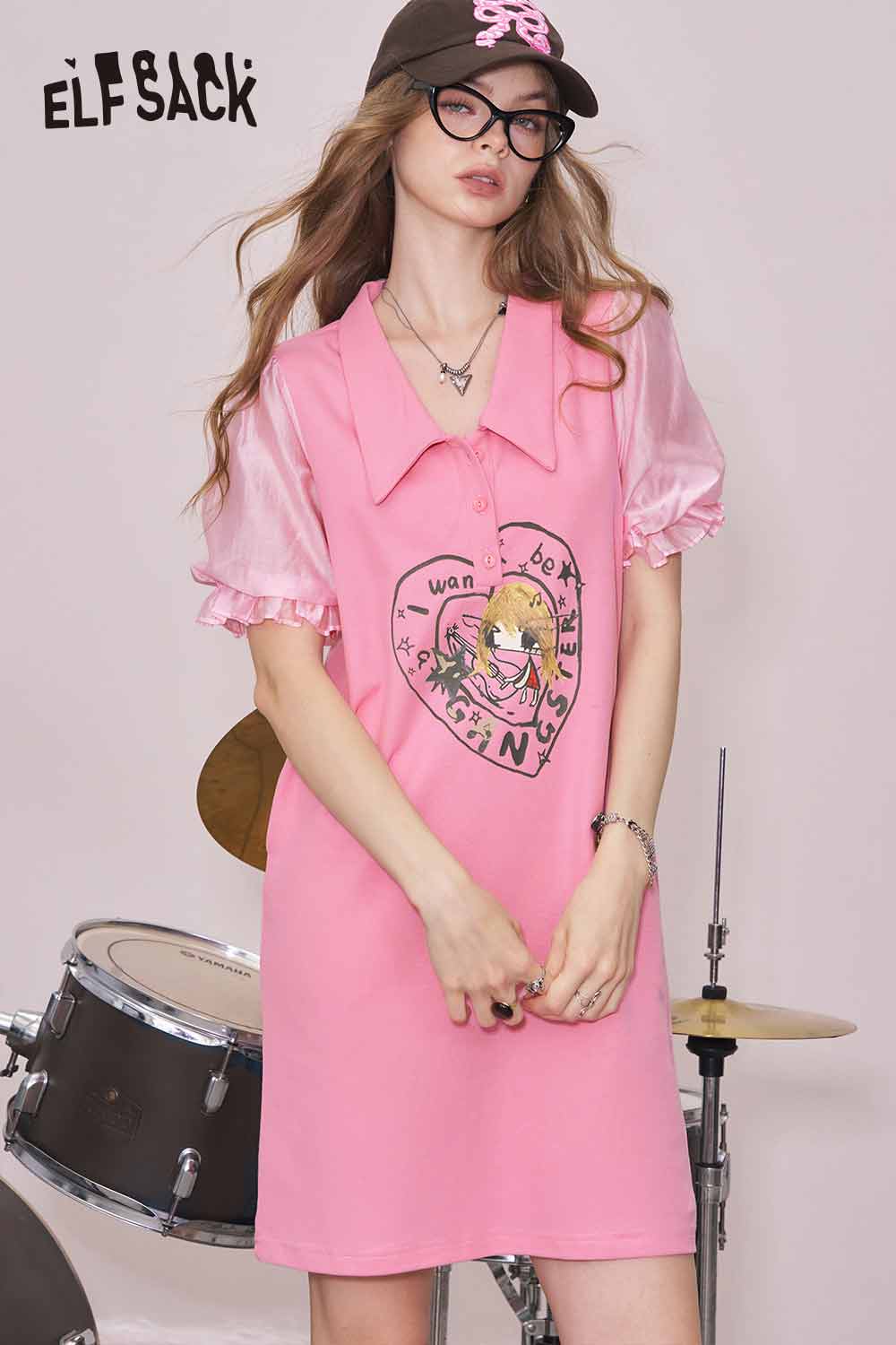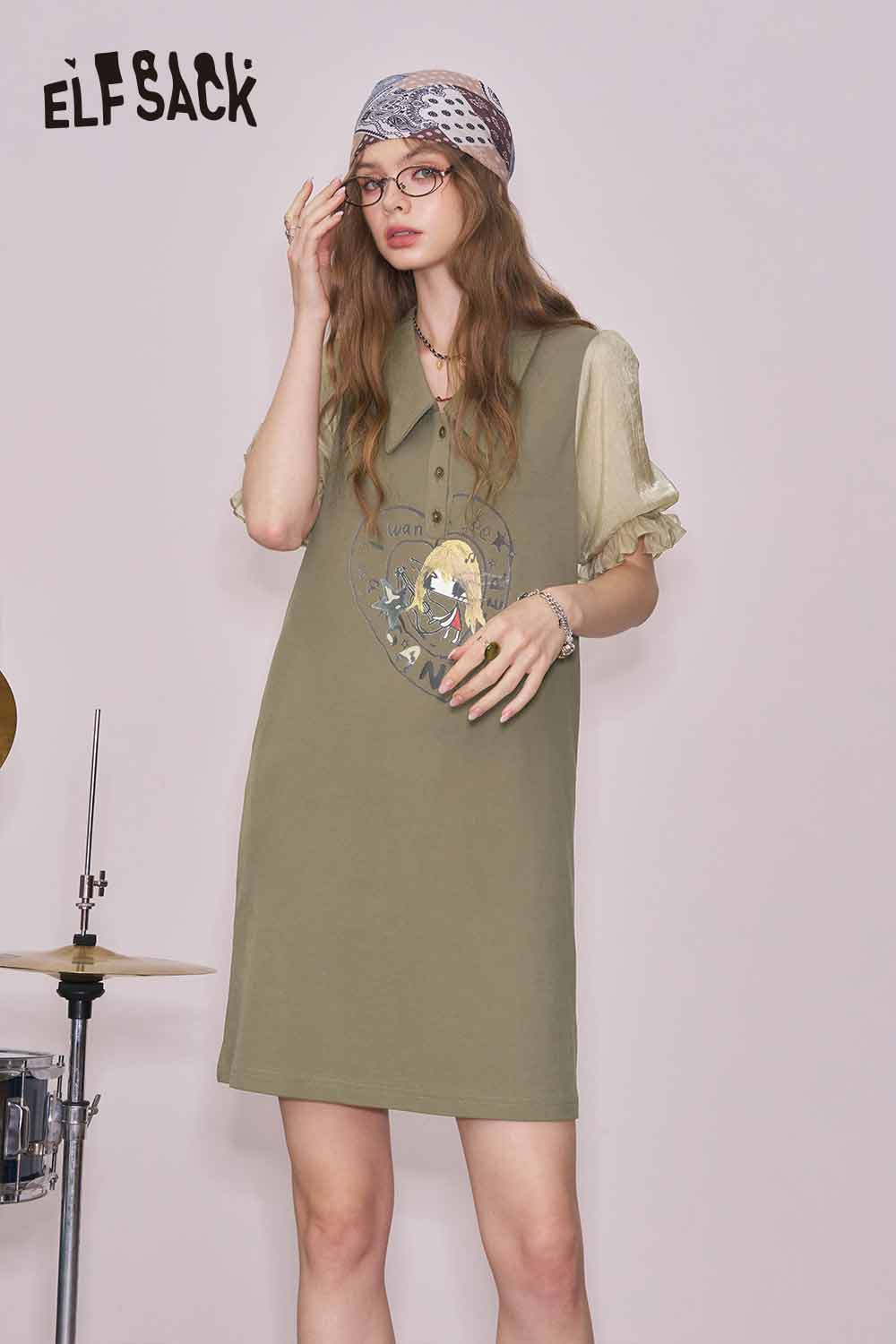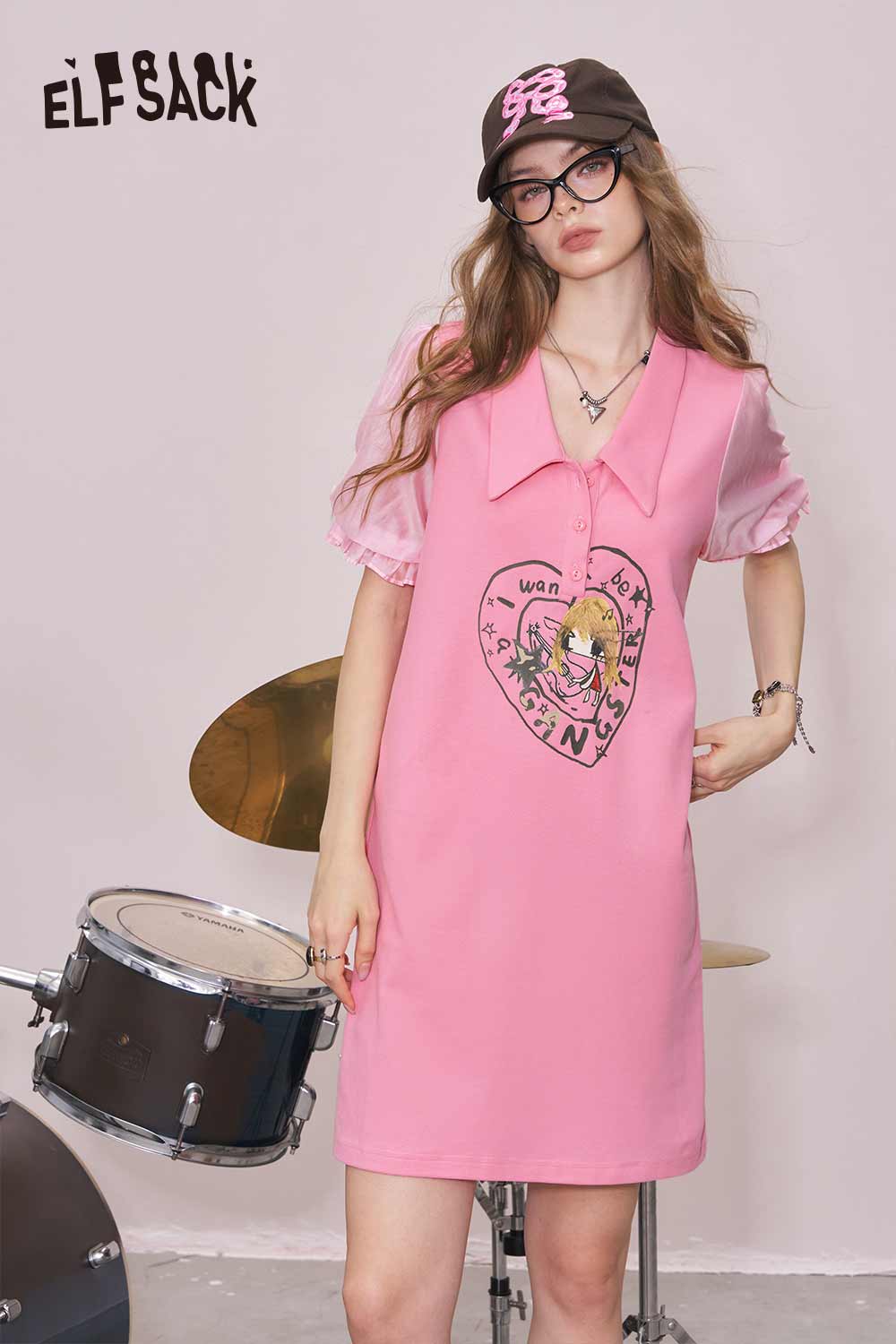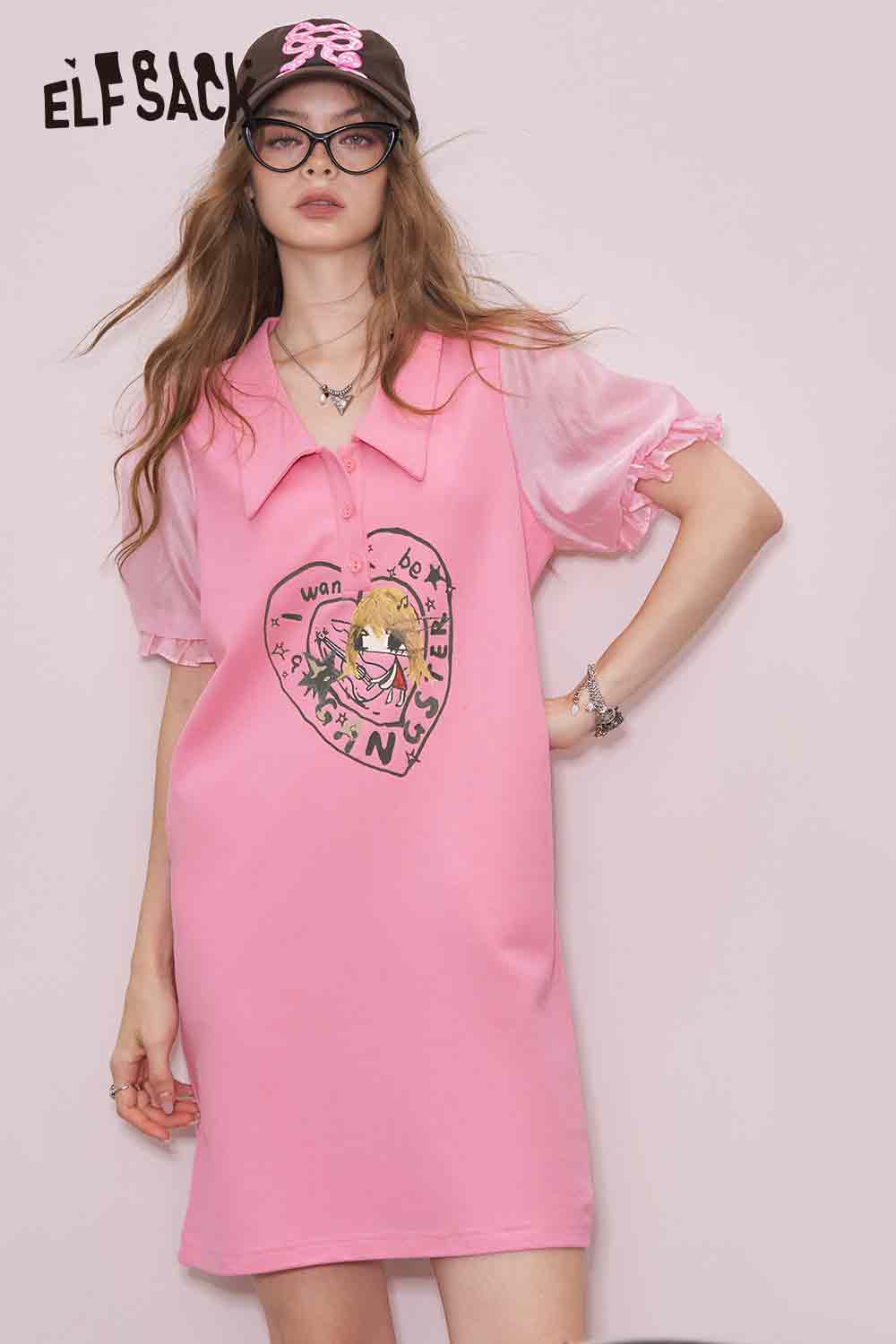 Cotton Polo Collar Original Printed Puff Sleeve Mini T-Shirt Dress