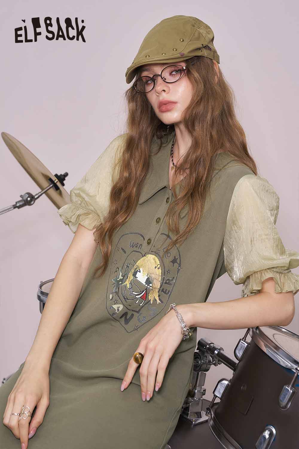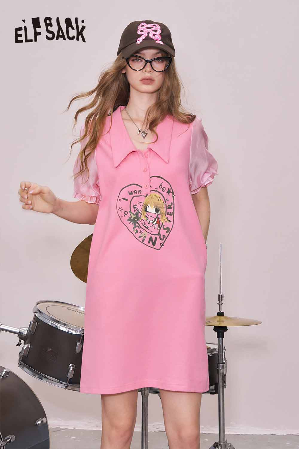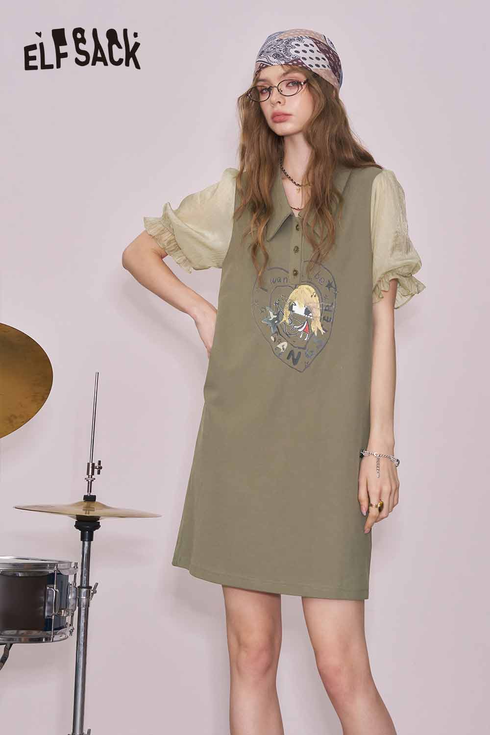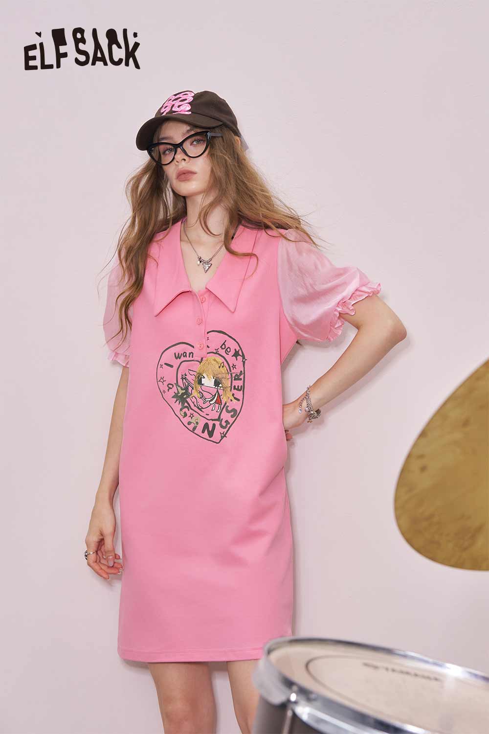 Cotton Polo Collar Original Printed Puff Sleeve Mini T-Shirt Dress
