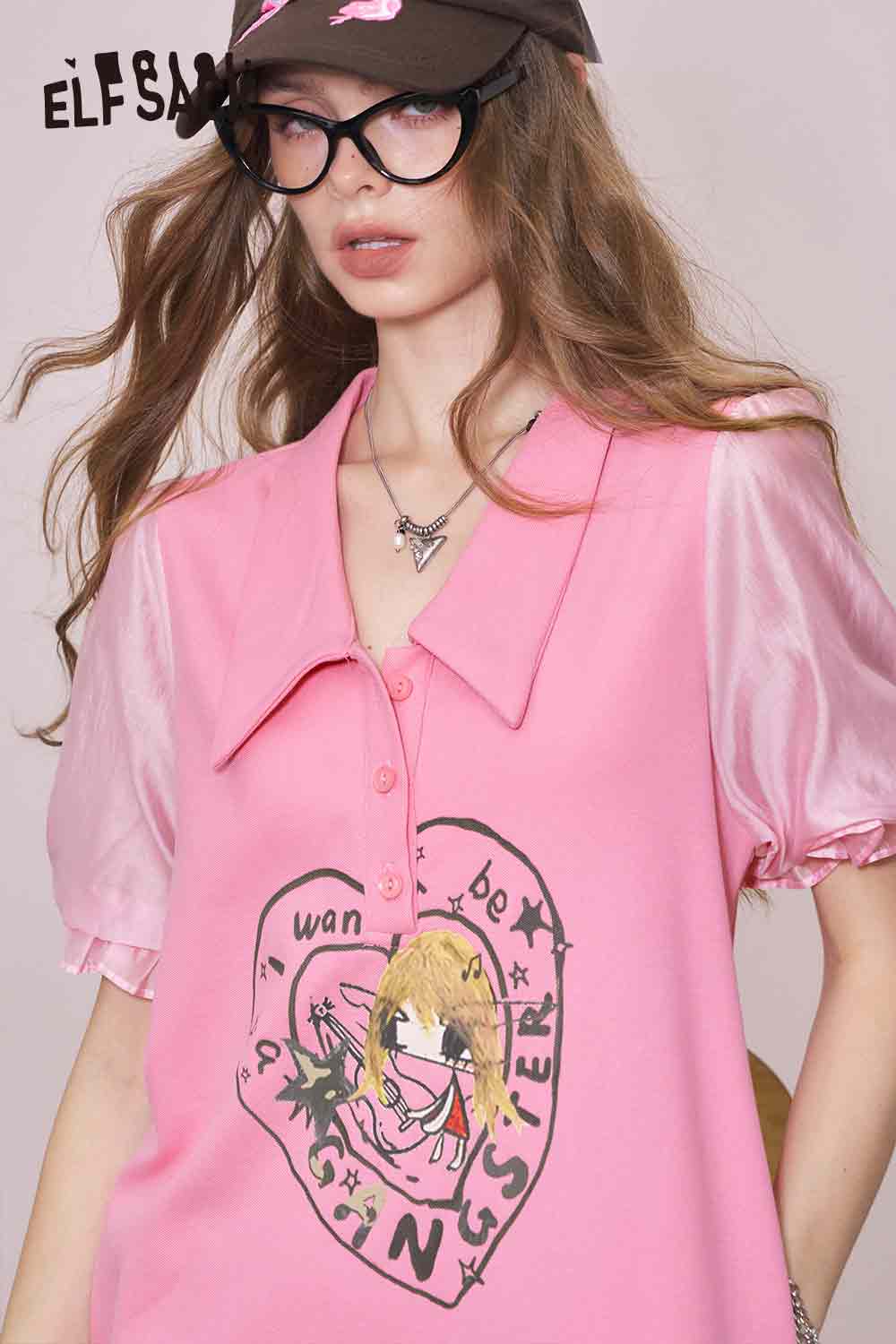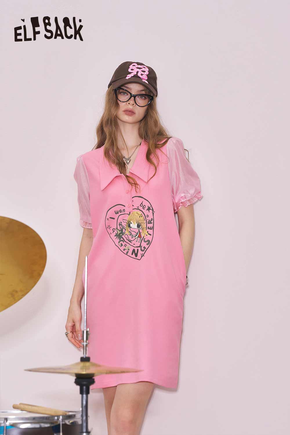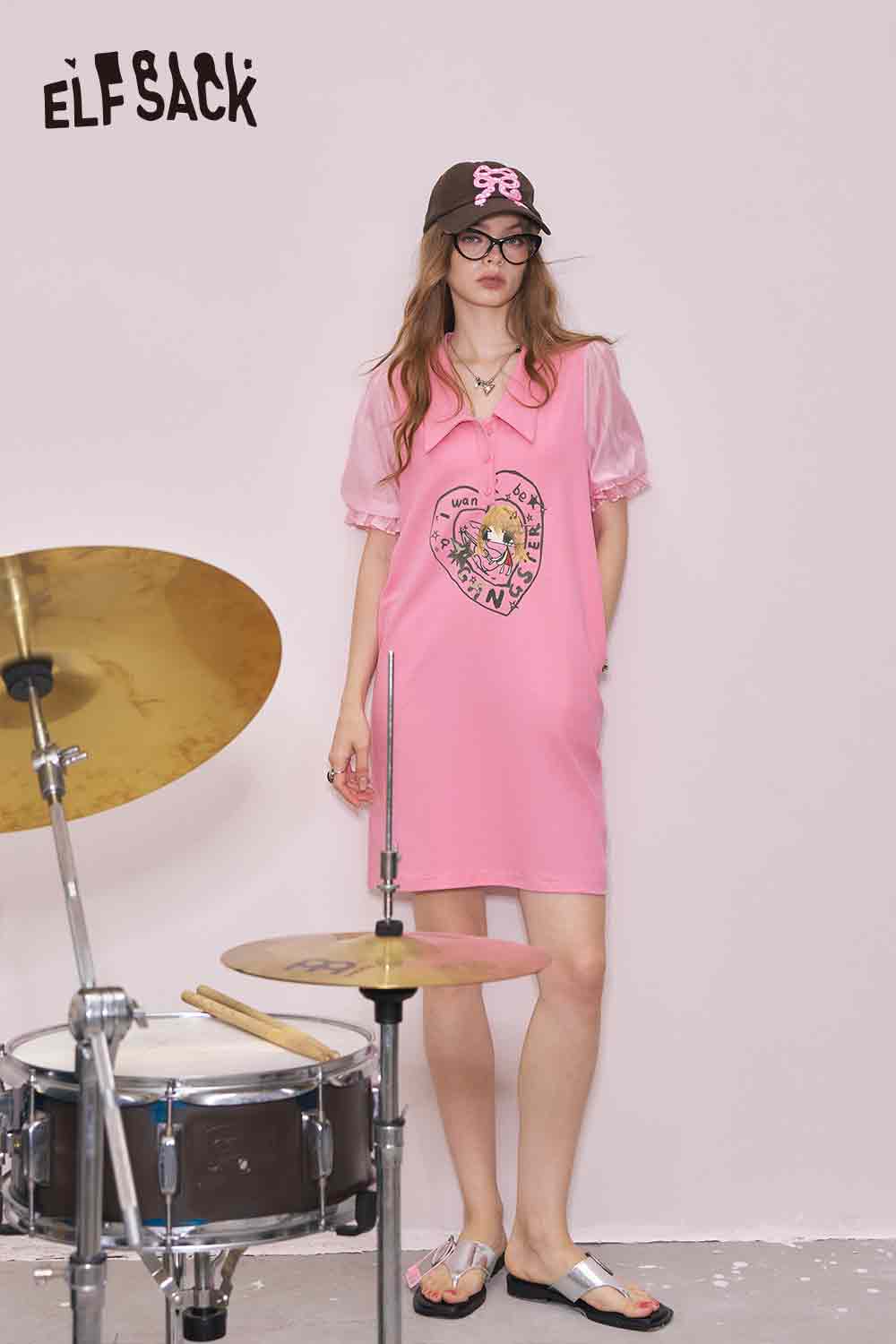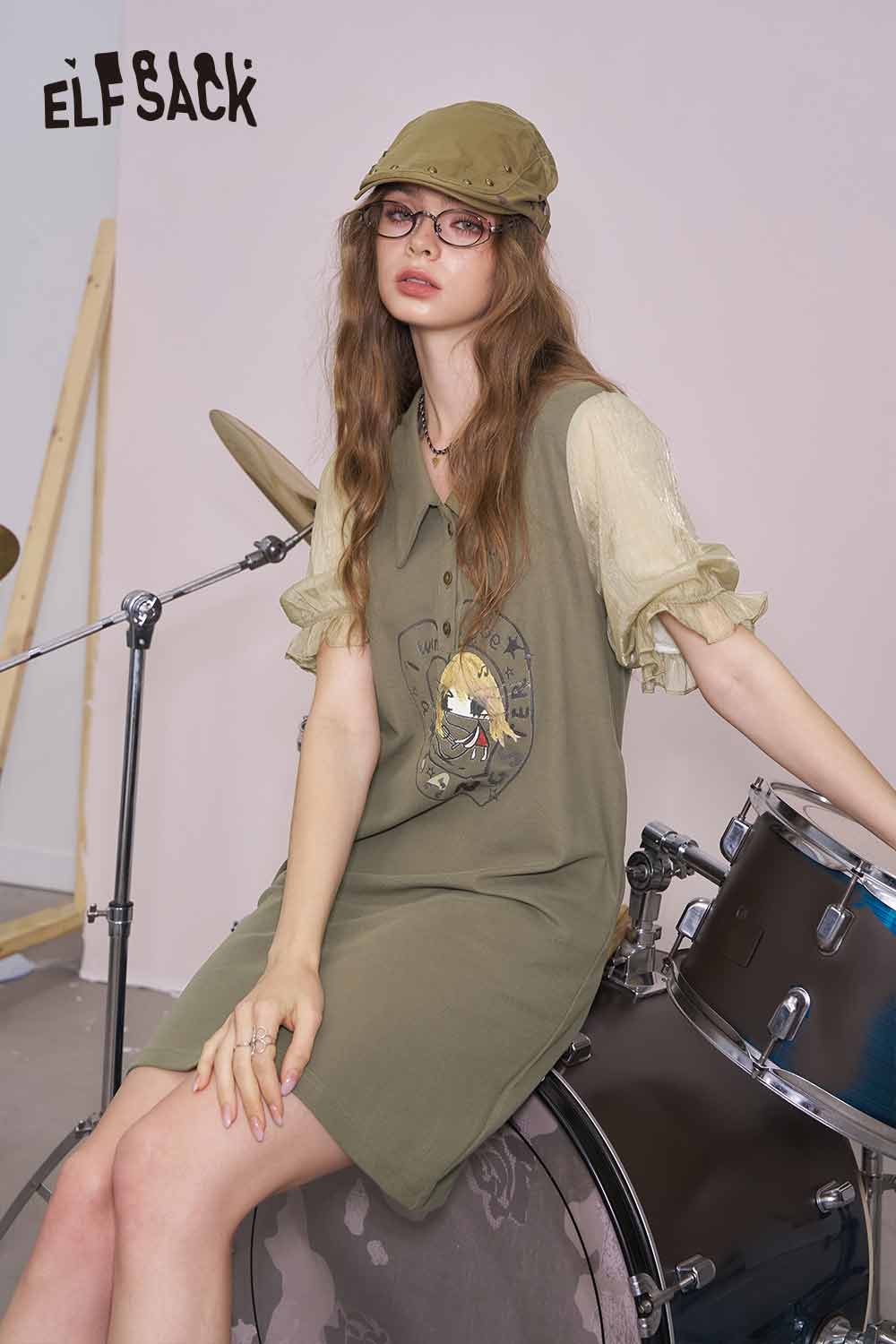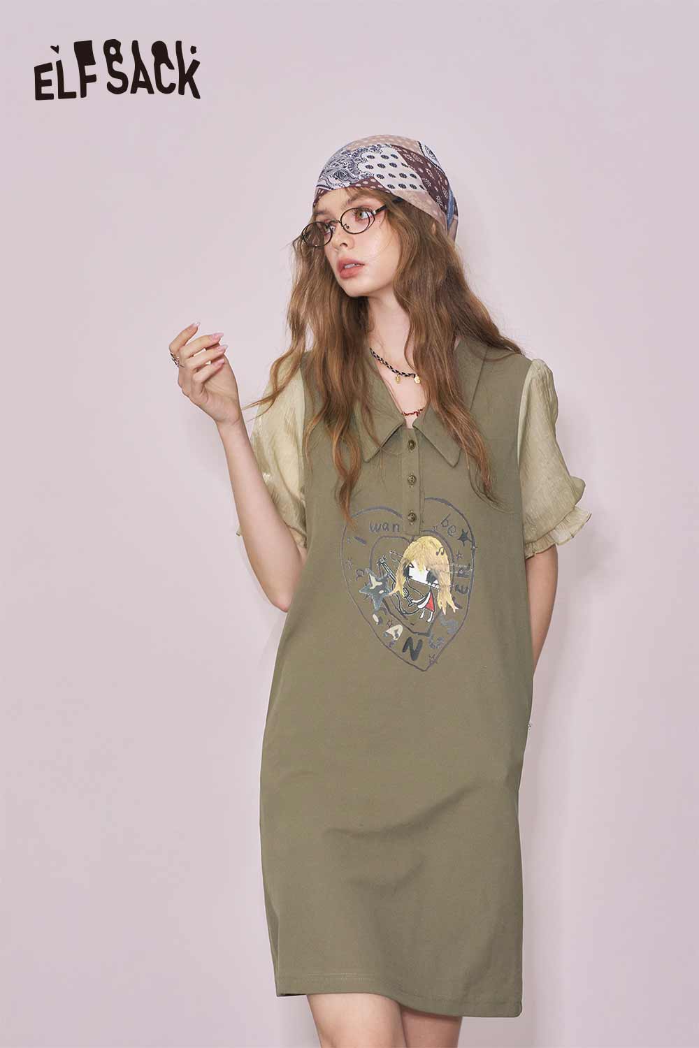 Cotton Polo Collar Original Printed Puff Sleeve Mini T-Shirt Dress
