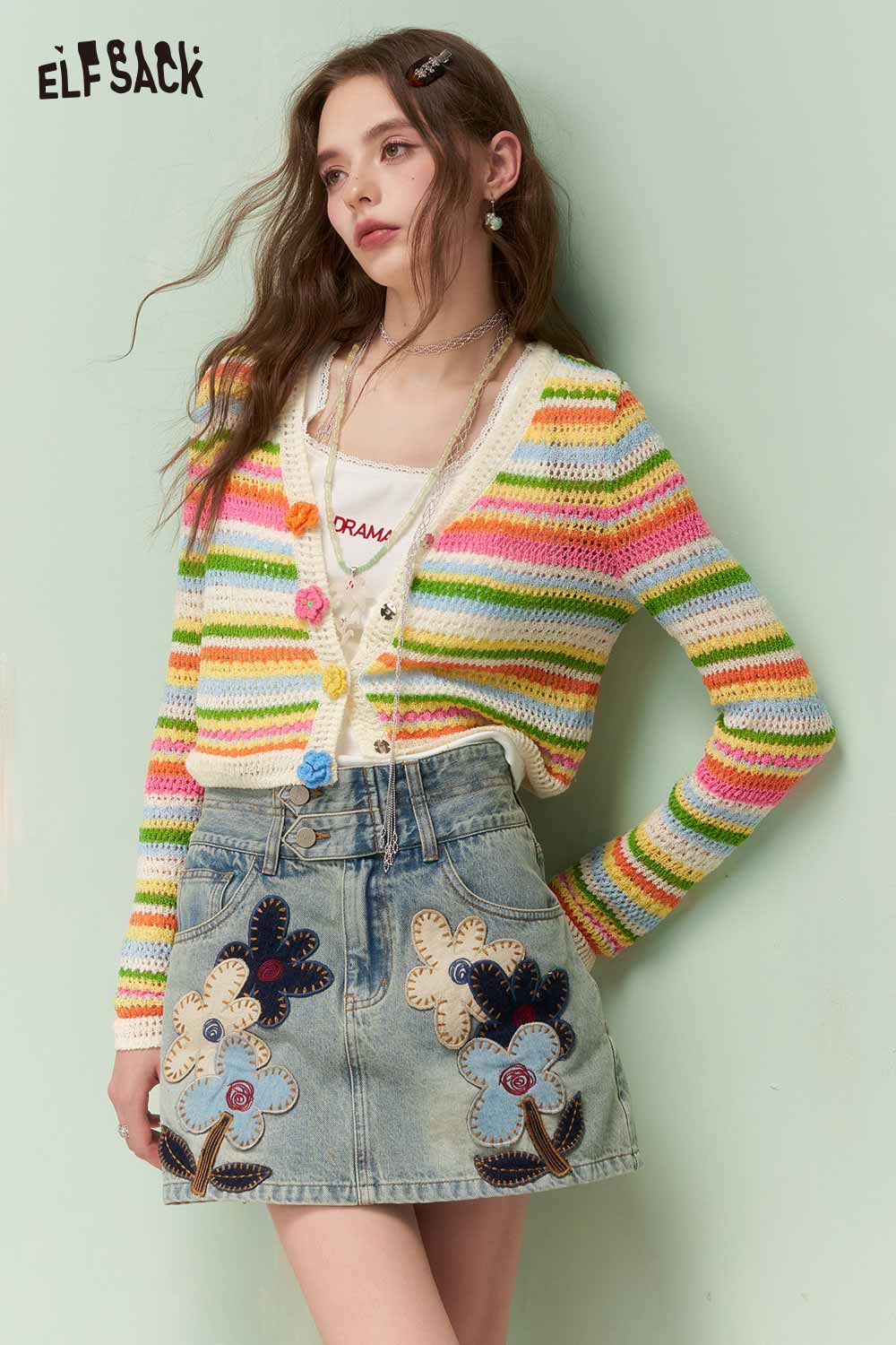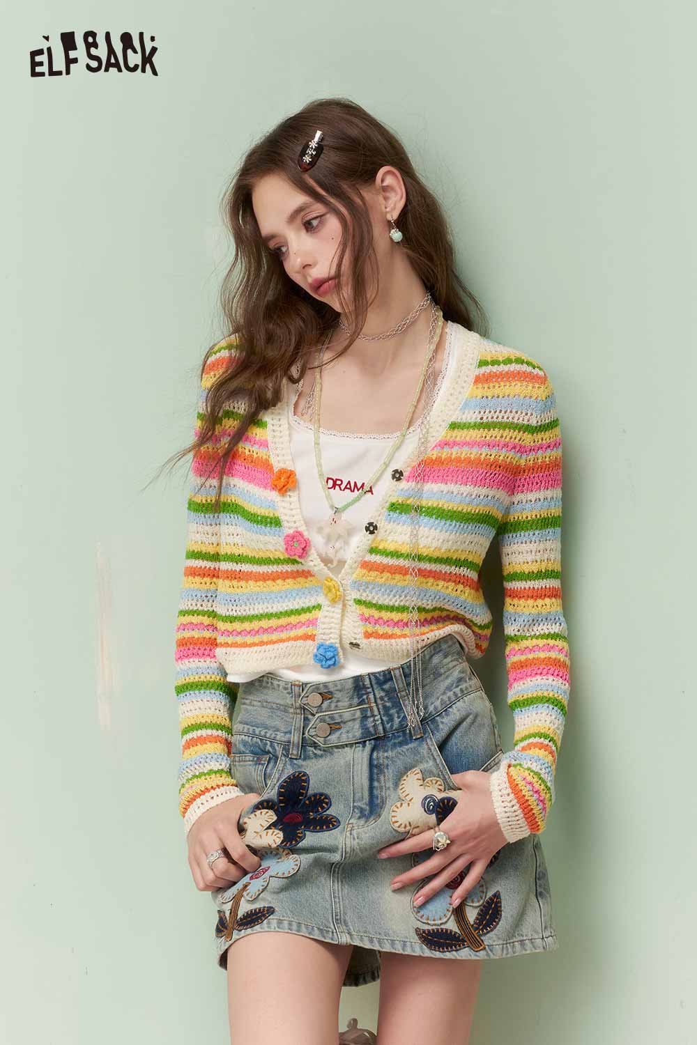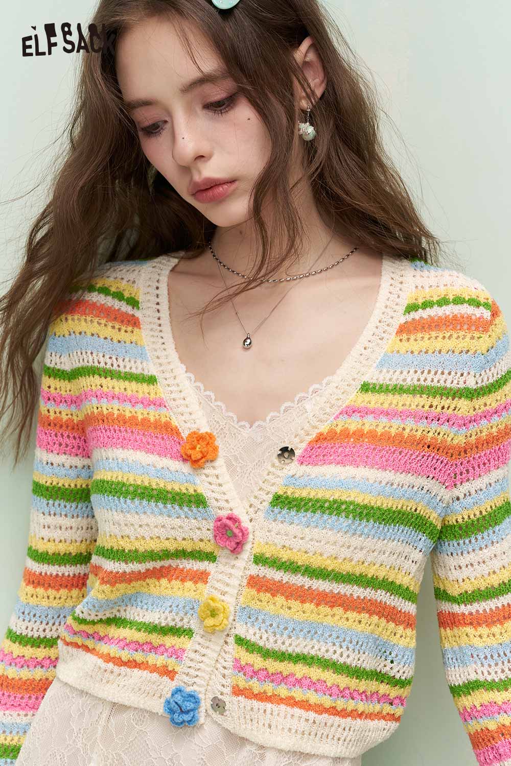 Colorful Knitted Cardigan with Hollow Out & Floral Buttons