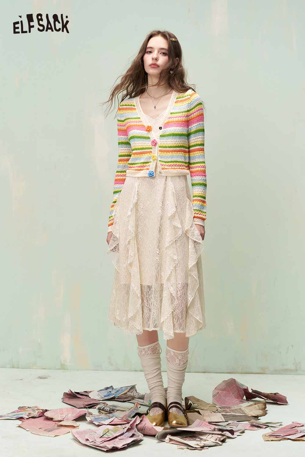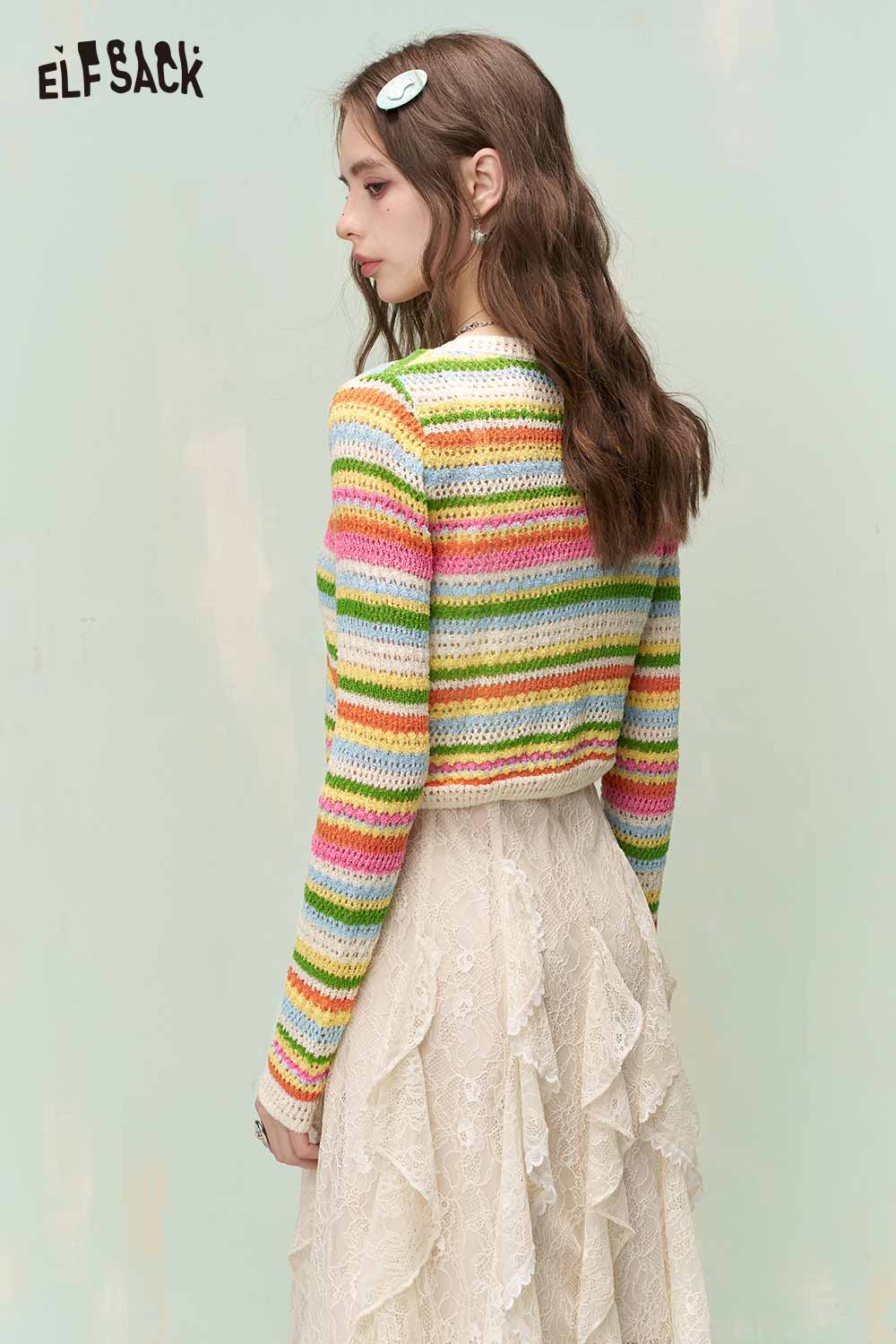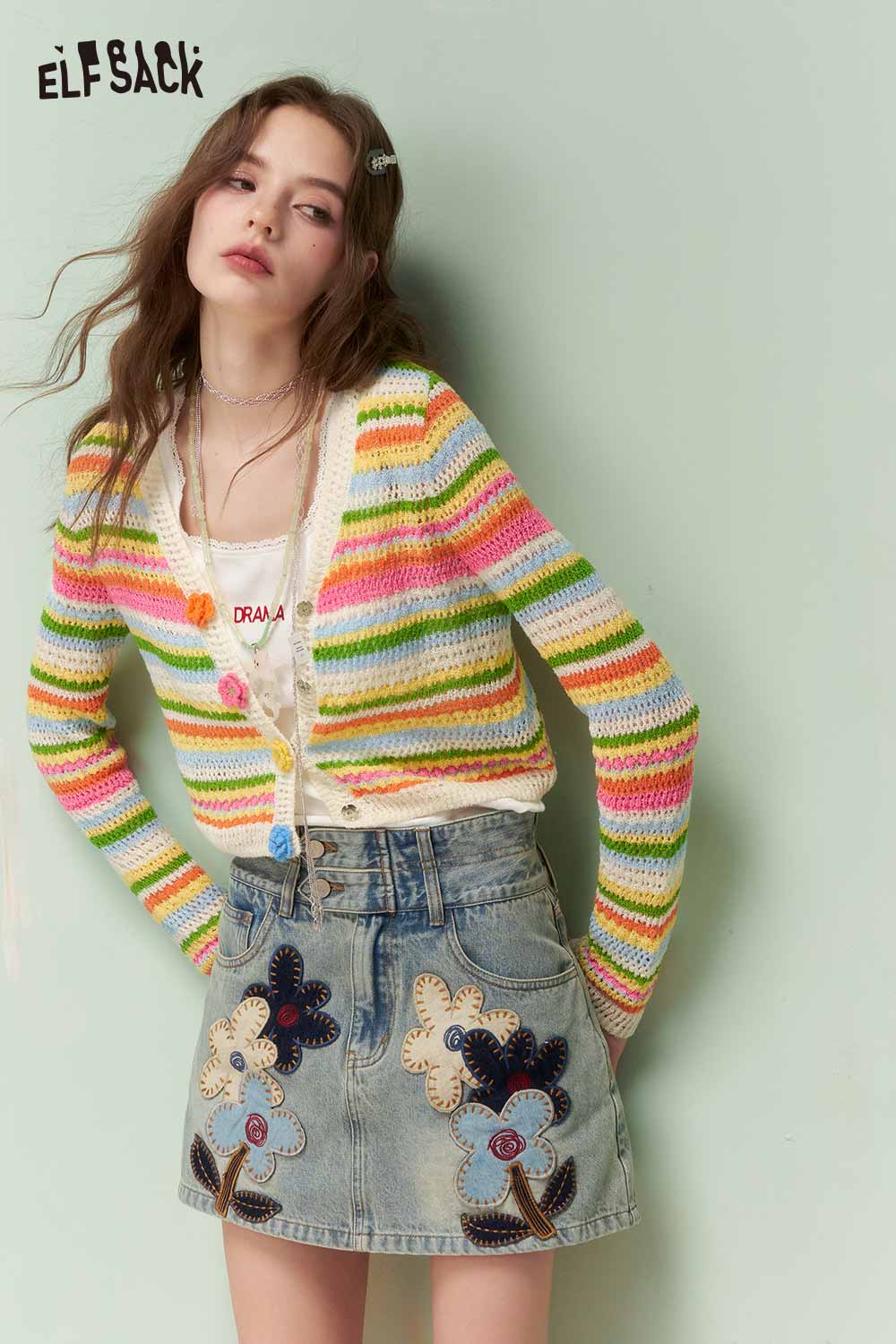 Colorful Knitted Cardigan with Hollow Out & Floral Buttons
