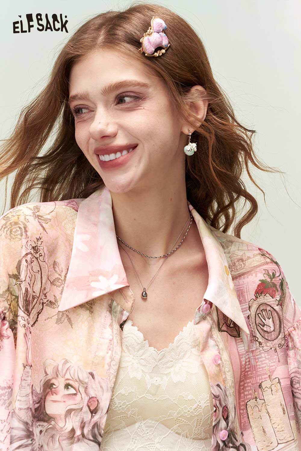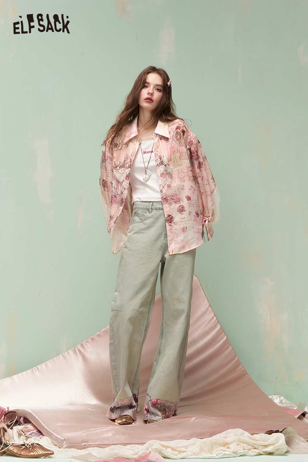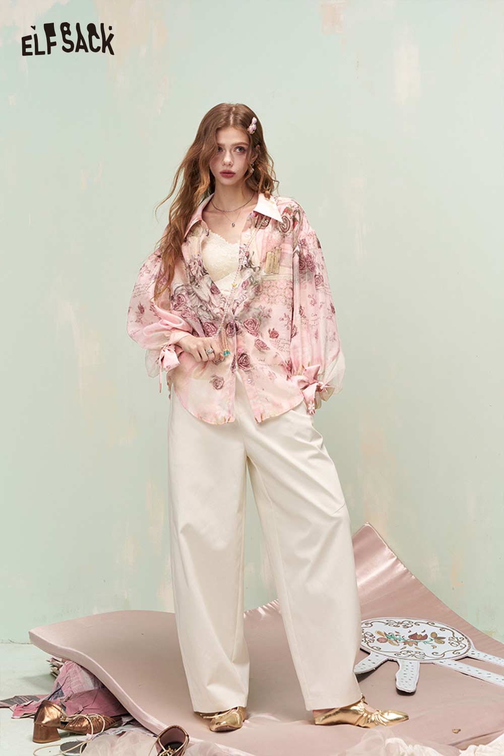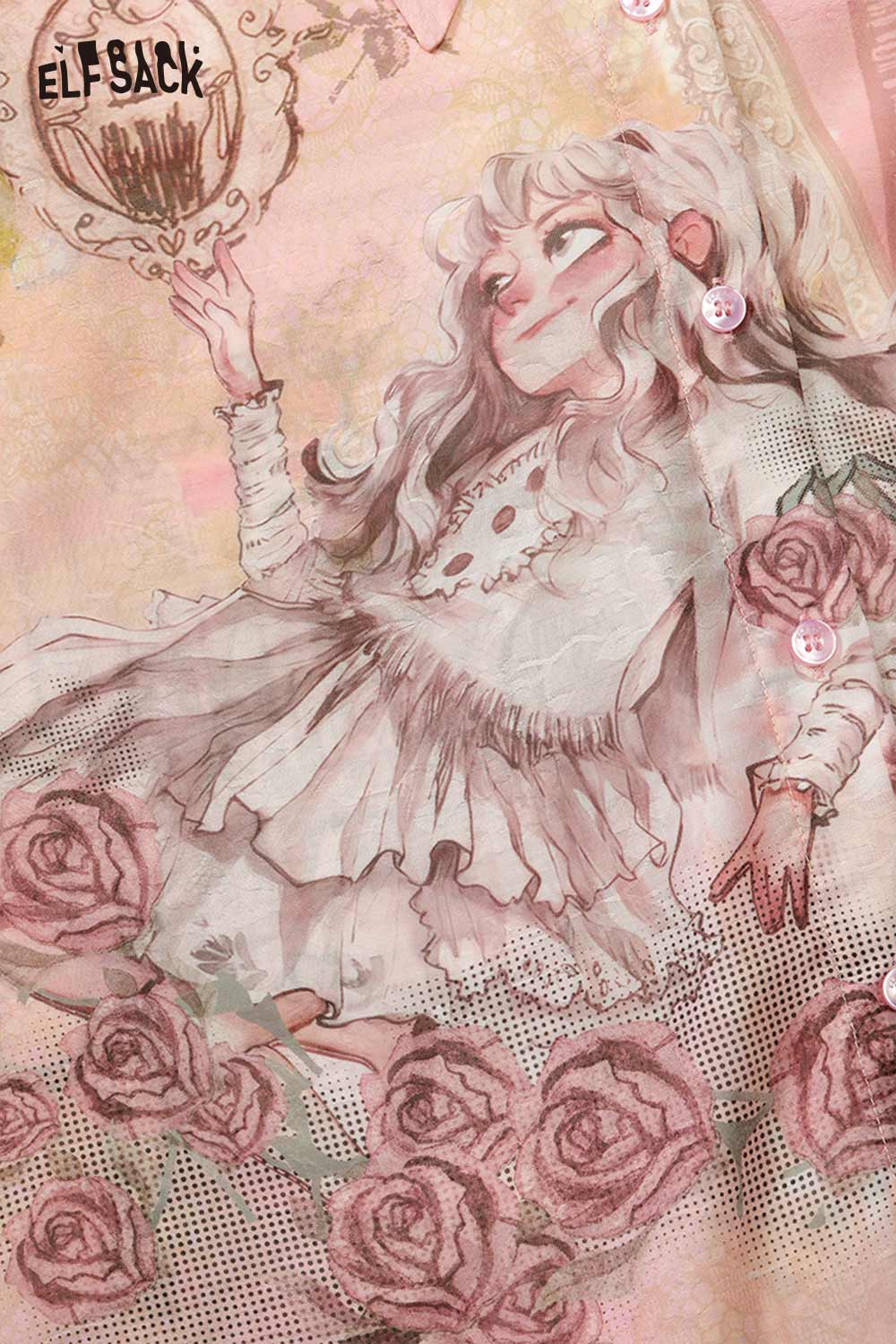 French Vintage Rose Print Mesh Bow Long Sleeve Shirt
