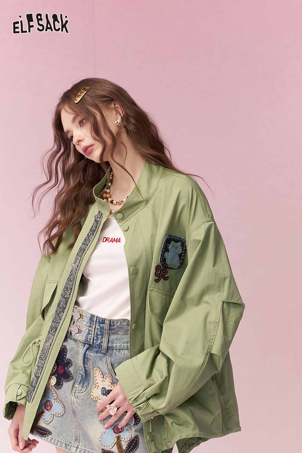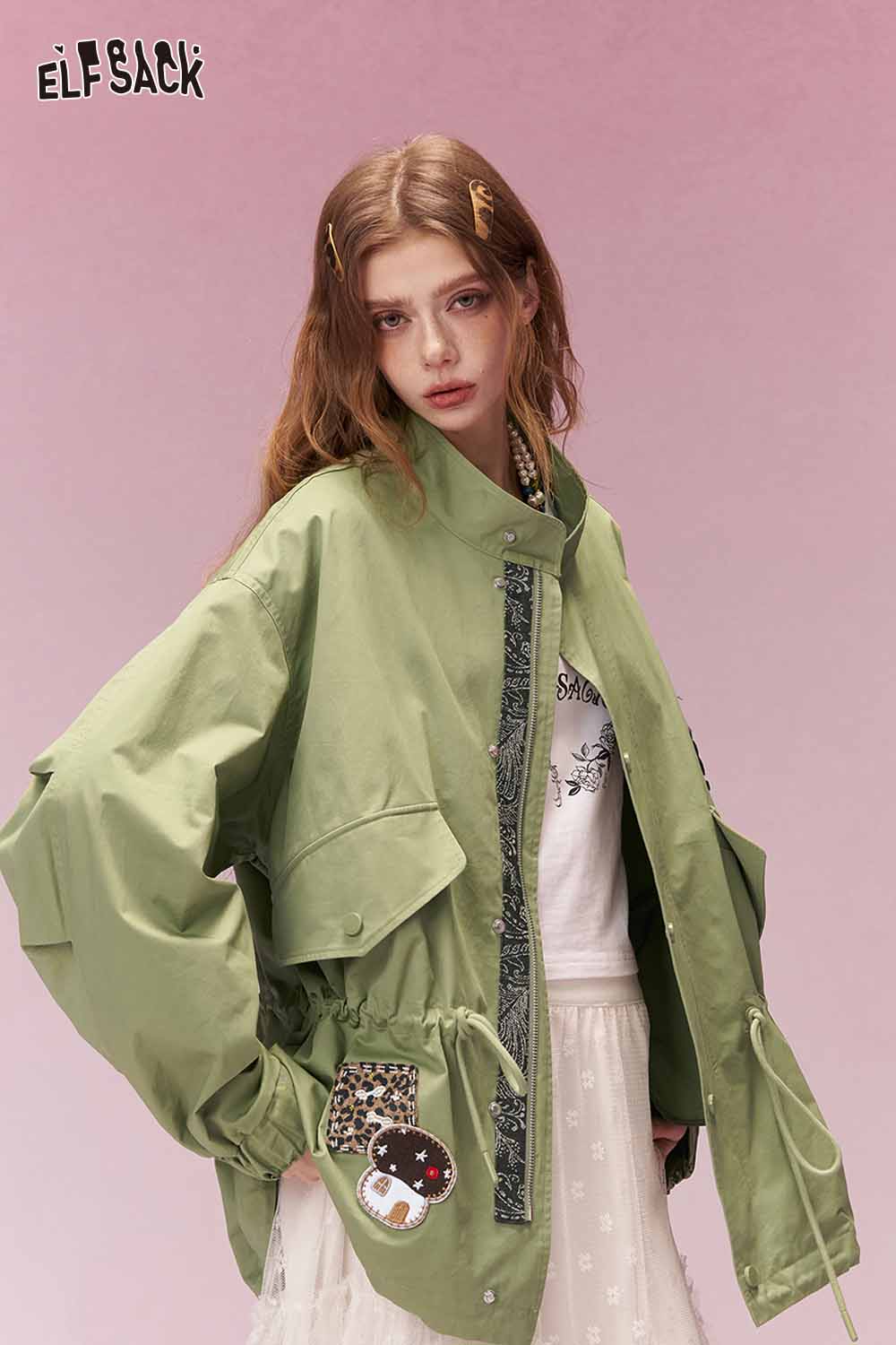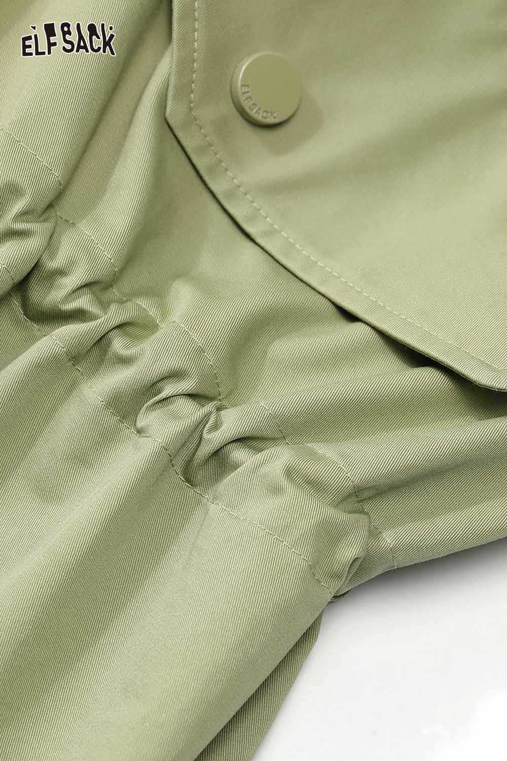 Cargo Army Green Trench Coat with Mixed Material Patchwork