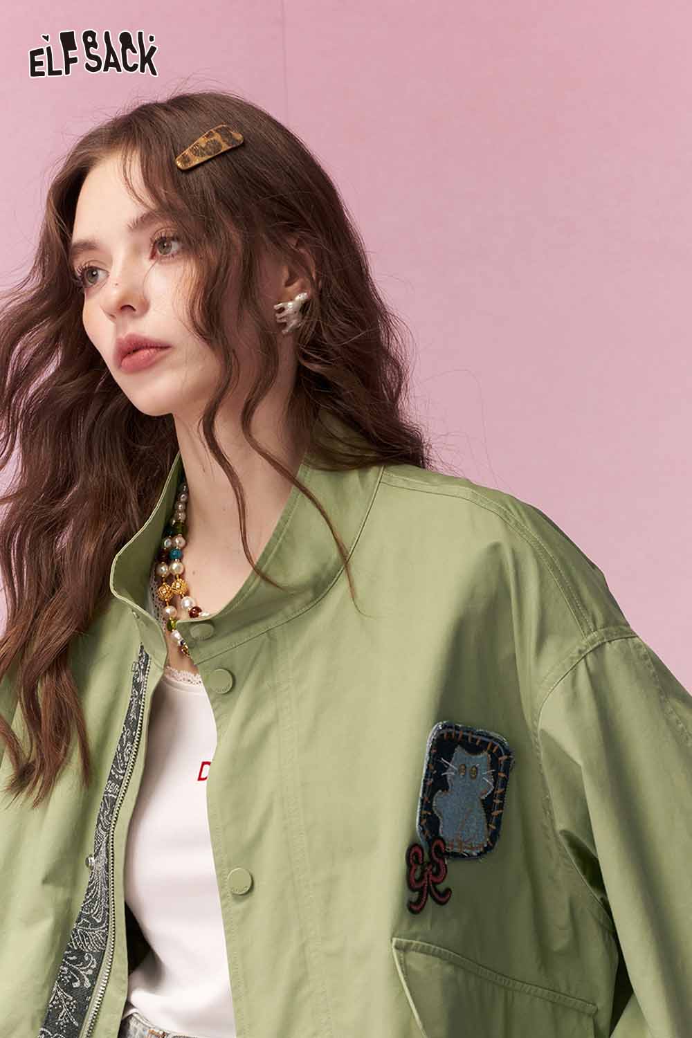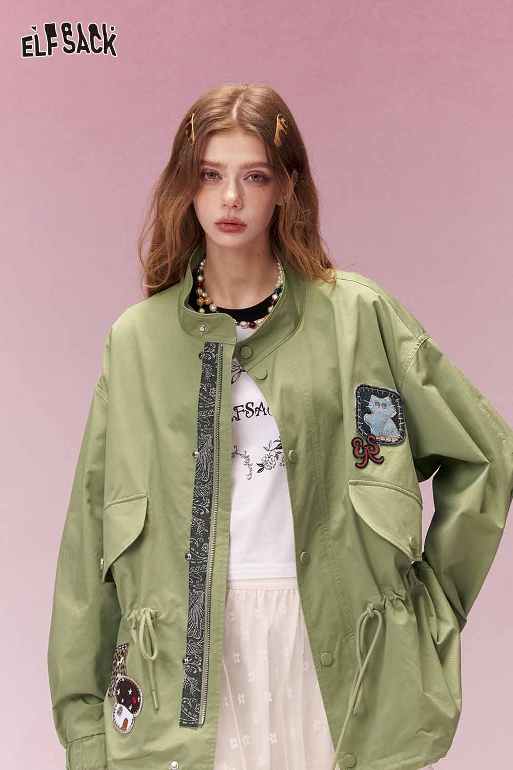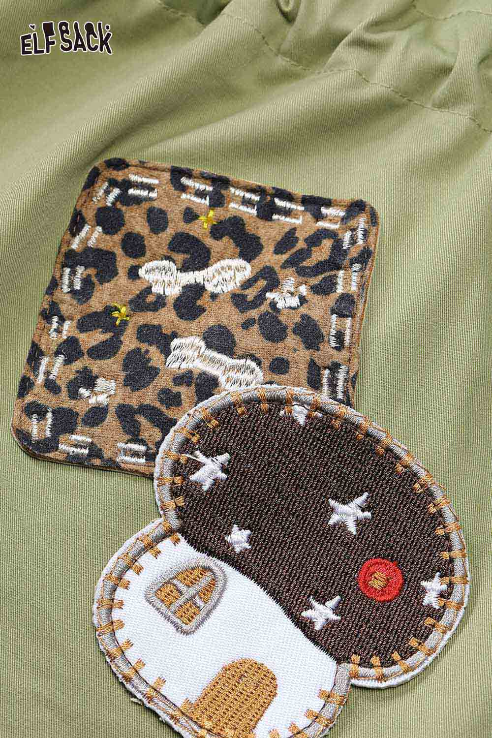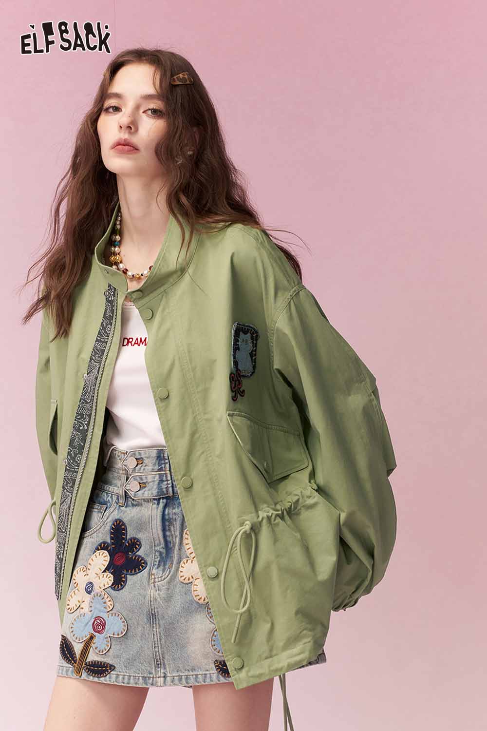 Cargo Army Green Trench Coat with Mixed Material Patchwork