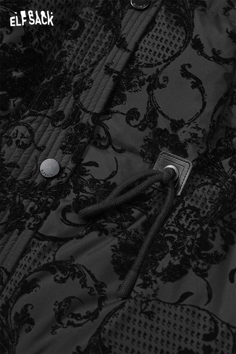 ELFSACK vintage jacquard puffy down coat in black with stylish design, perfect for winter fashion