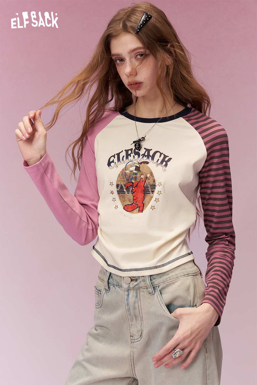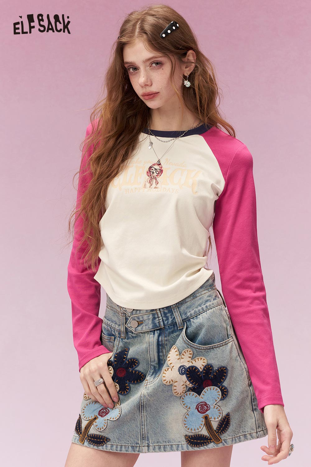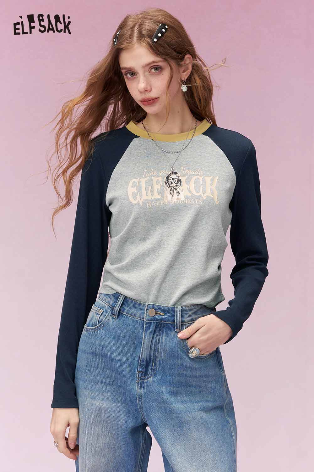 Playful Long Sleeve T Shirt with Contrast Color Patchwork Sleeves