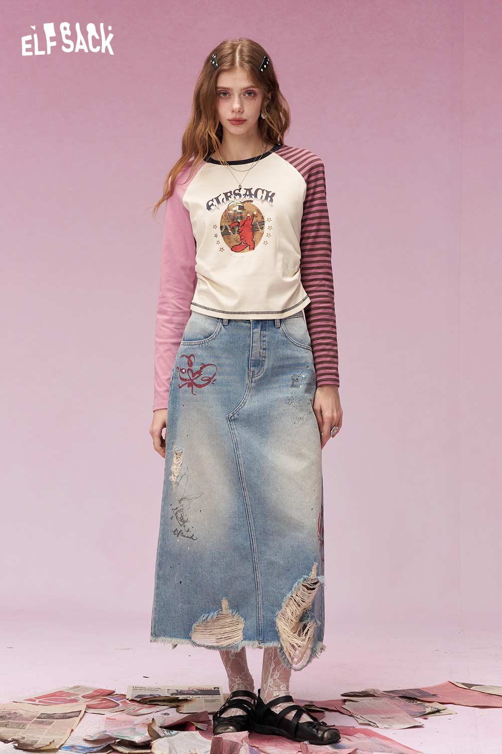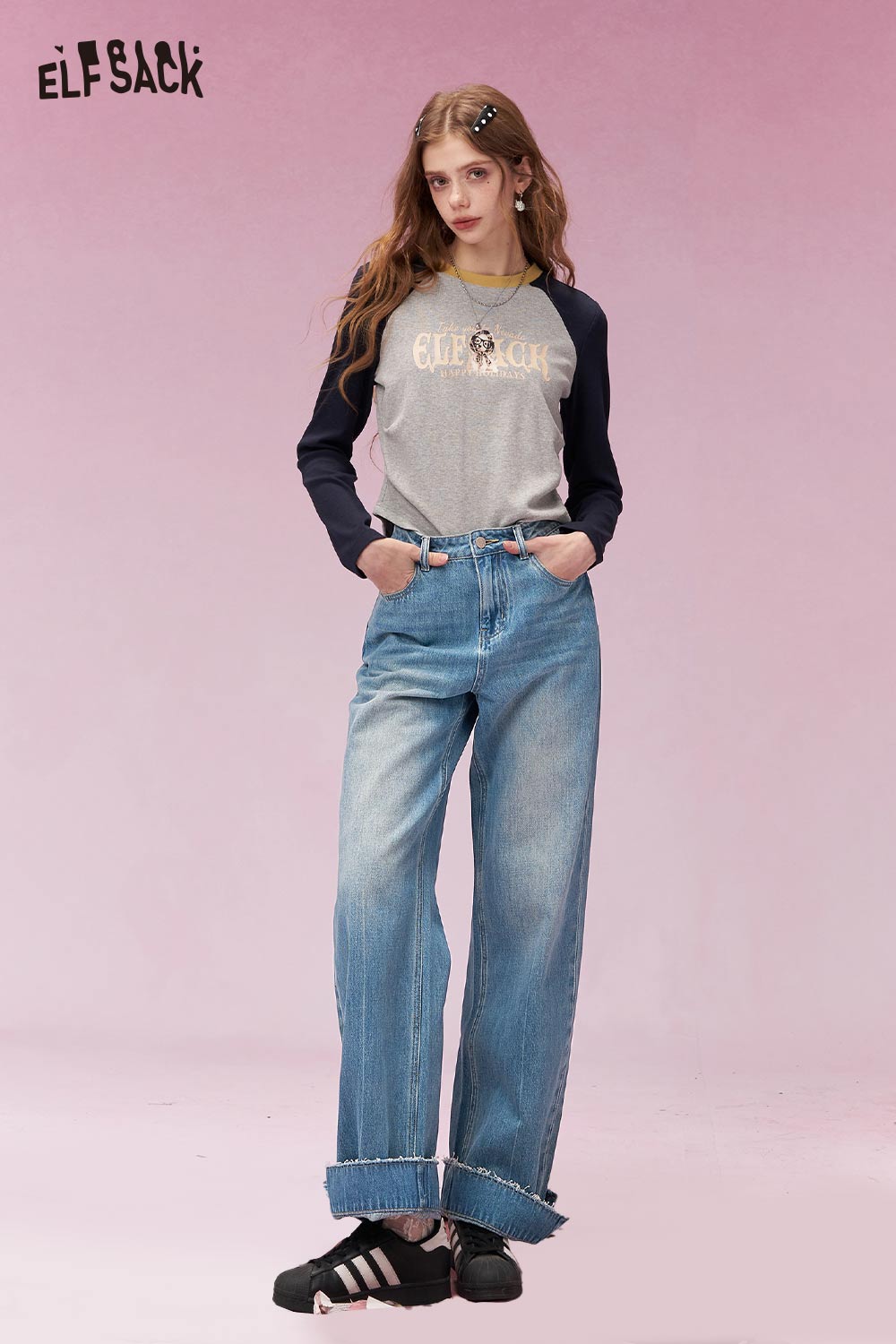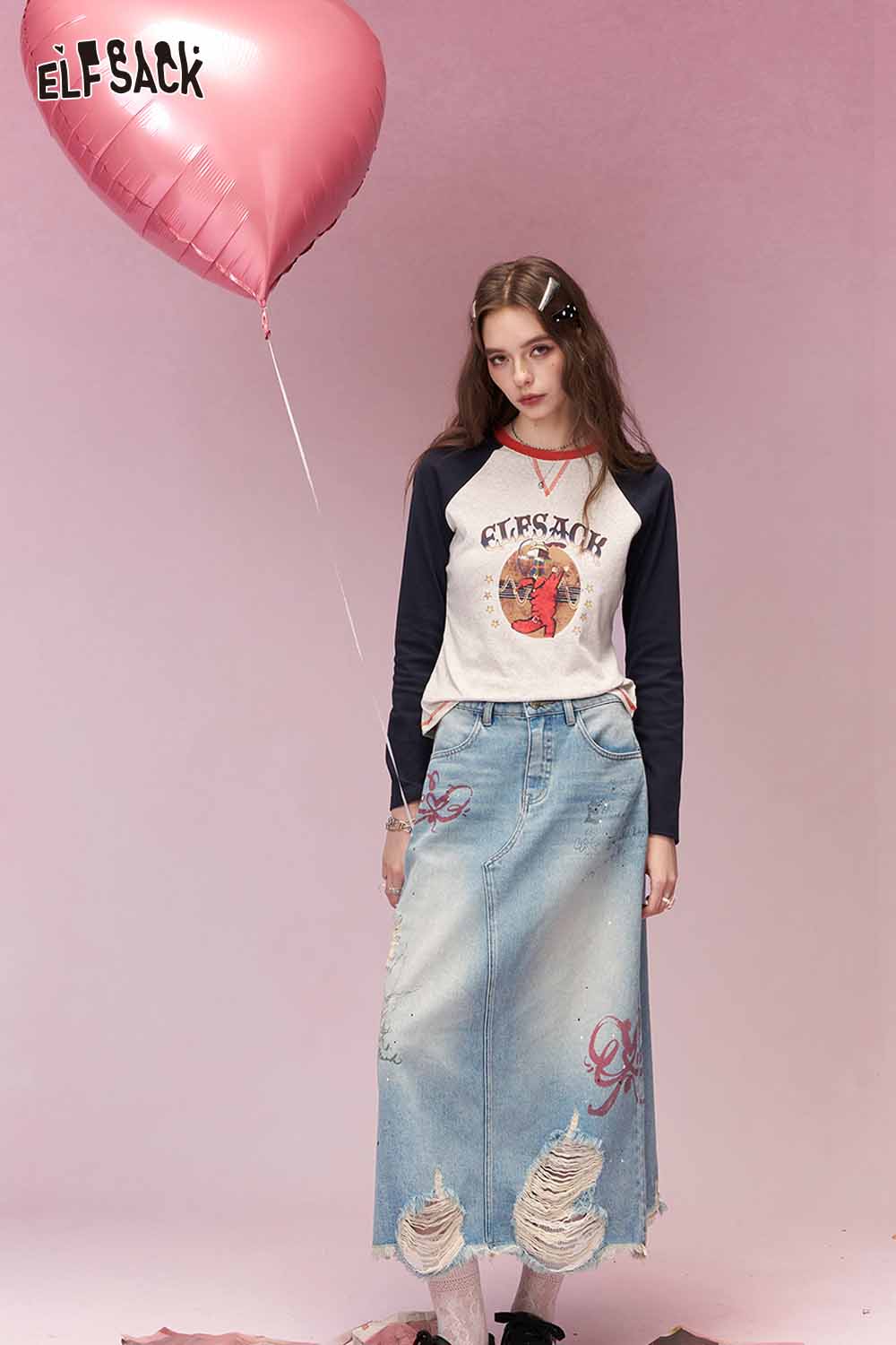 Playful Long Sleeve T Shirt with Contrast Color Patchwork Sleeves