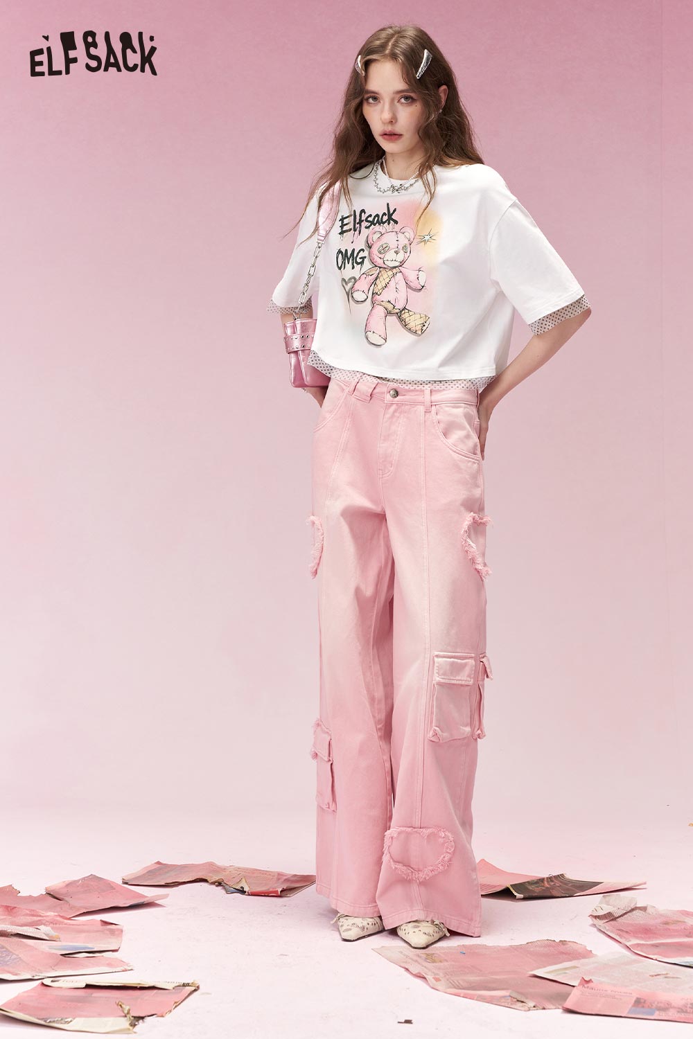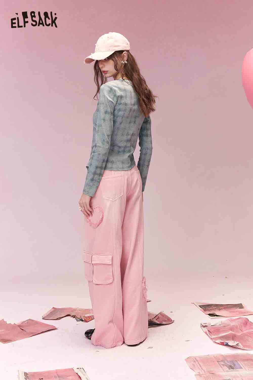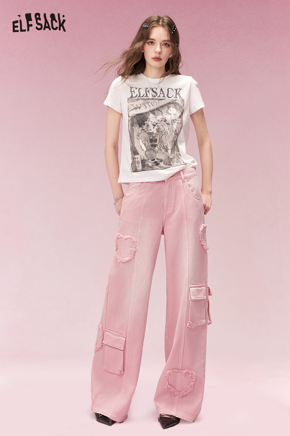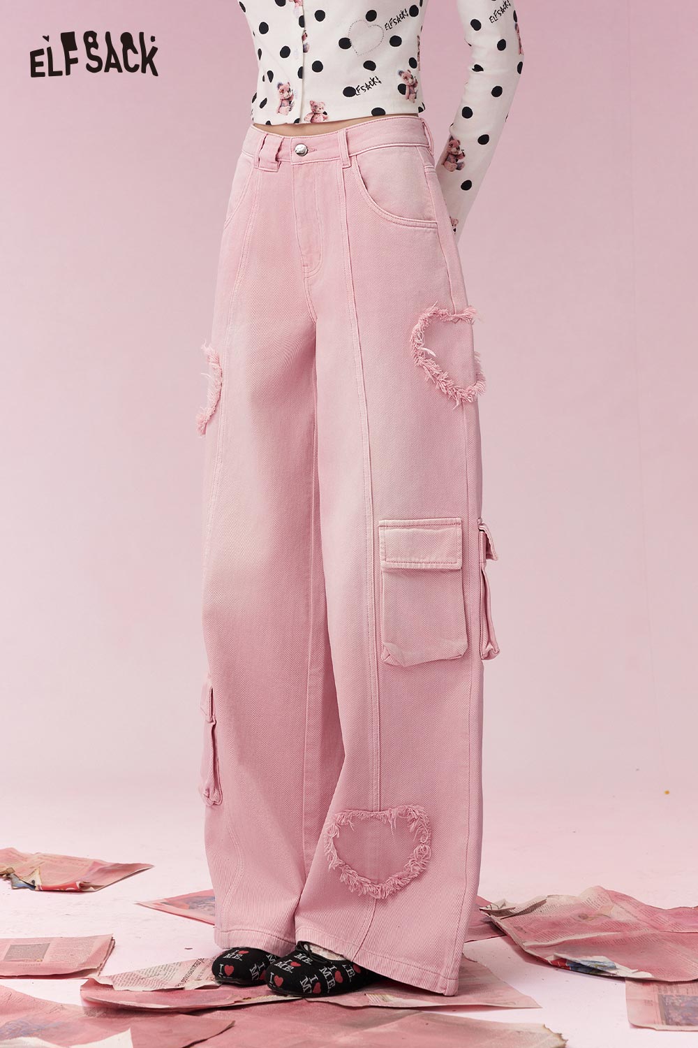 Sweet Cool Heart Distressed Hem Pink Cargo Wide Leg Jeans