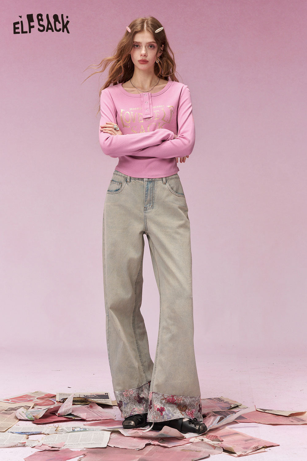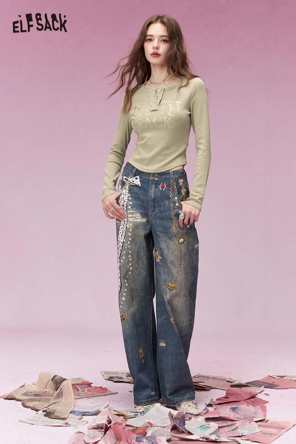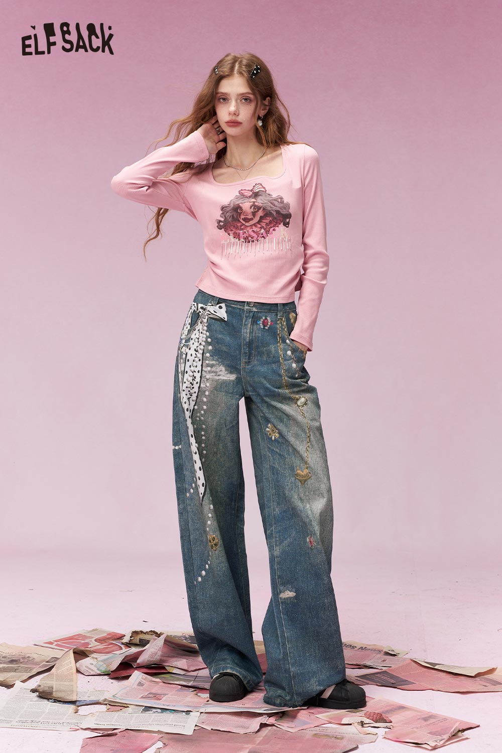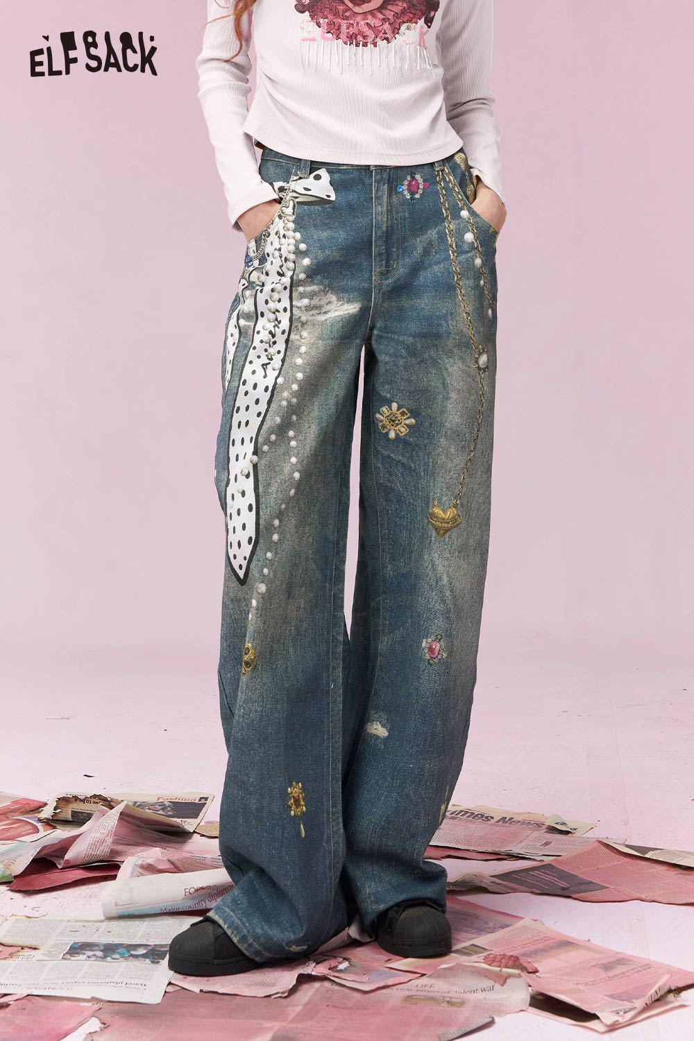 Vintage Heart Chain Bow Print Wide Leg Jeans