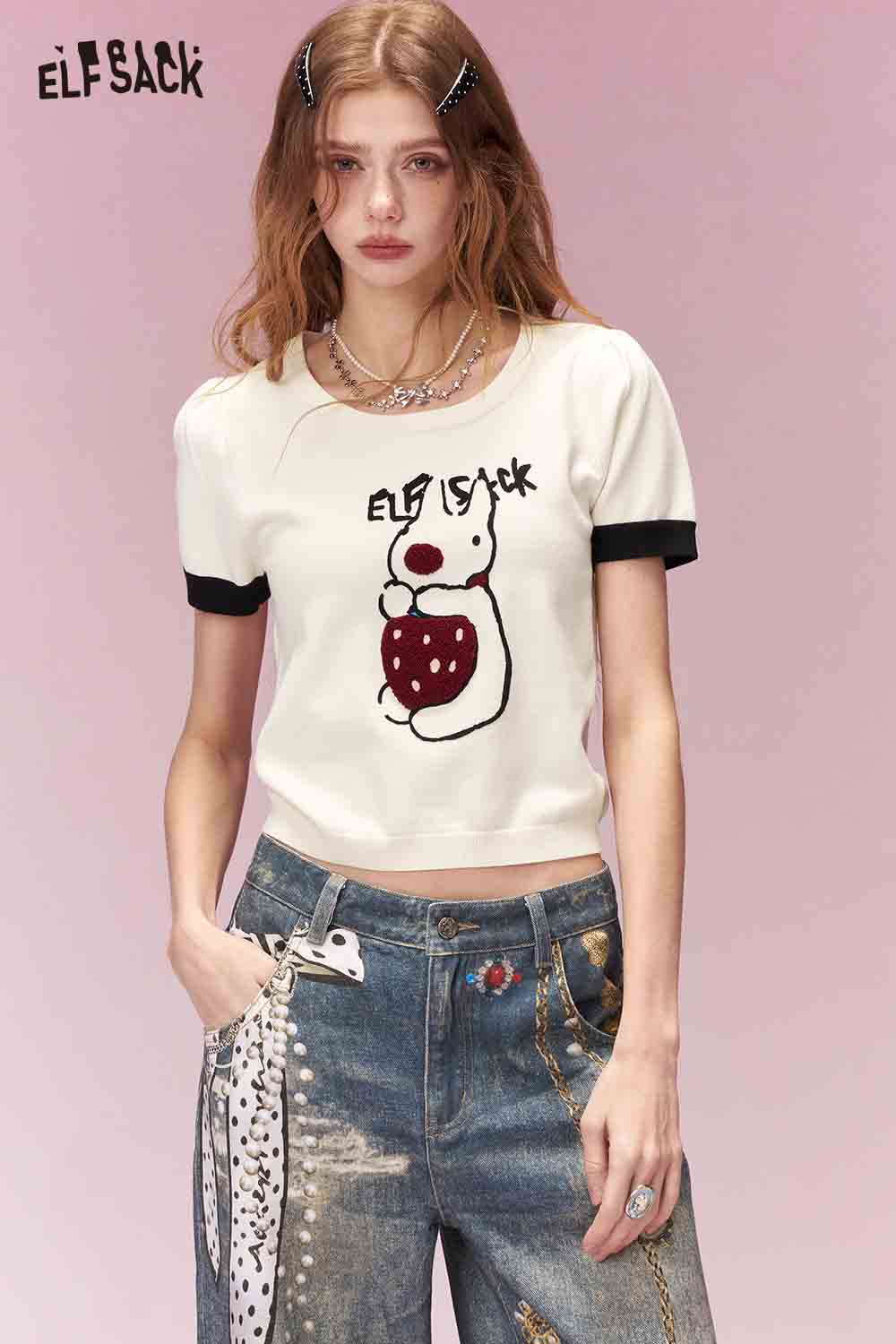 Energetic Girly Strawberry Bunny Print Short Sleeve Knit Top
