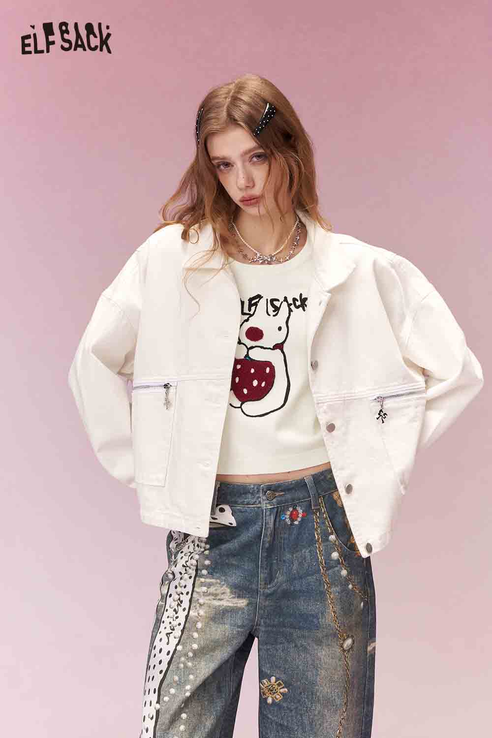 Soft Retro Graphic Plush Cuff V Neck Jacket