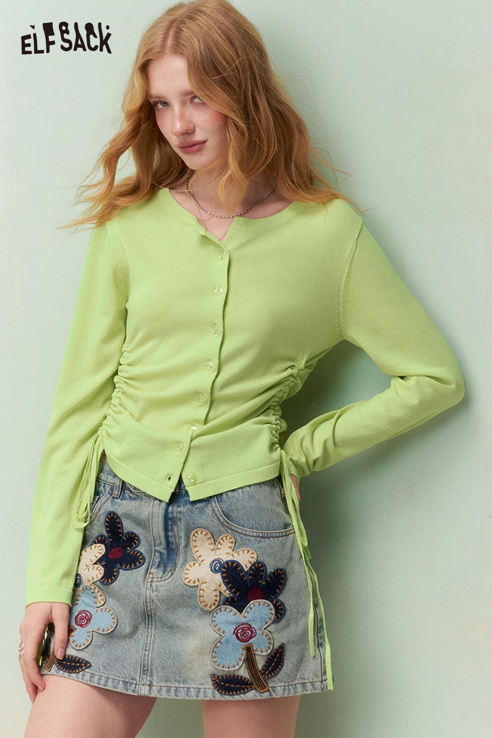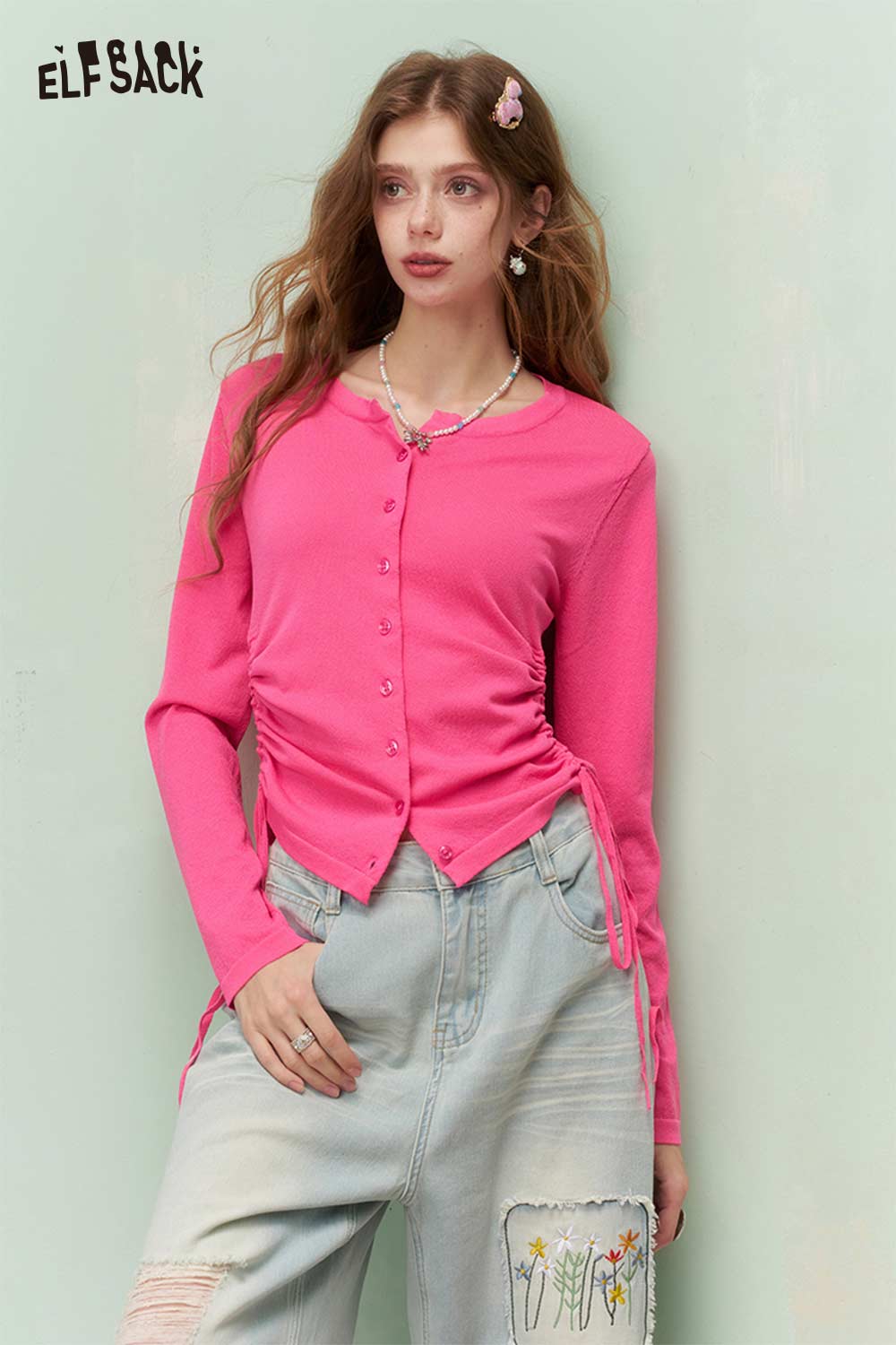 Fresh Girly Drawstring Waist Round Neck Fitted Knit Cardigan