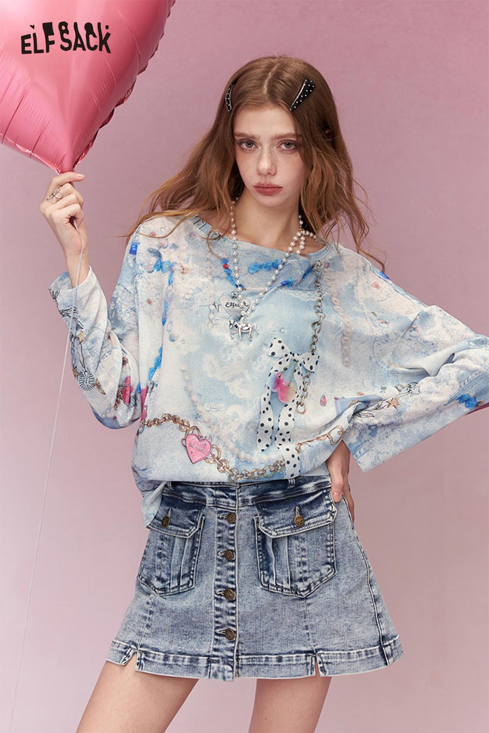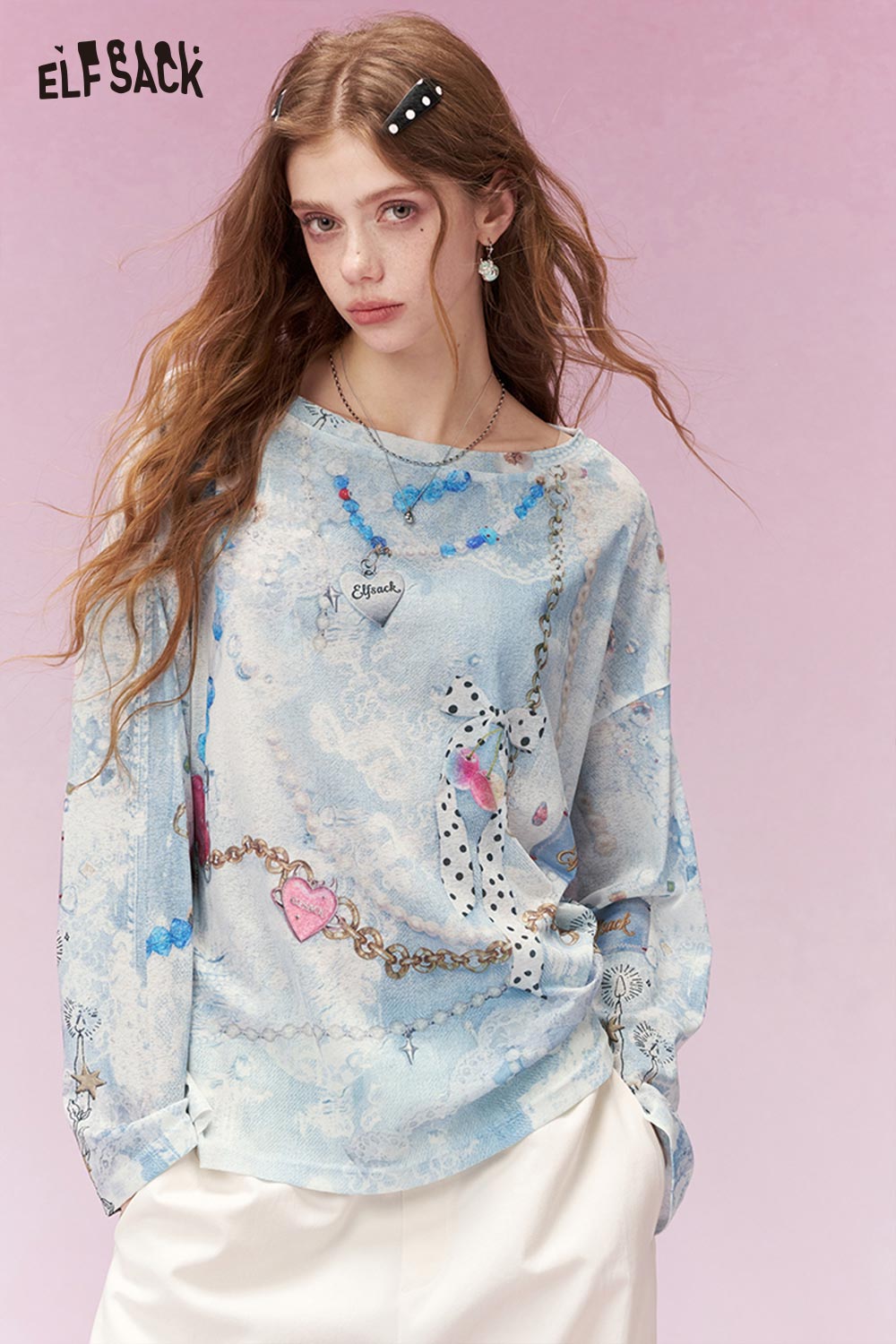 Sweet Chain Heart Print Light Blue Off Shoulder Knit Top