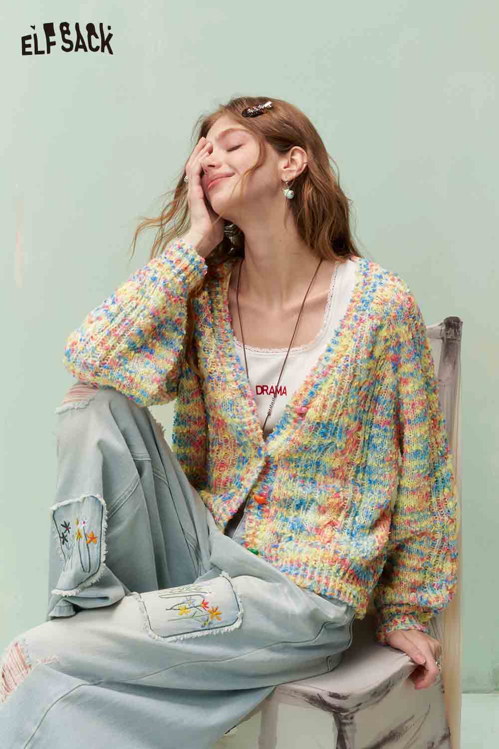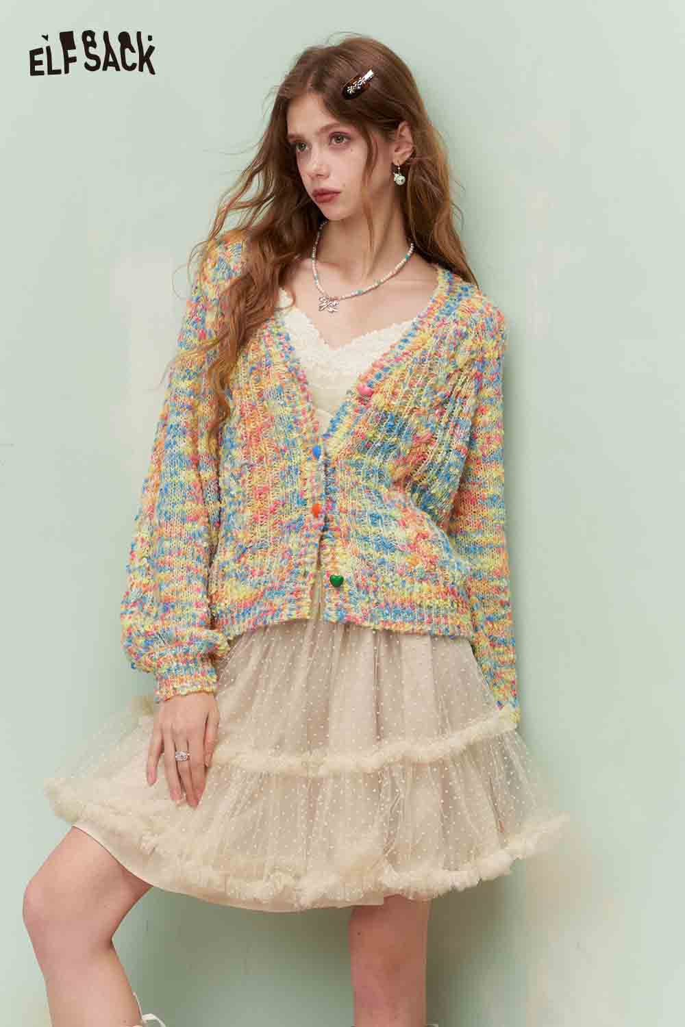 Sweet Color Melange Puff Sleeve Cropped Knit Cardigan