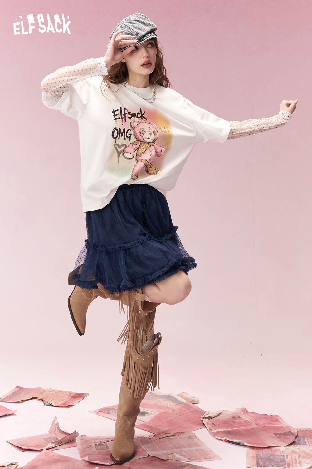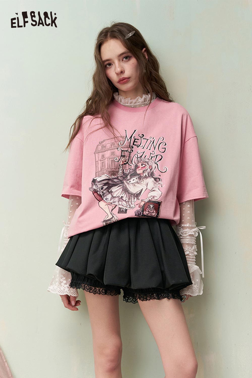 Sweet Cool Bear Print Polka Dot Lace Long Sleeve T-Shirt