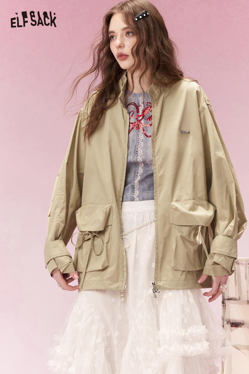 Soft Waist Cinch Bow Figure Patchwork Loose Hooded Jacket