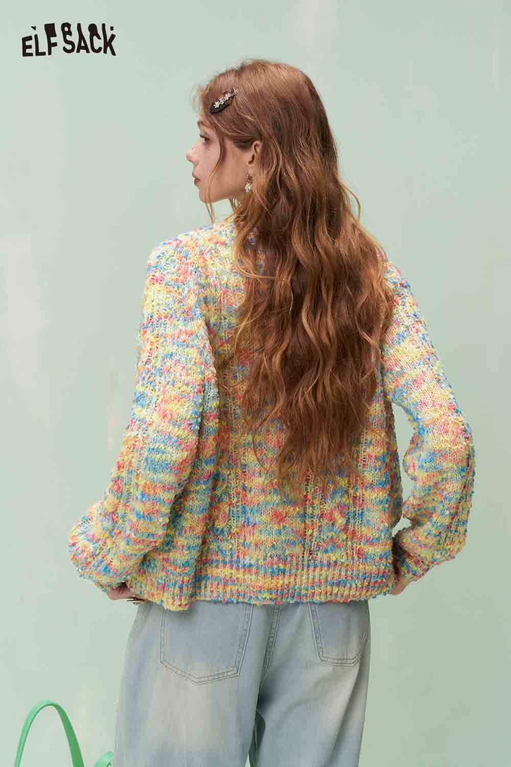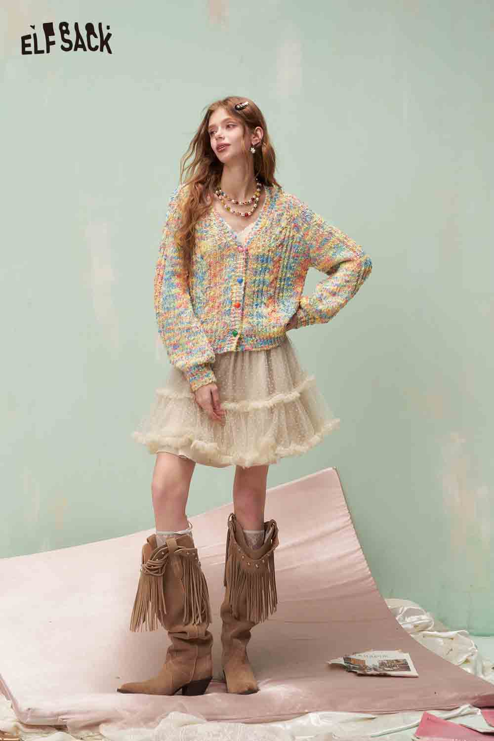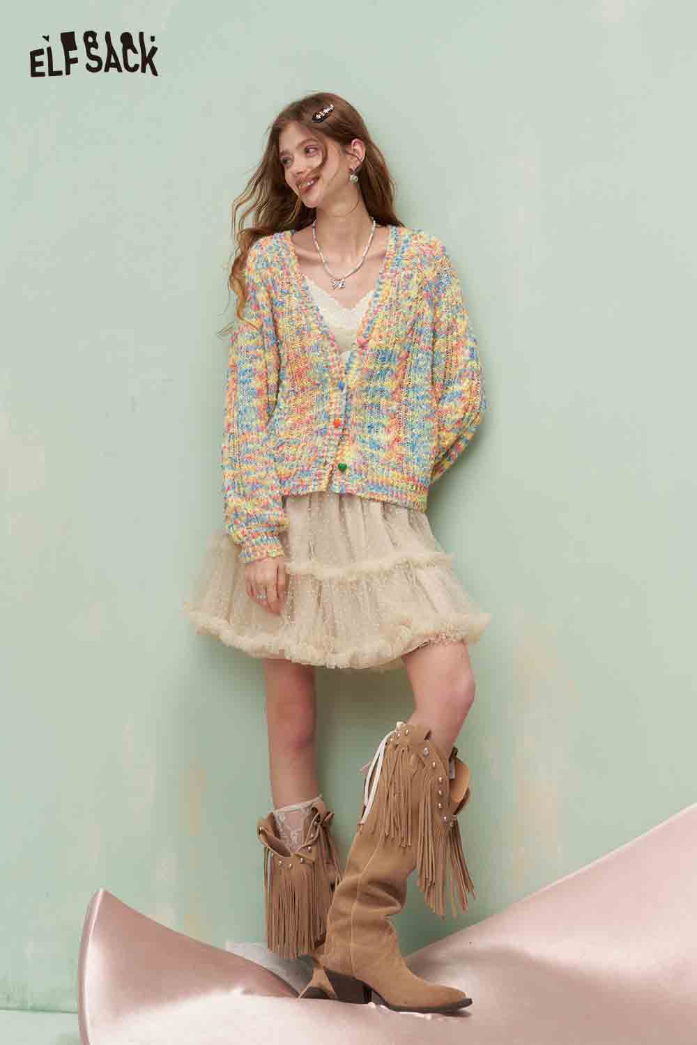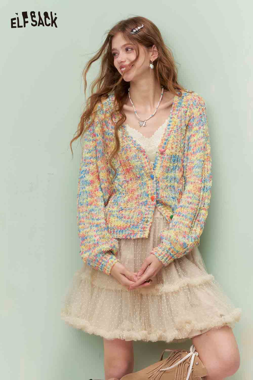 Sweet Color Melange Puff Sleeve Cropped Knit Cardigan