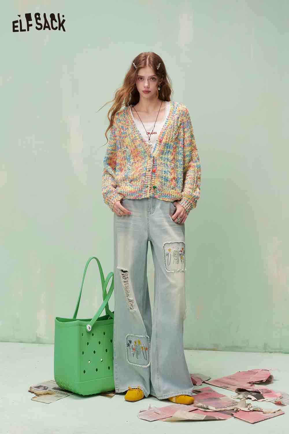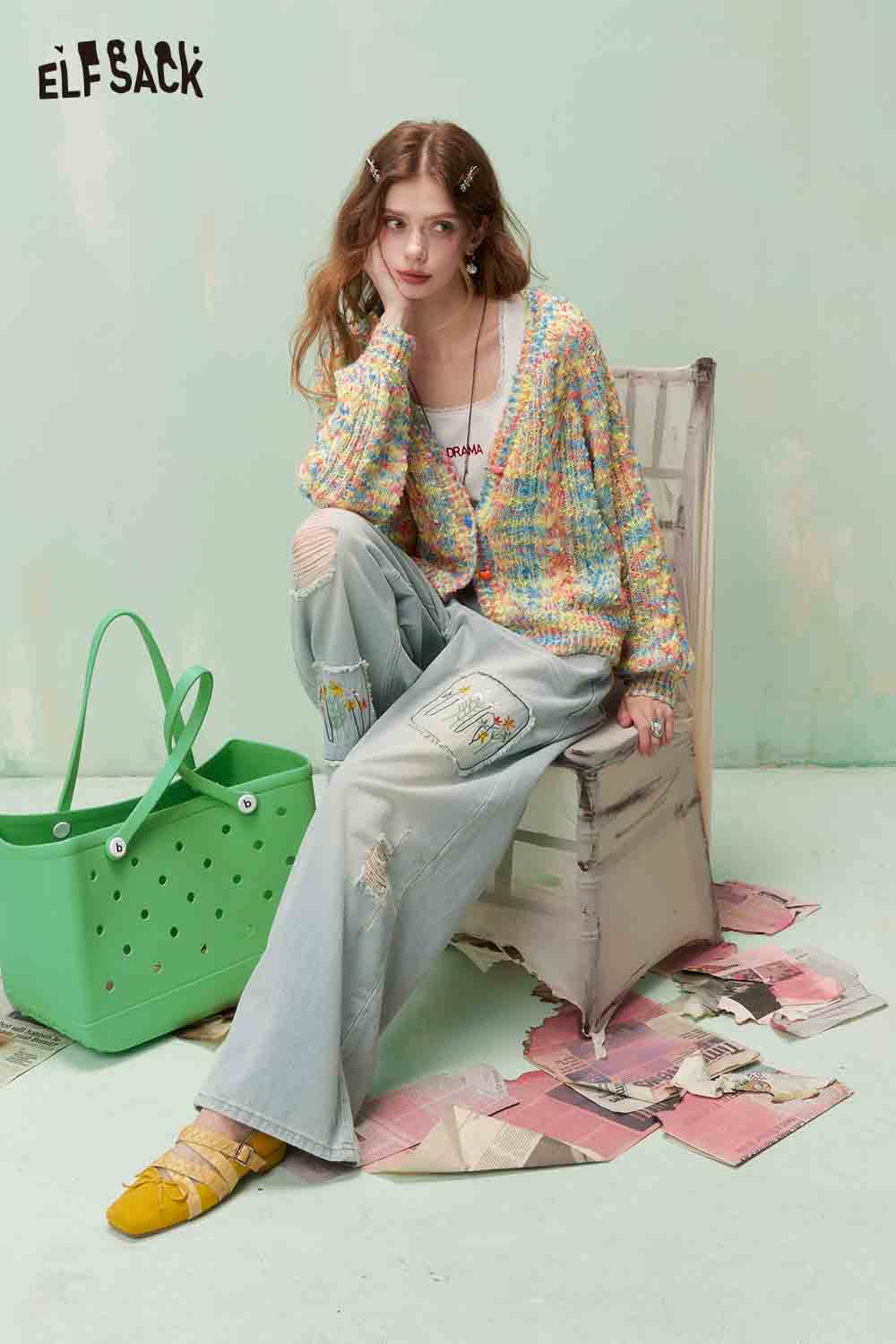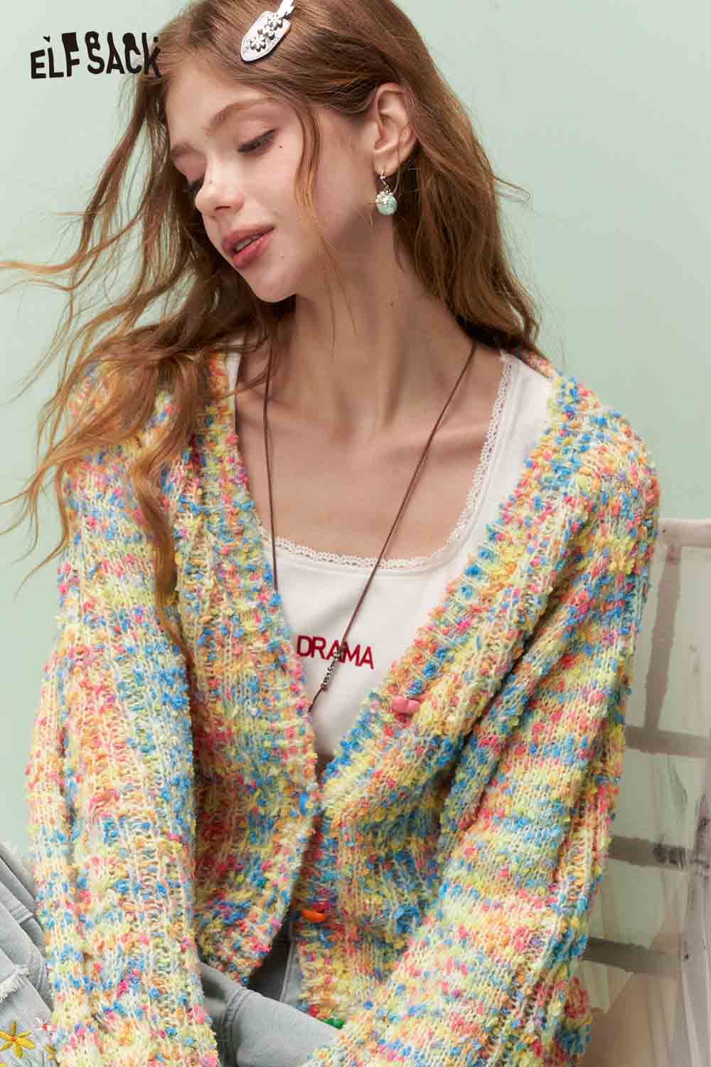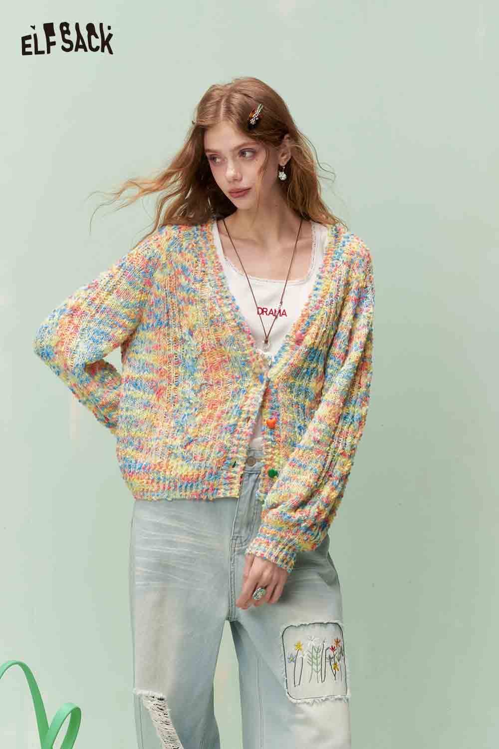 Sweet Color Melange Puff Sleeve Cropped Knit Cardigan