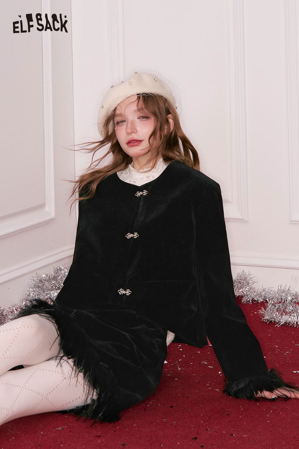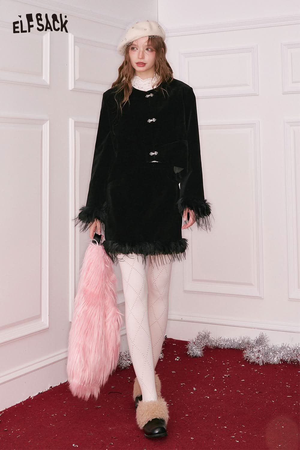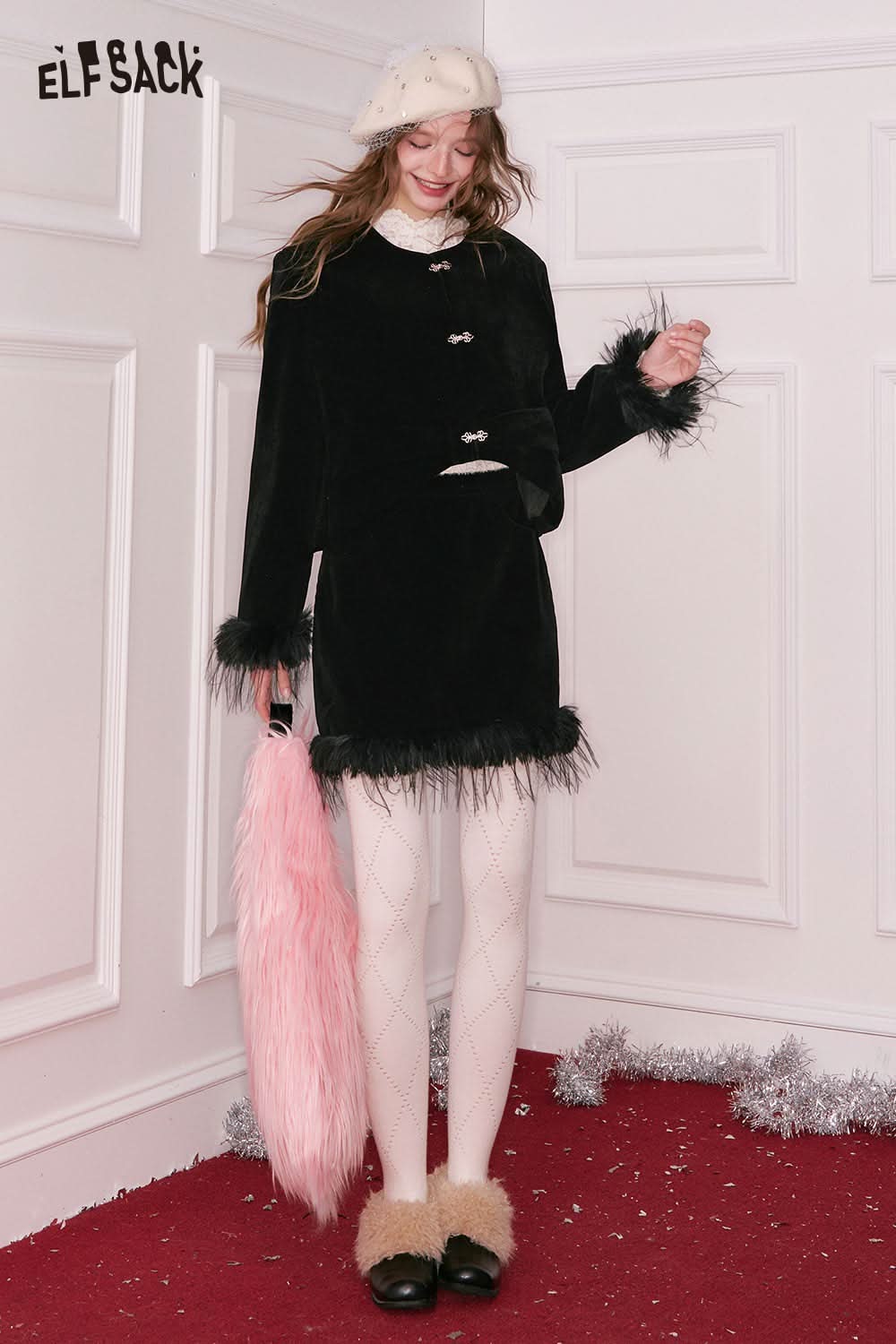 Elegant Button Plush Cuff Jacket Fringe Hem Short Skirt Set