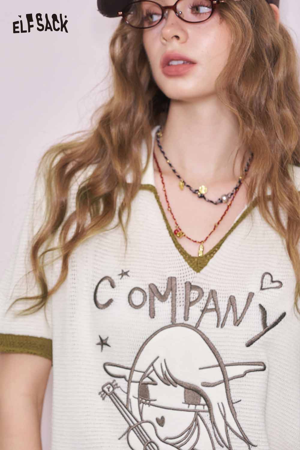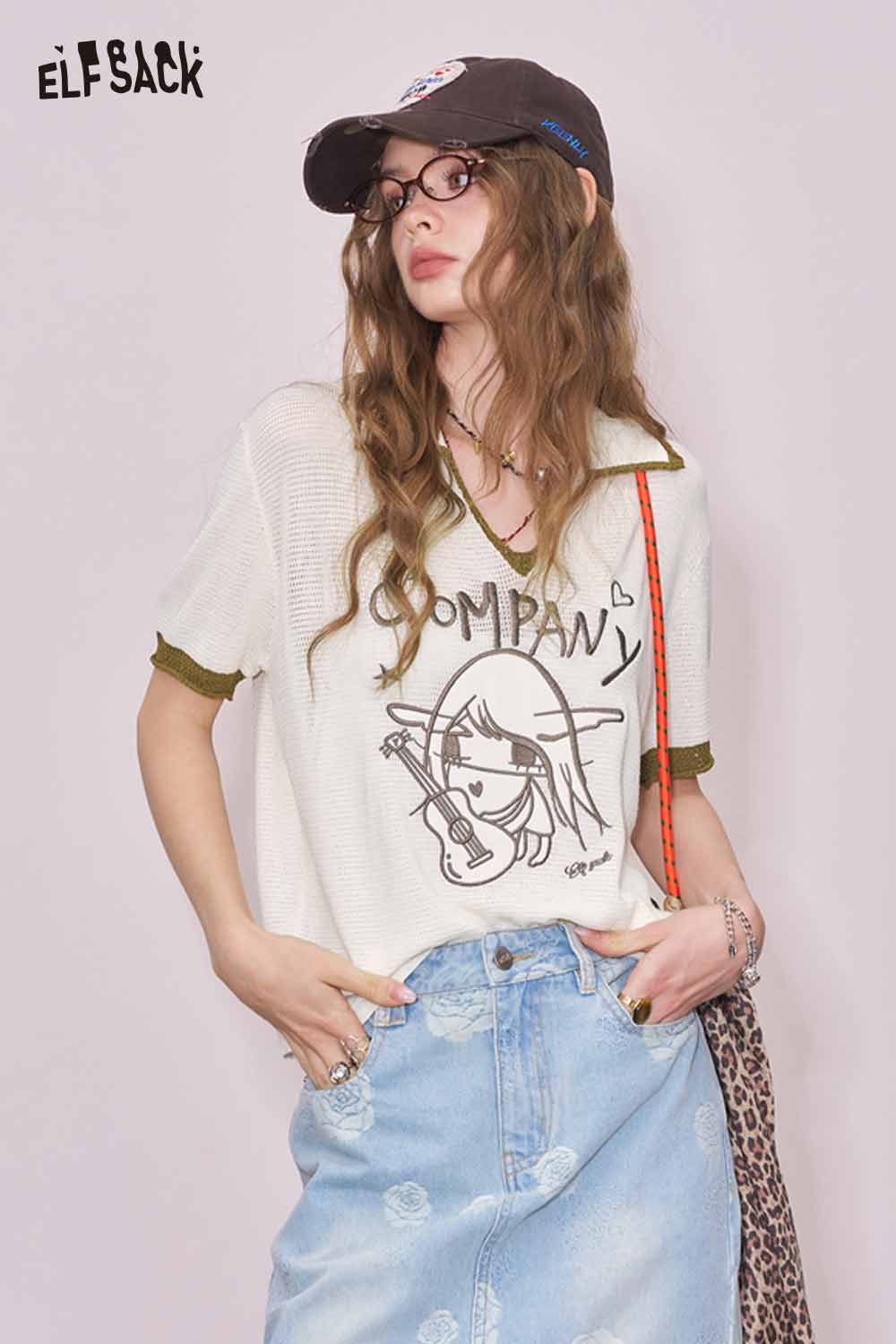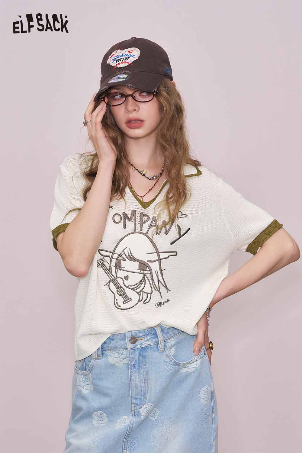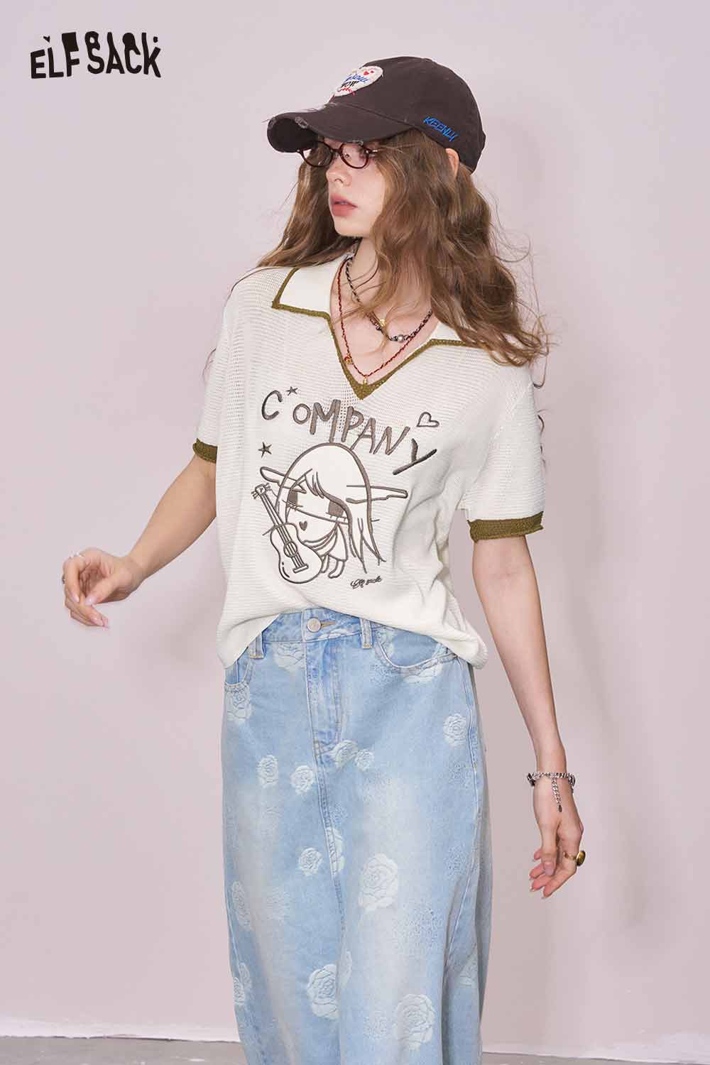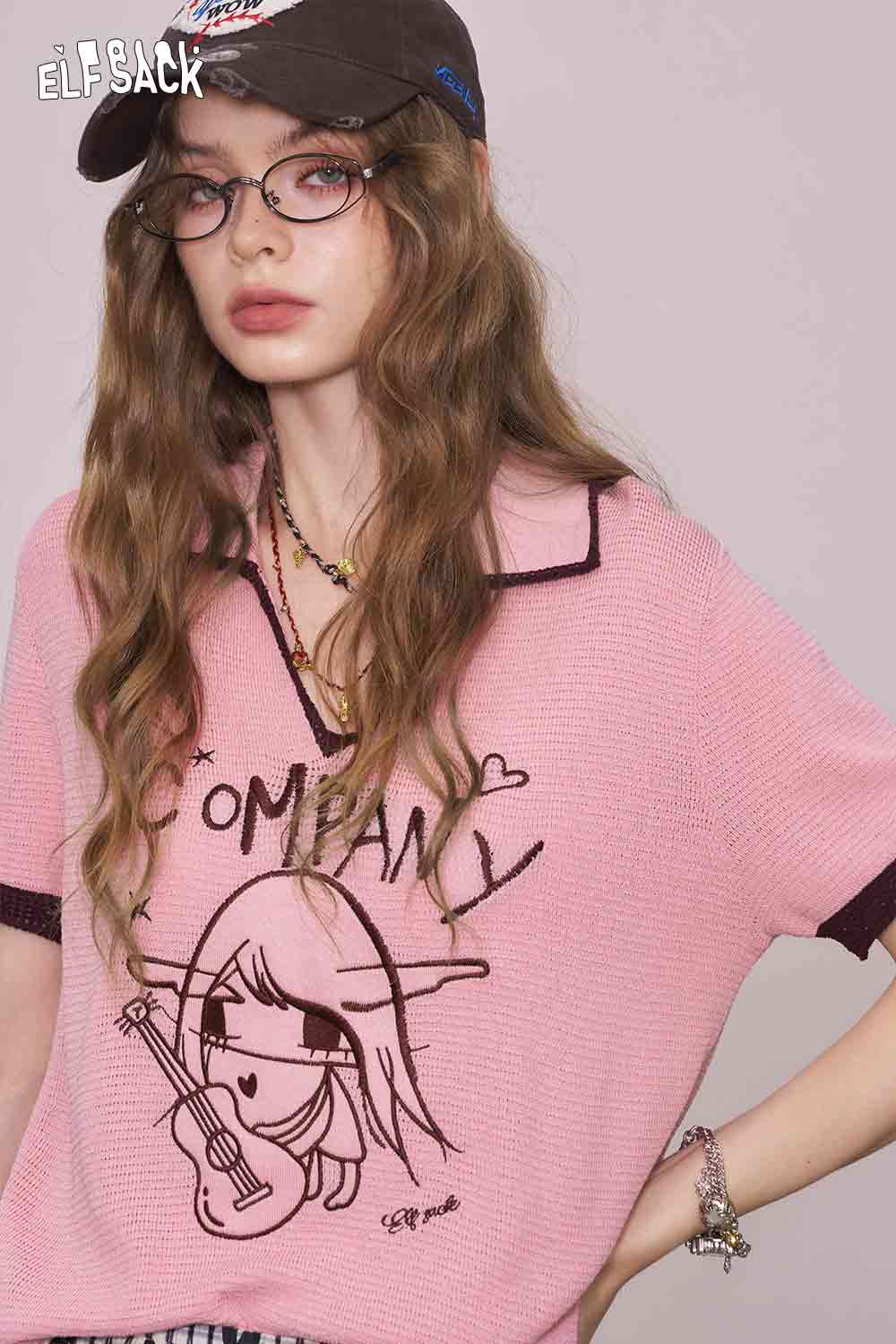 Light Notched Collar Structured Shoulder Embroidered Short Sleeve Knit Top Designer Blouse