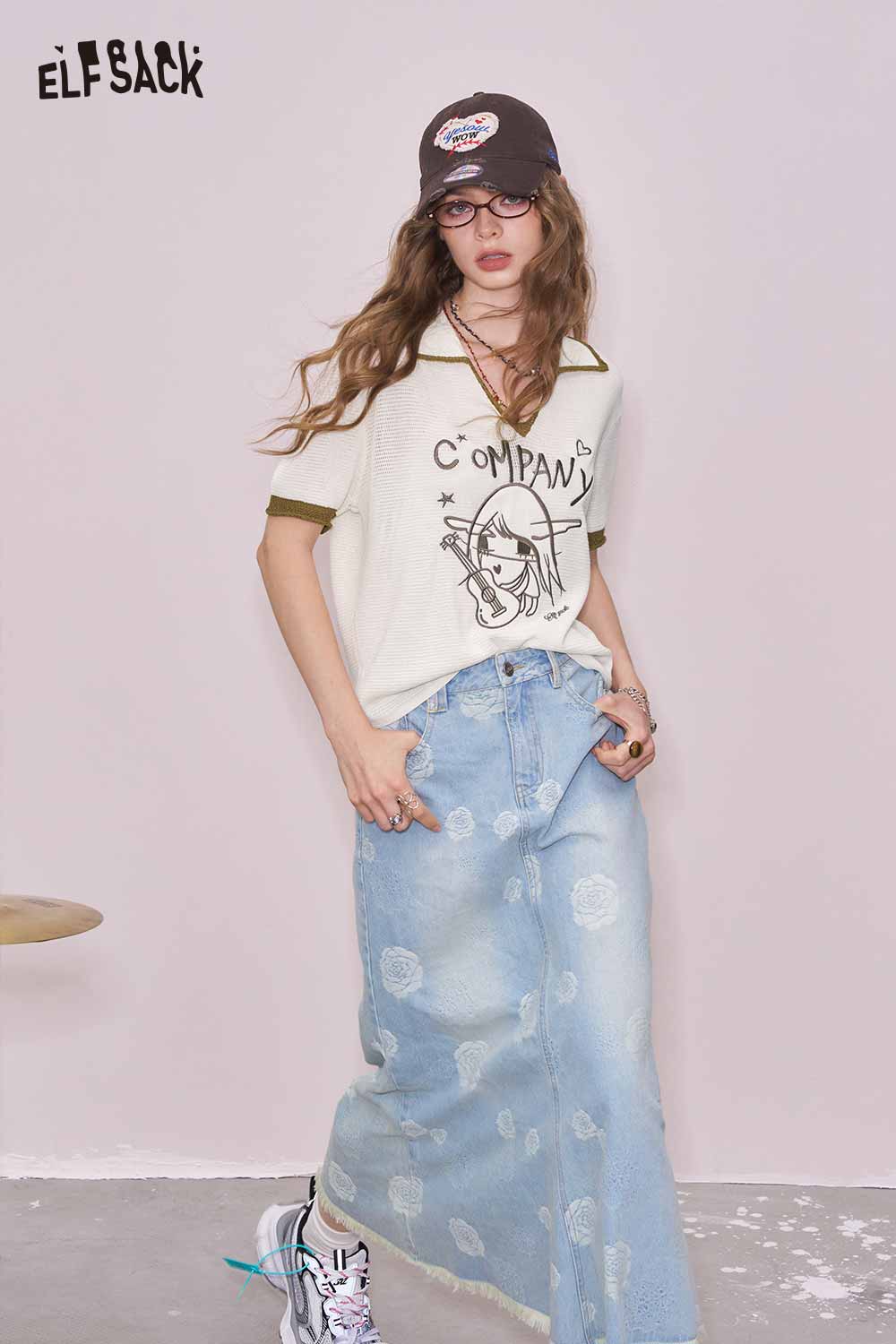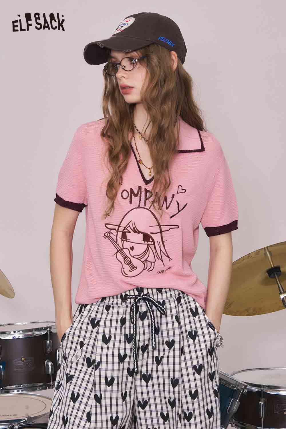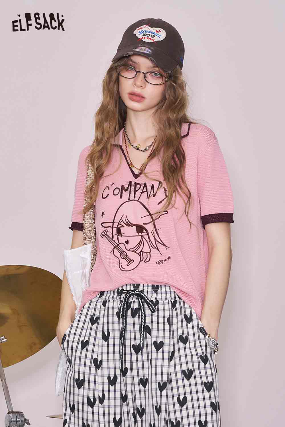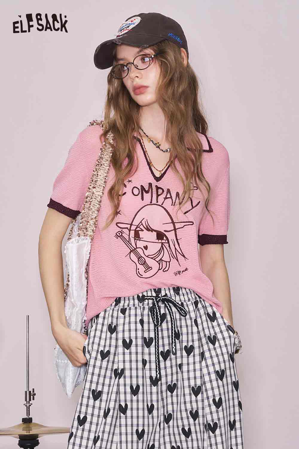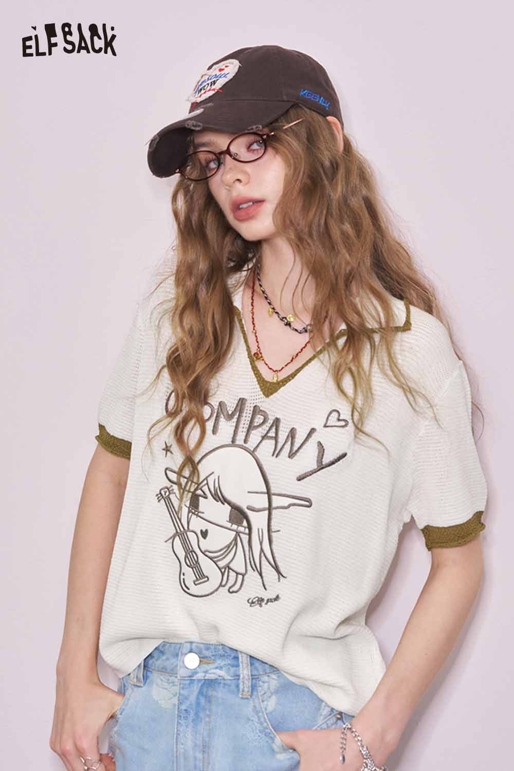 Light Notched Collar Structured Shoulder Embroidered Short Sleeve Knit Top Designer Blouse