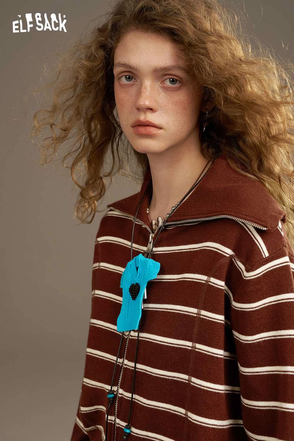 Soft Navy Collar Striped Silver Zipper Knitted Cardigan
