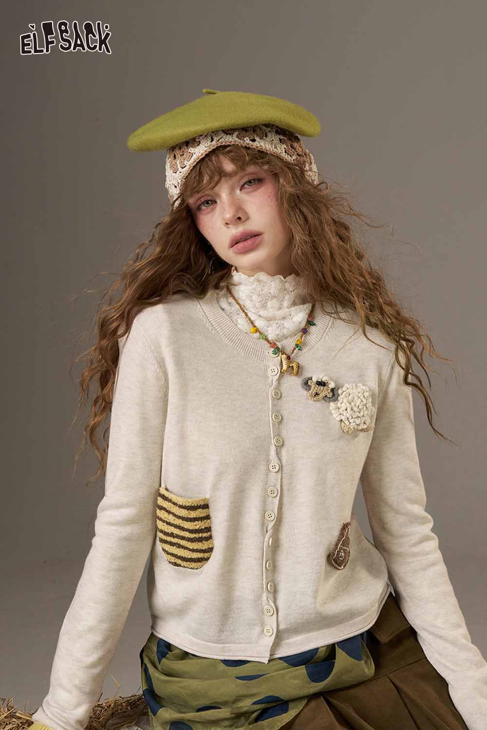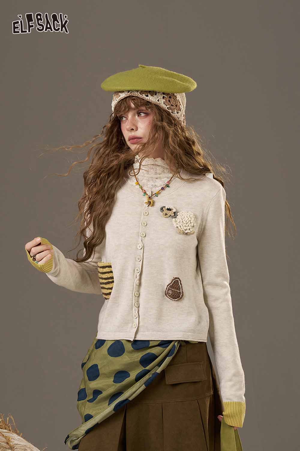 ELFSACK zebra print knit sweater for women with stylish button details and unique patches