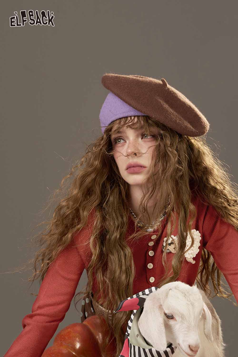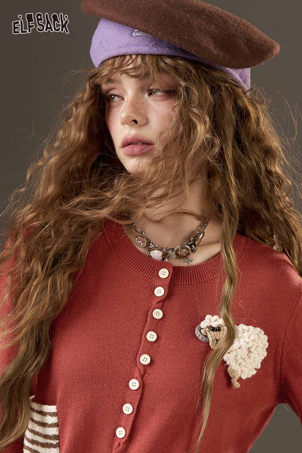 ELFSACK zebra print knit sweater for women styled with a brown beret and a goat