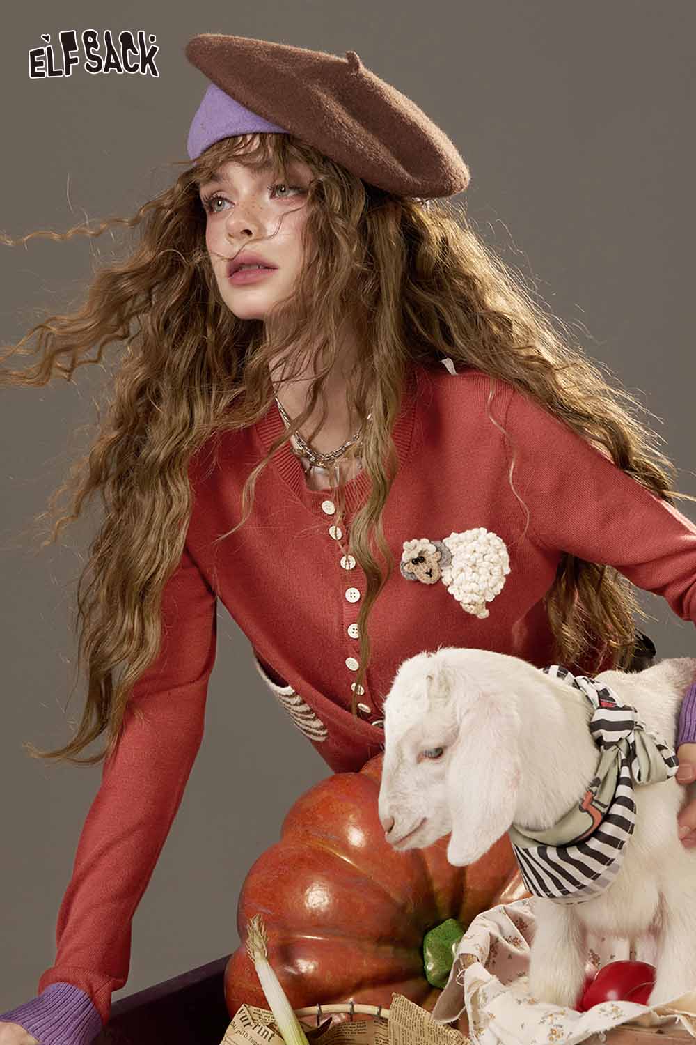 ELFSACK women's zebra print knit sweater for women in a cozy autumn setting with a goat and pumpkins
