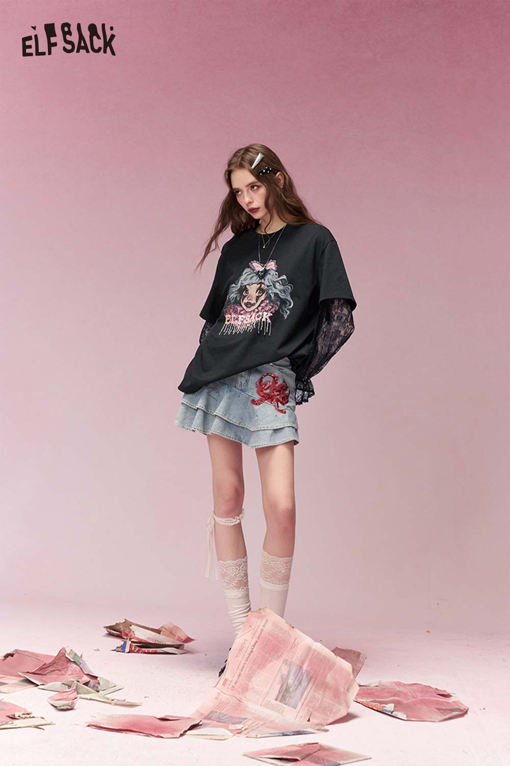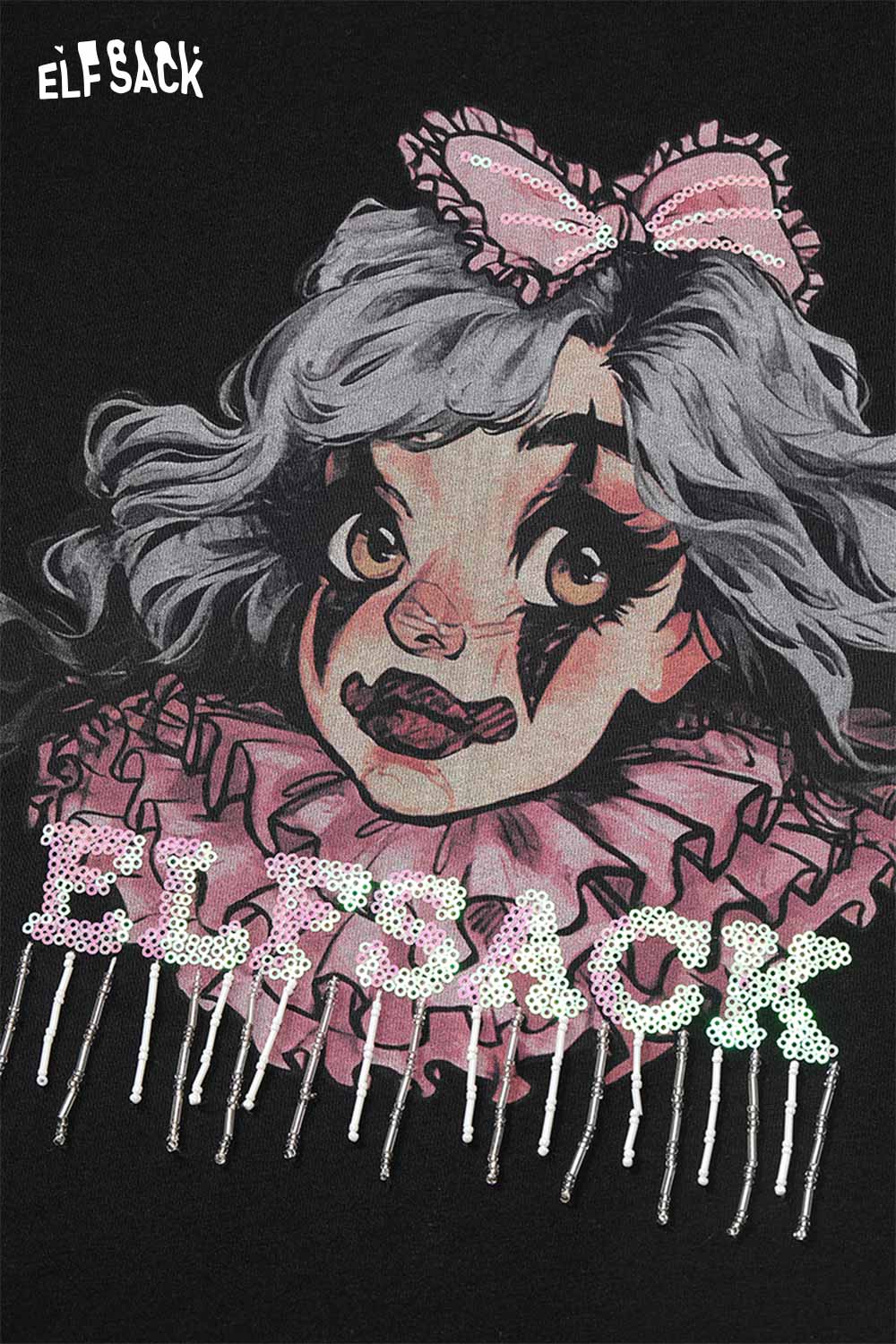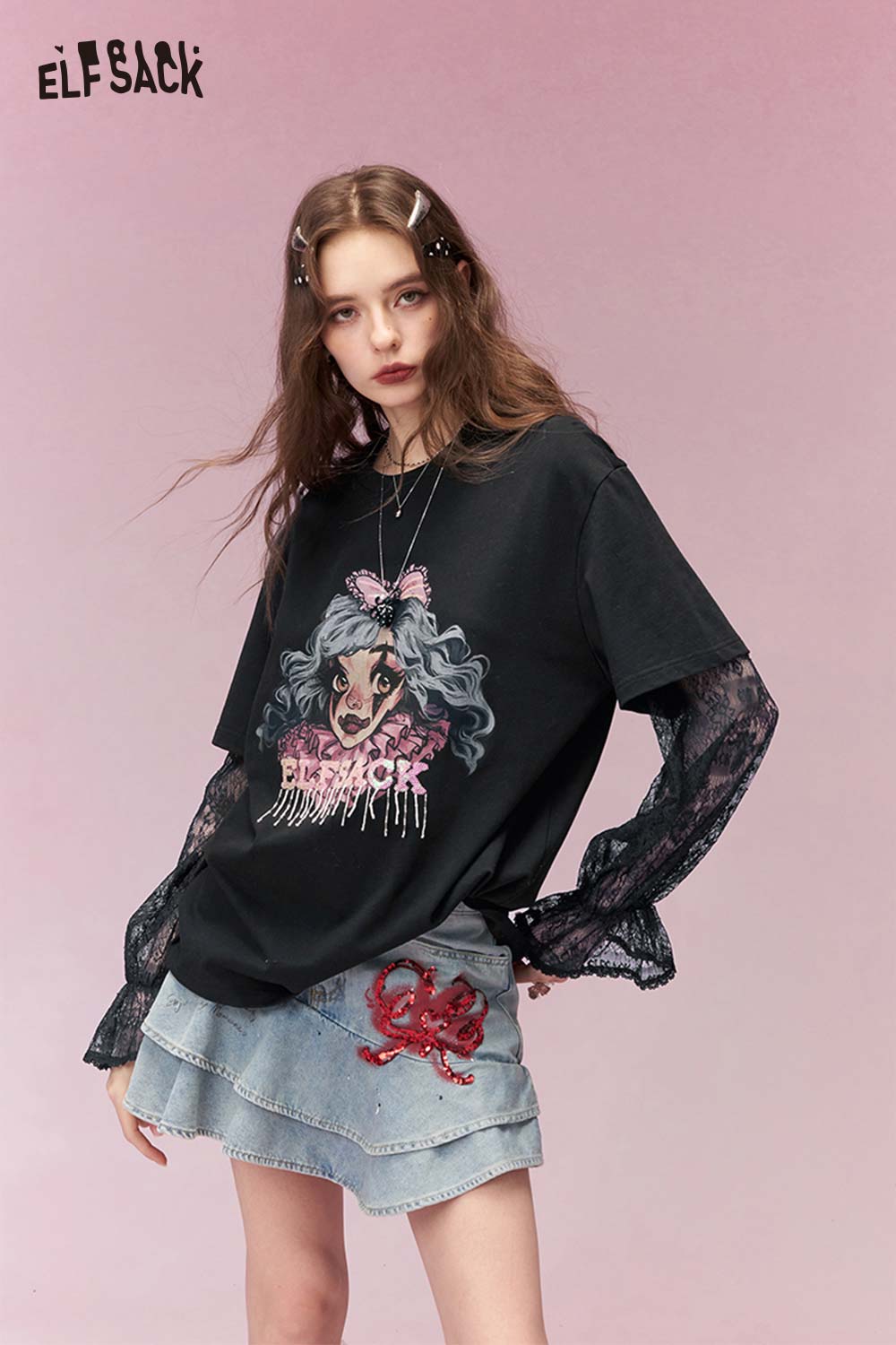 Sweet Cool Clown Girl Print Lace Insert Two Tone Tshirt