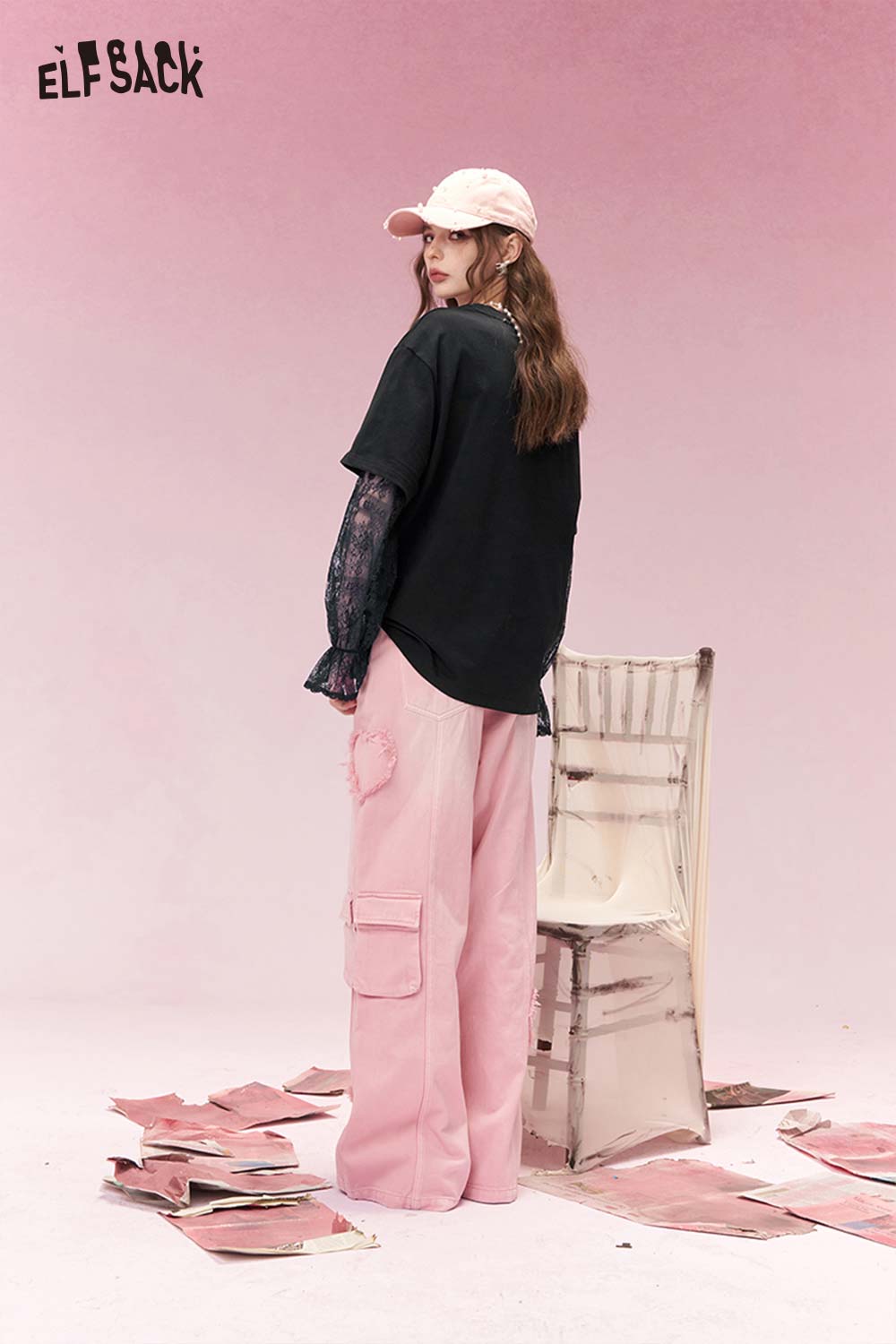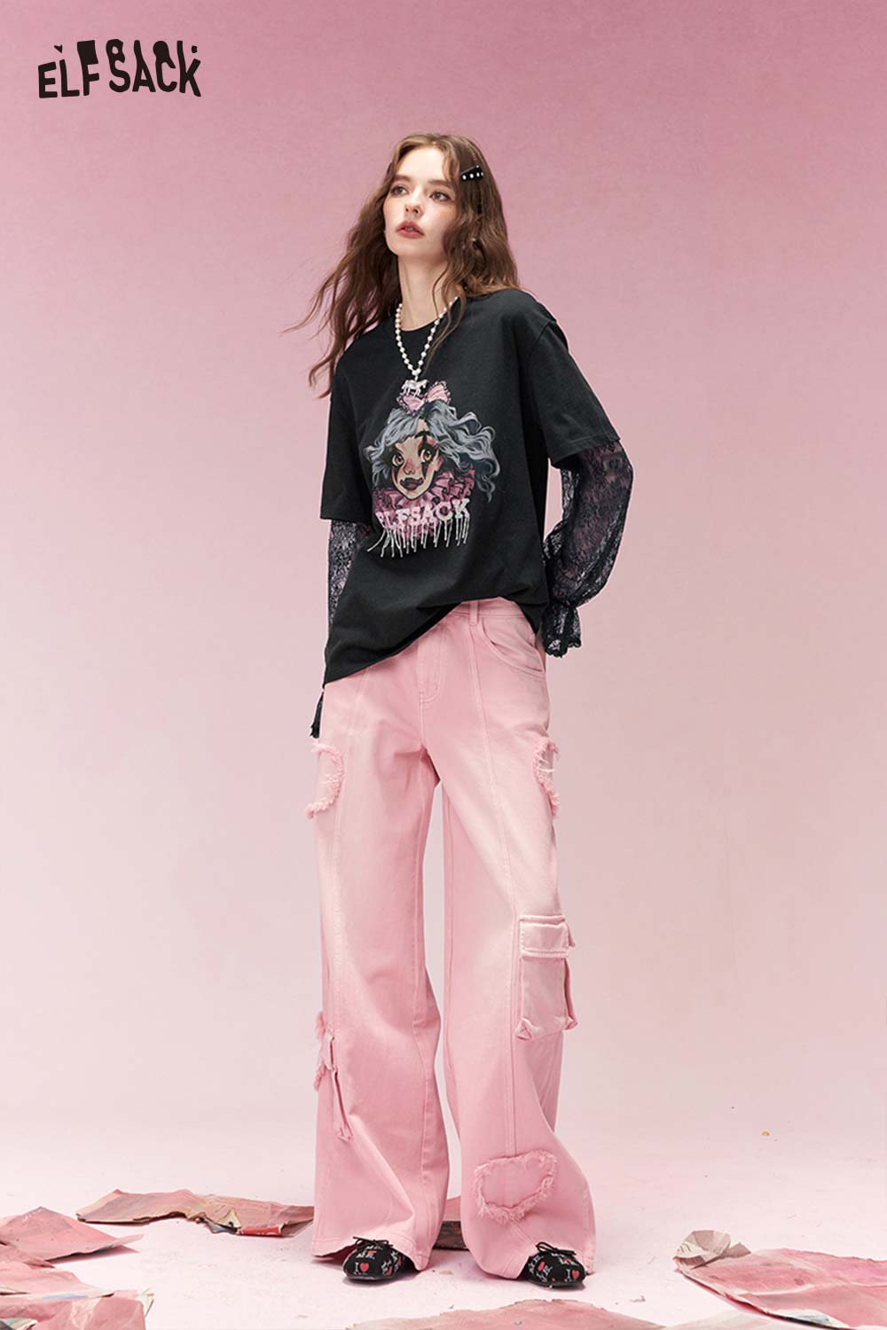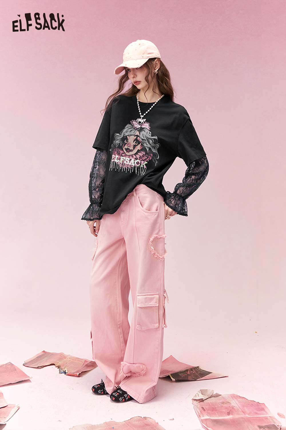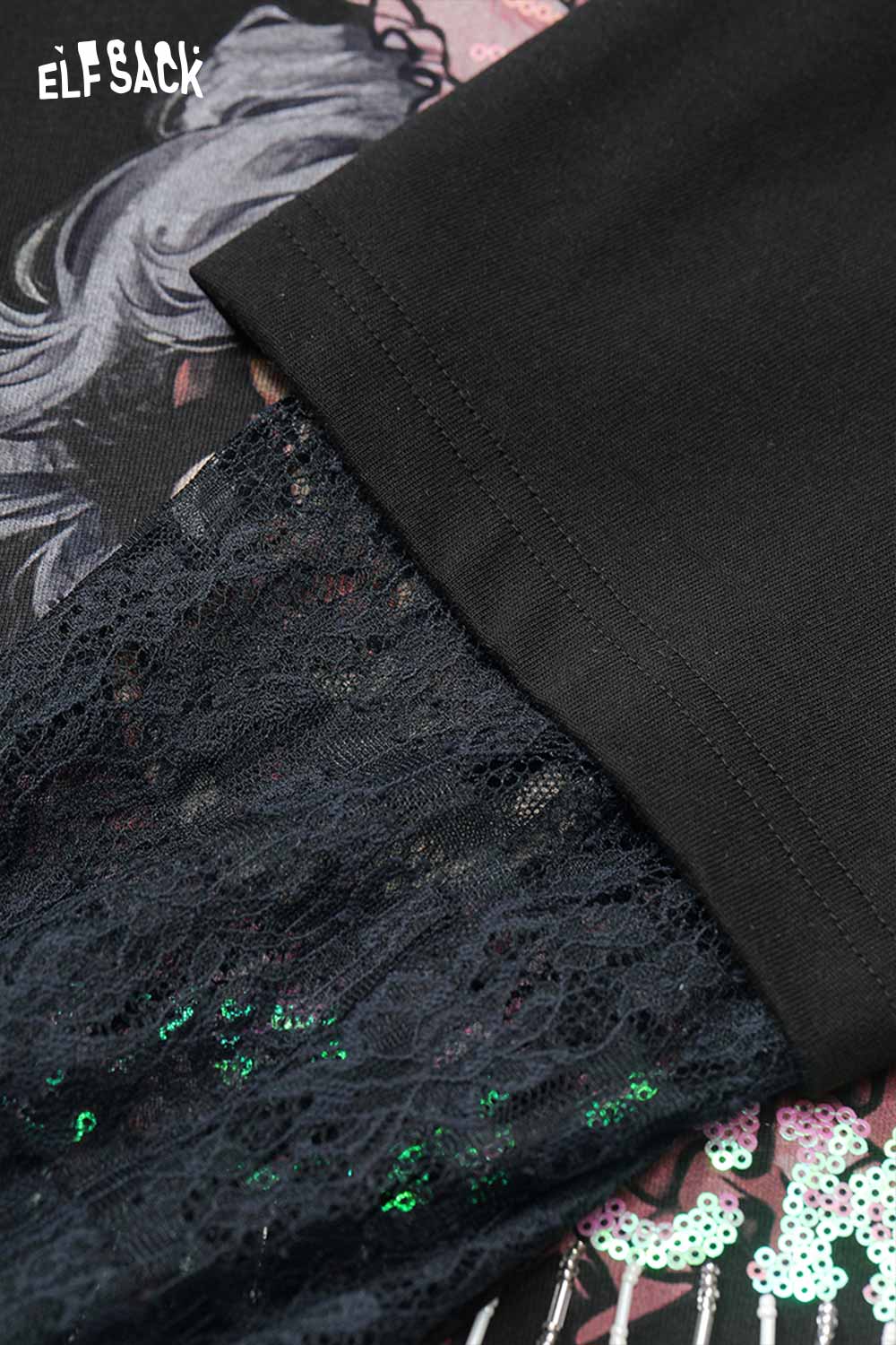 Sweet Cool Clown Girl Print Lace Insert Two Tone Tshirt