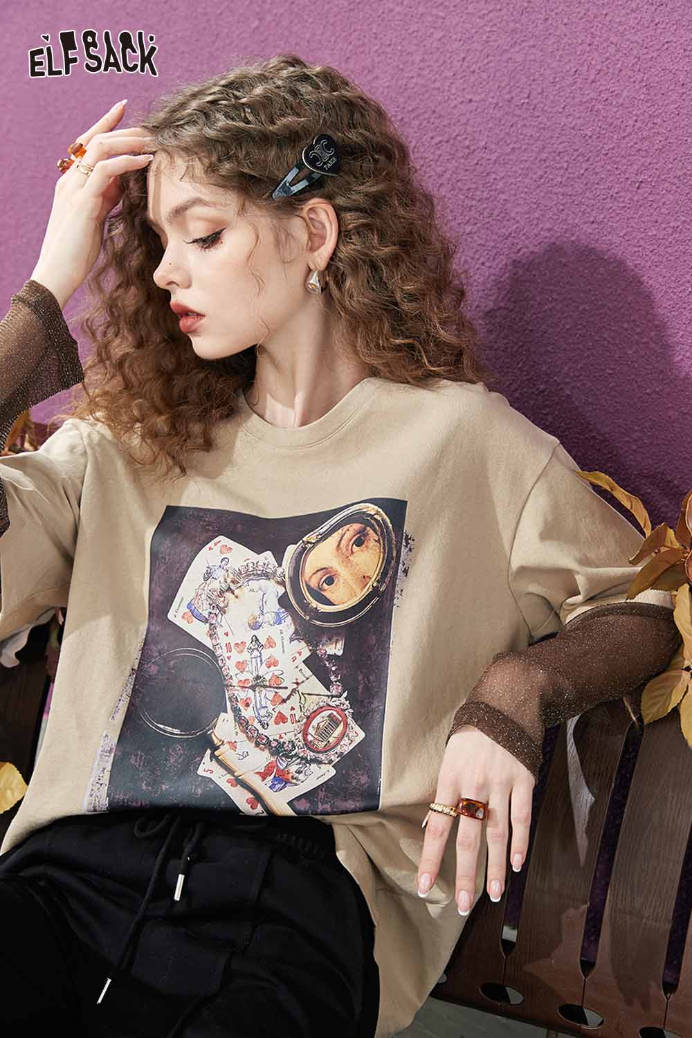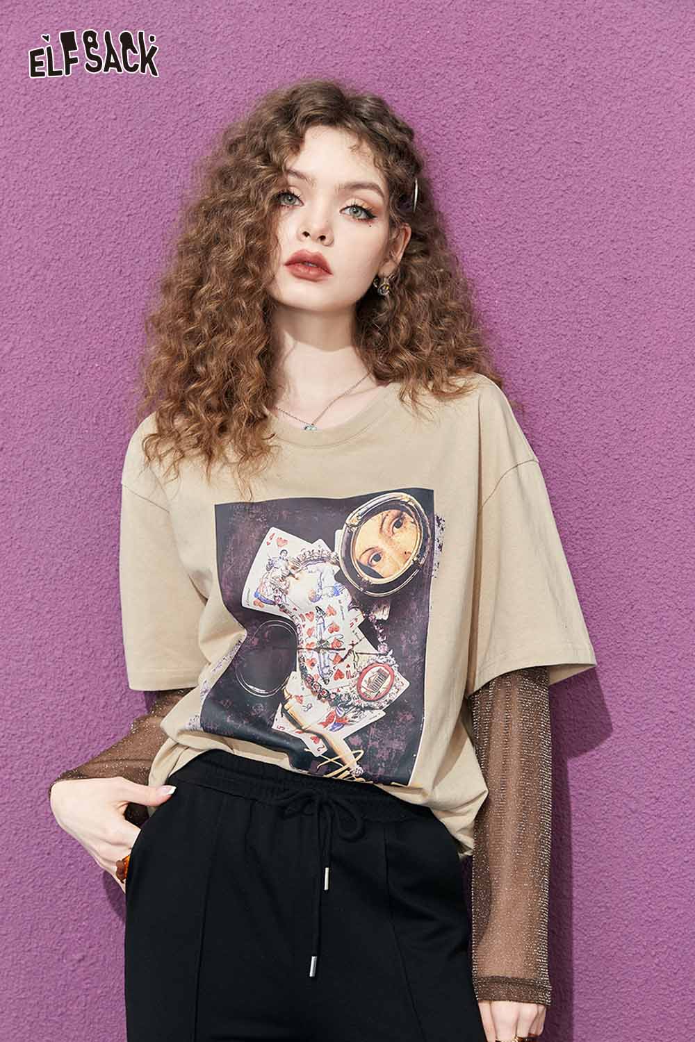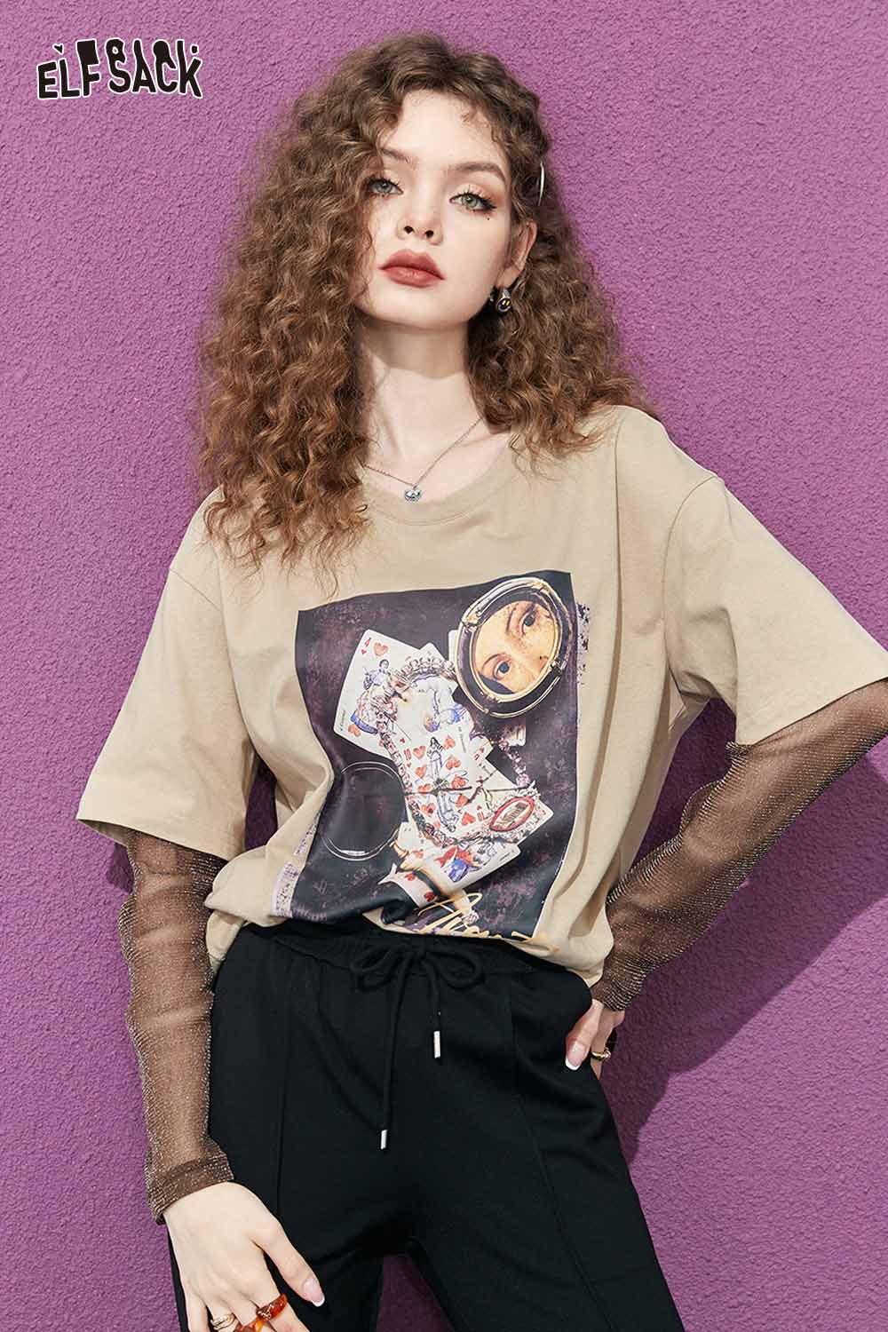 Loose Fake Two Piece Mesh Patchwork Graphic Long Sleeve Tshirt