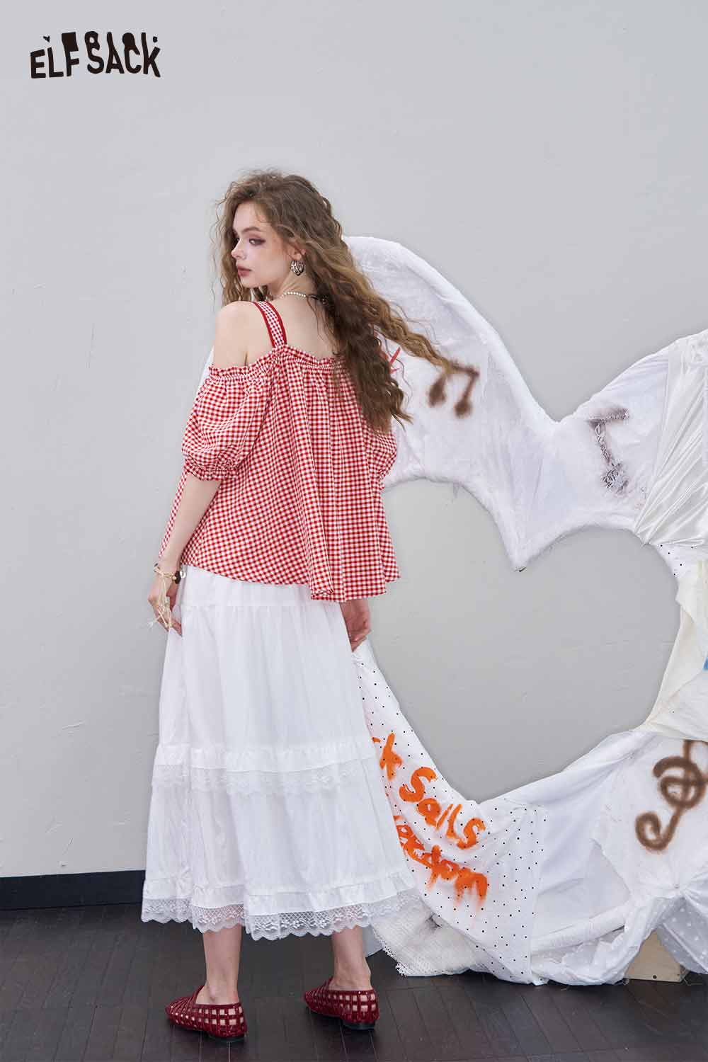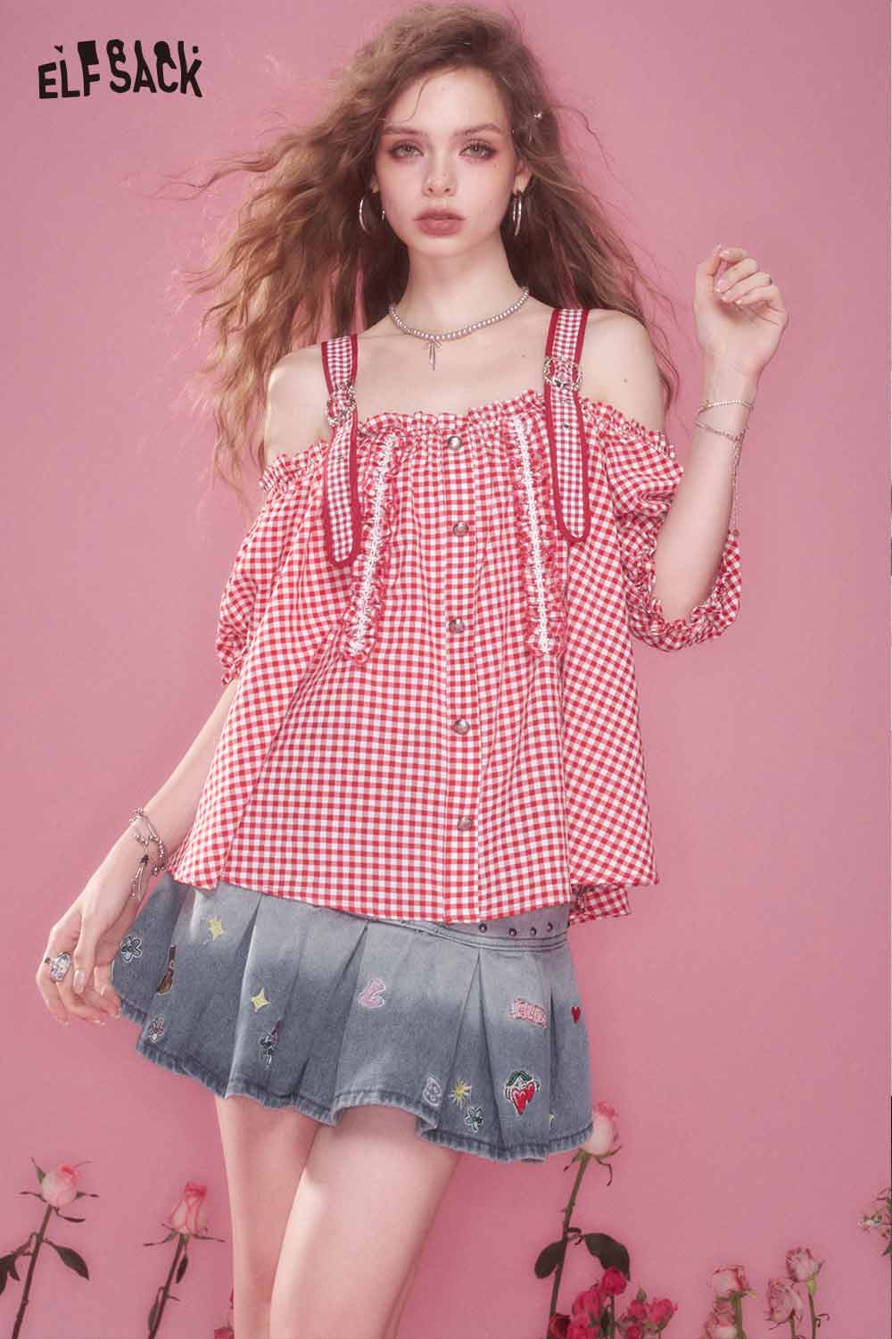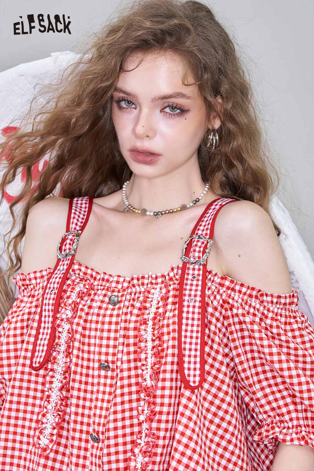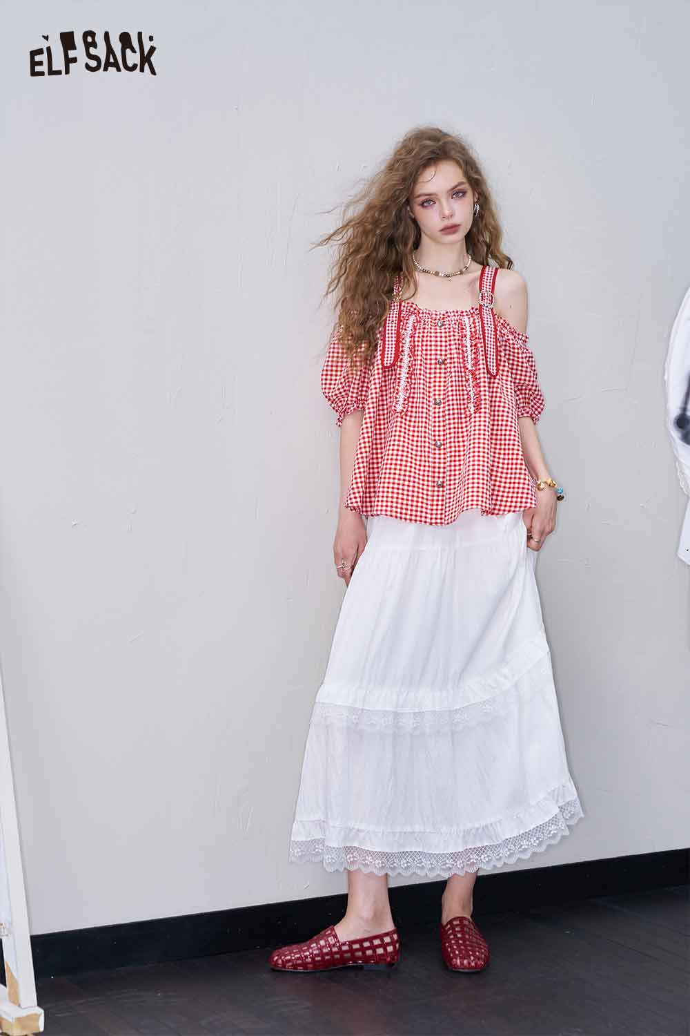 Cute Off Shoulder Plaid Lace Sweet Chiffon Top