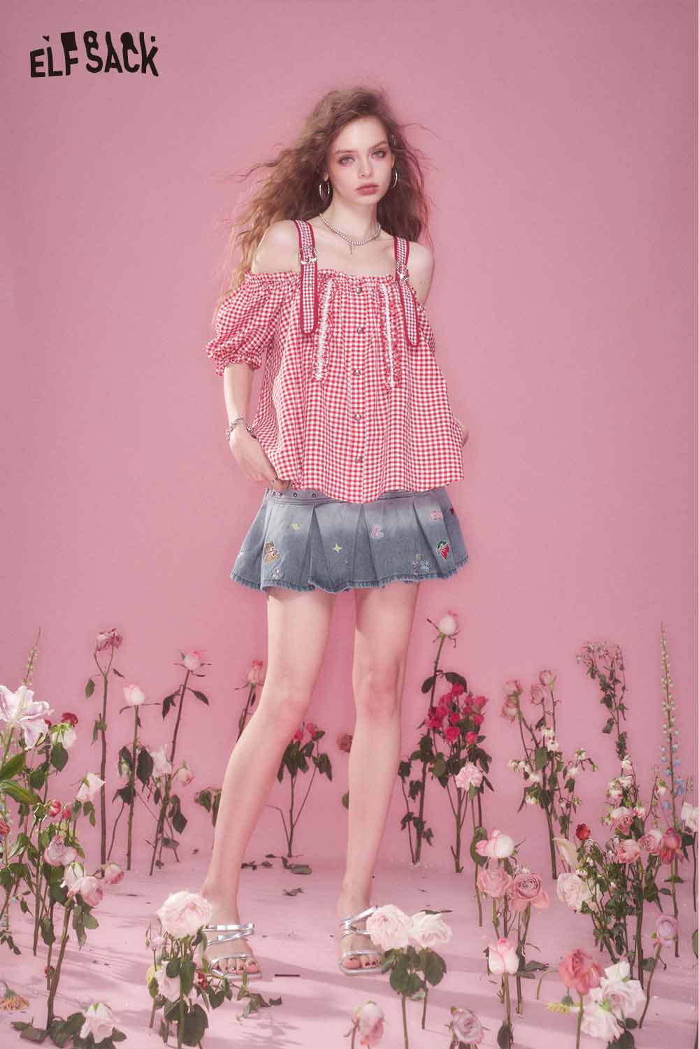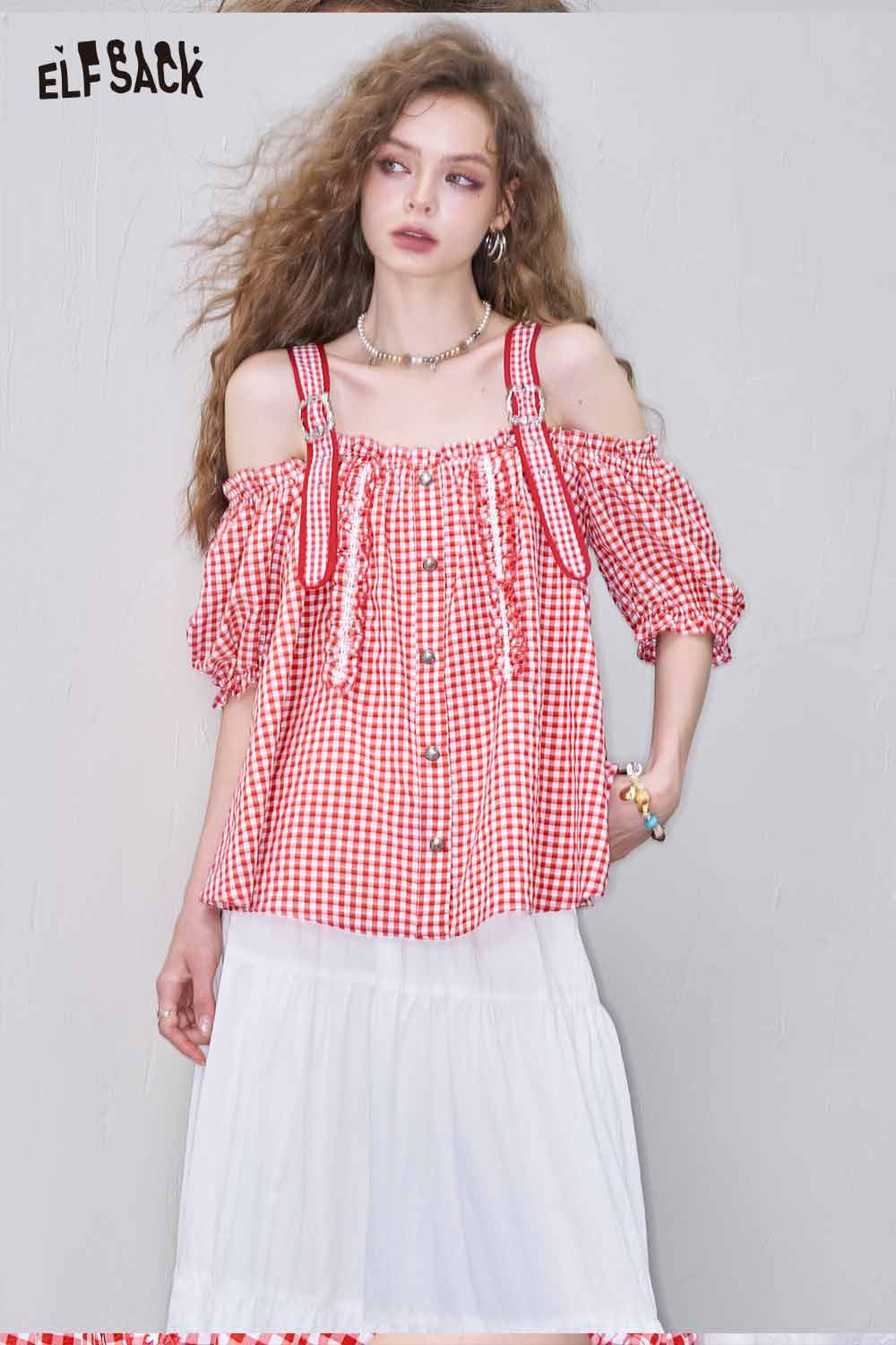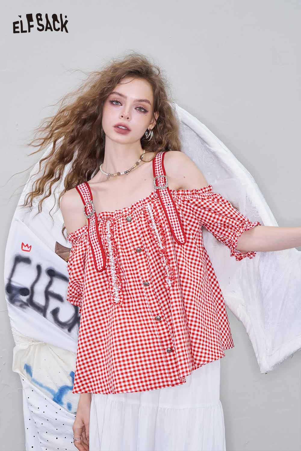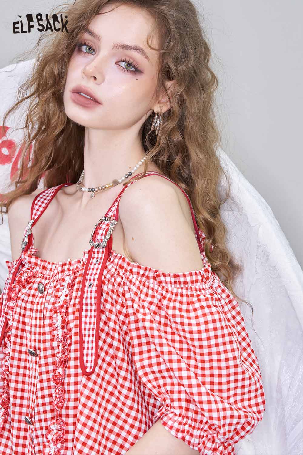Cute Off Shoulder Plaid Lace Sweet Chiffon Top