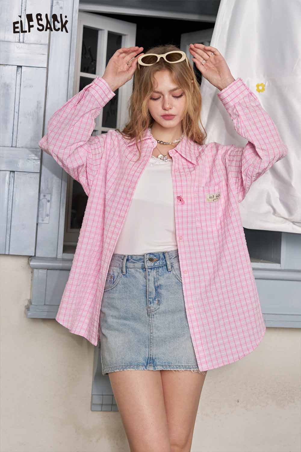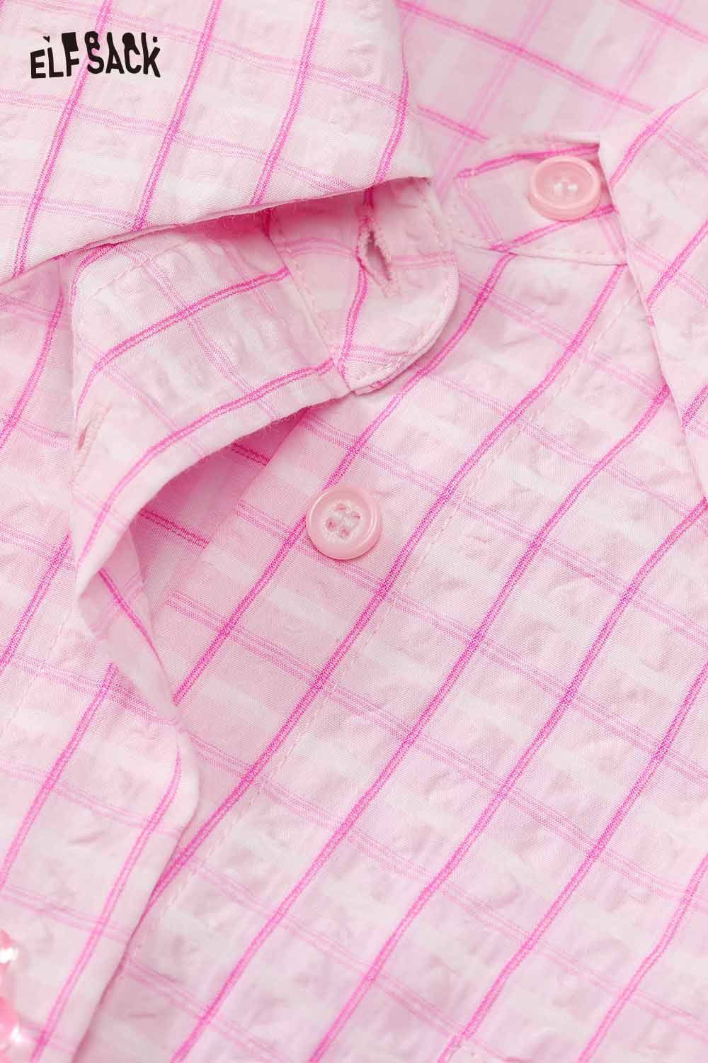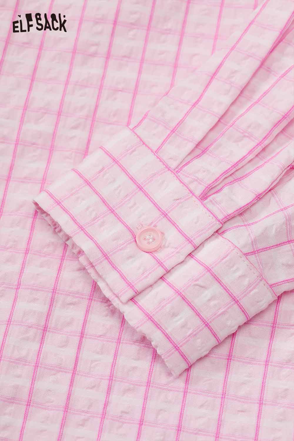 Cute Textured Pink Plaid Long Sleeve Boyfriend Shirt