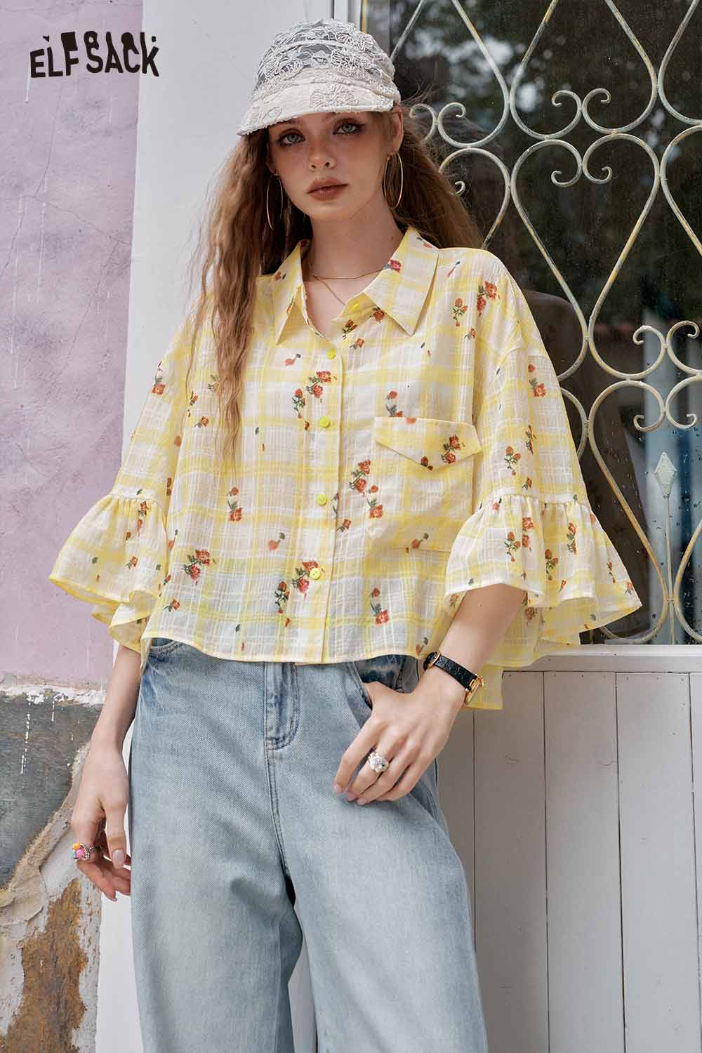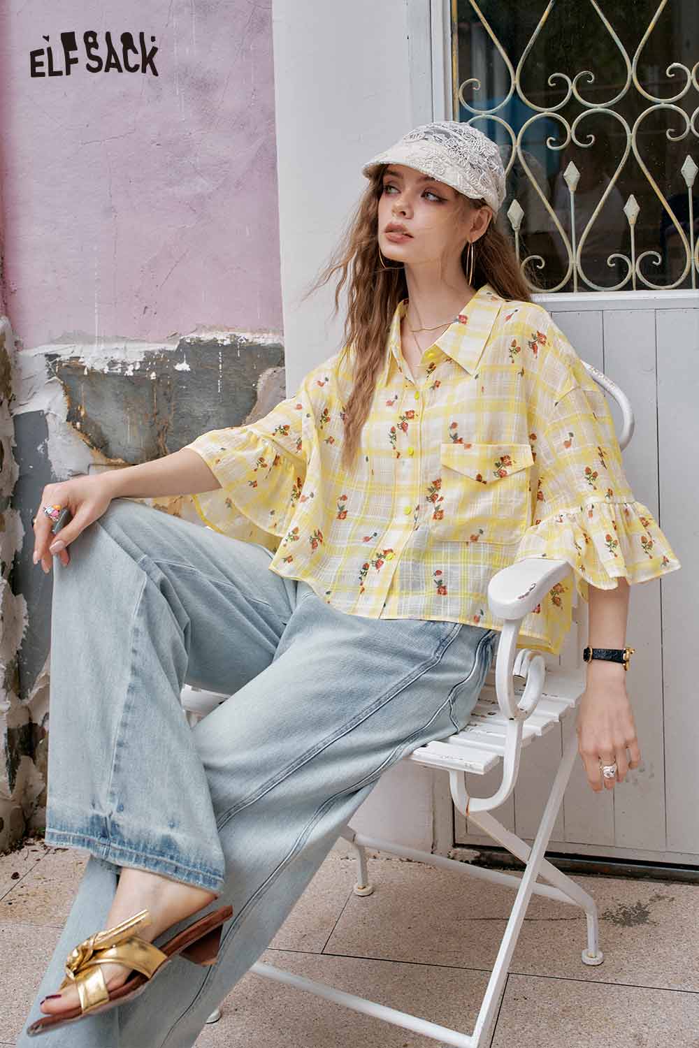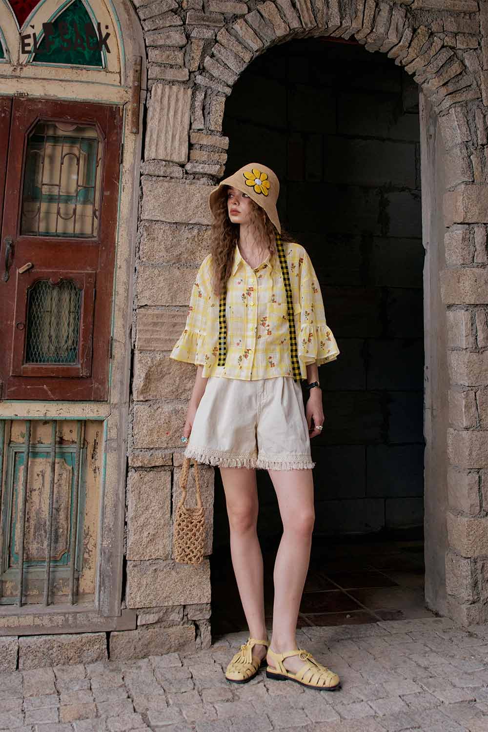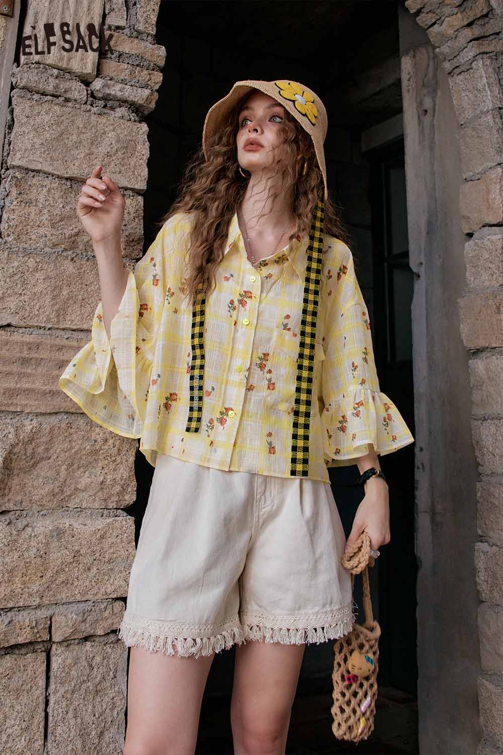 Cute Yellow White Plaid Flare Sleeve Sweet Blouse