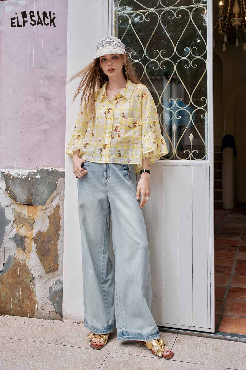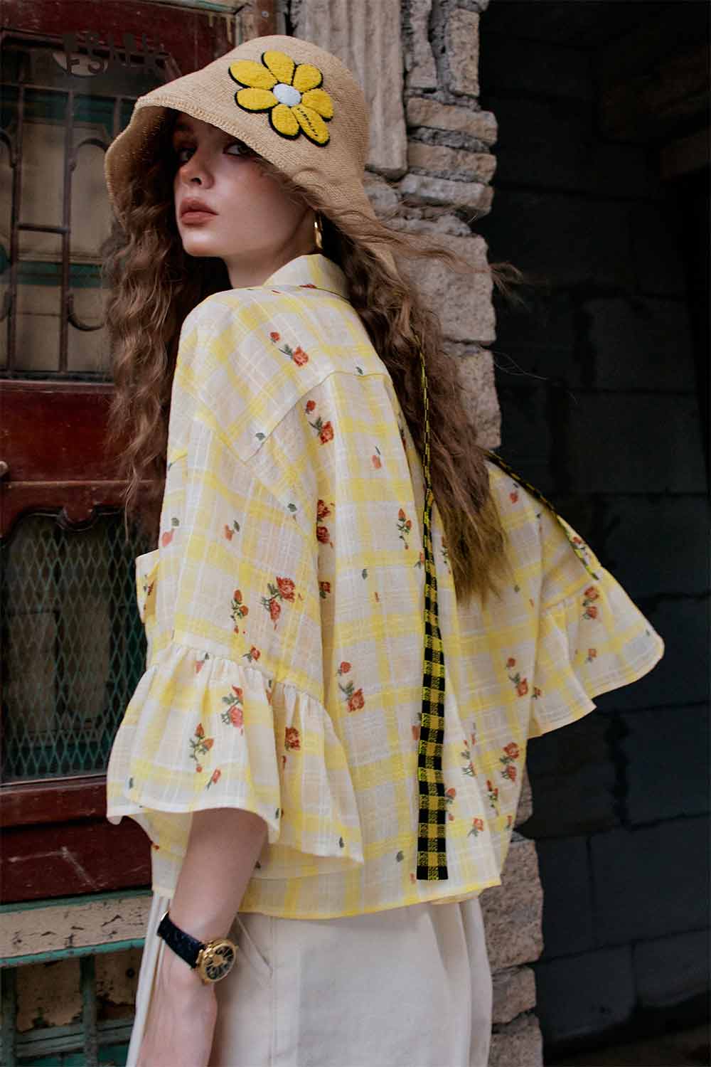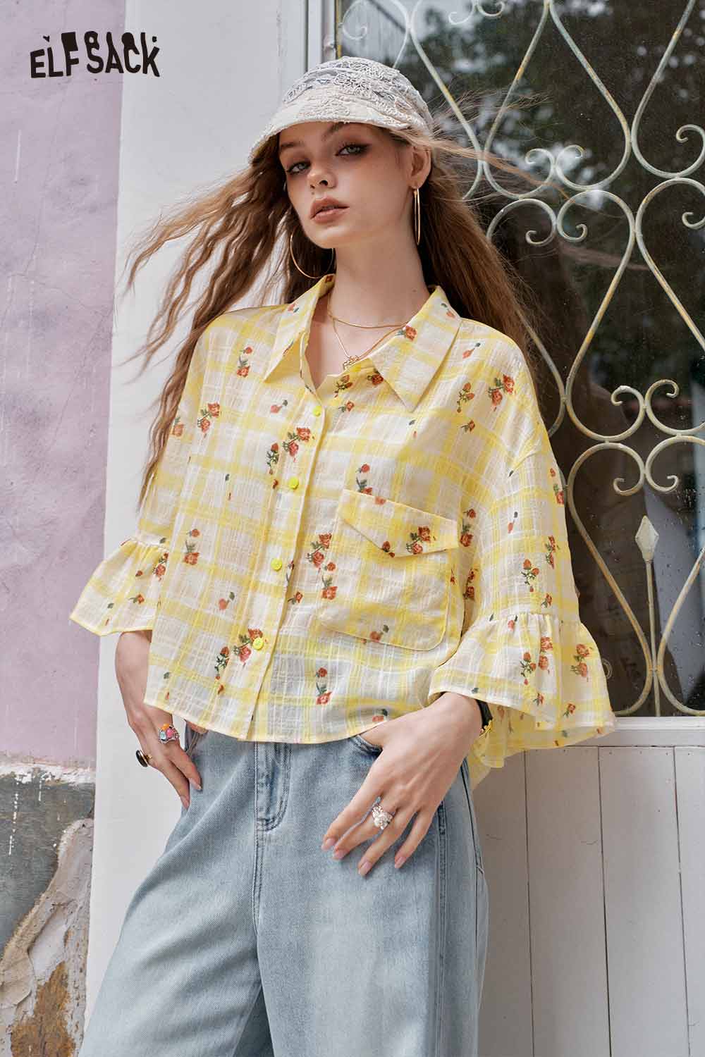 Cute Yellow White Plaid Flare Sleeve Sweet Blouse