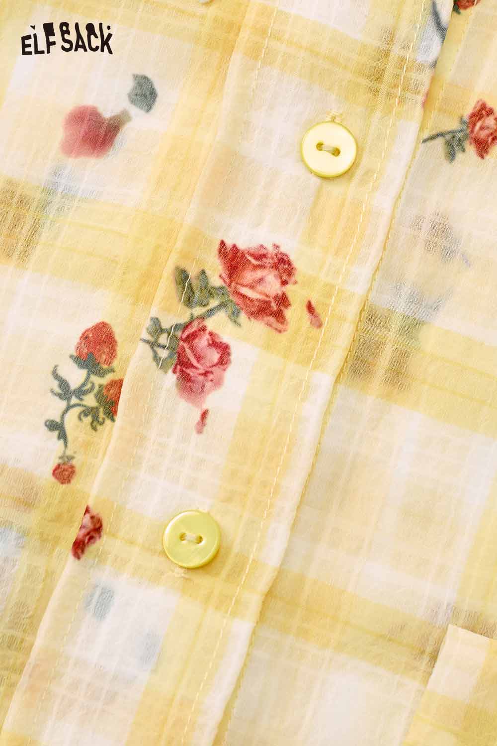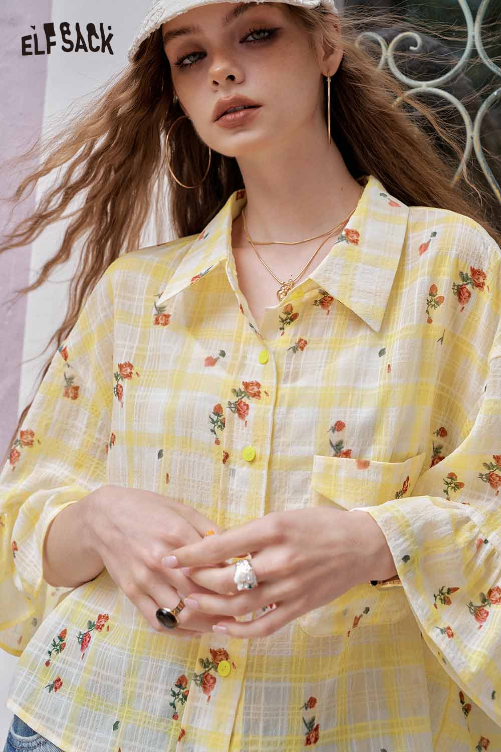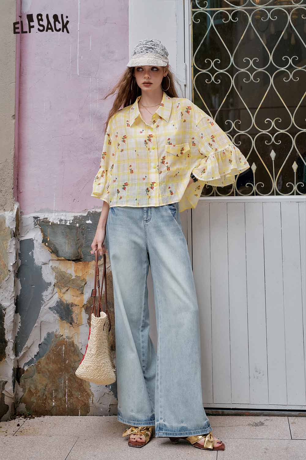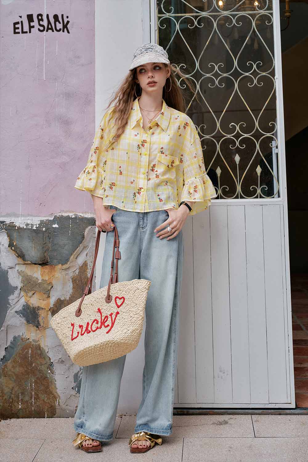 Cute Yellow White Plaid Flare Sleeve Sweet Blouse