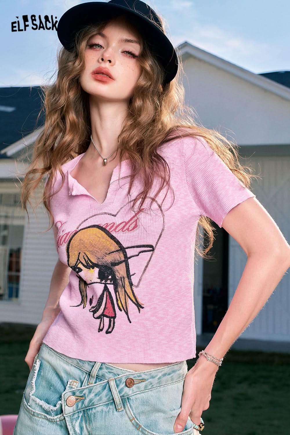 V-neck printed green slim fit thin sexy slim all-match short-sleeved knitted sweater