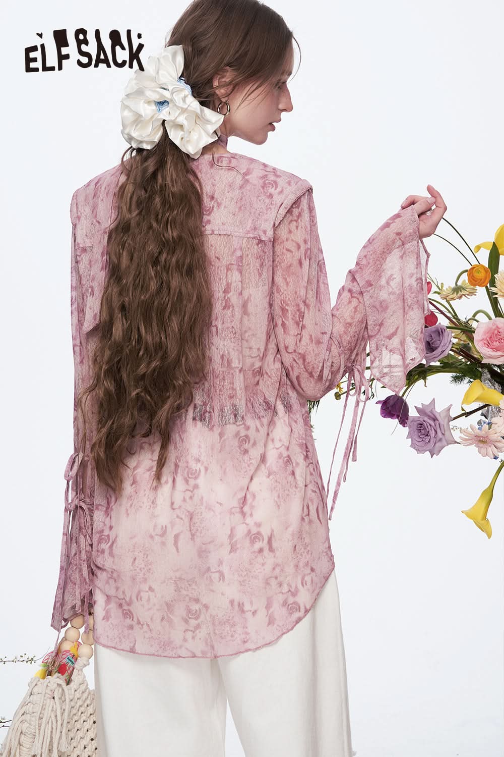 Elegant Sweet V-neck Printed Flare Sleeve Lace-up Chiffon Blouse Women