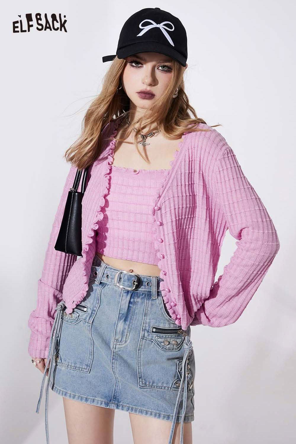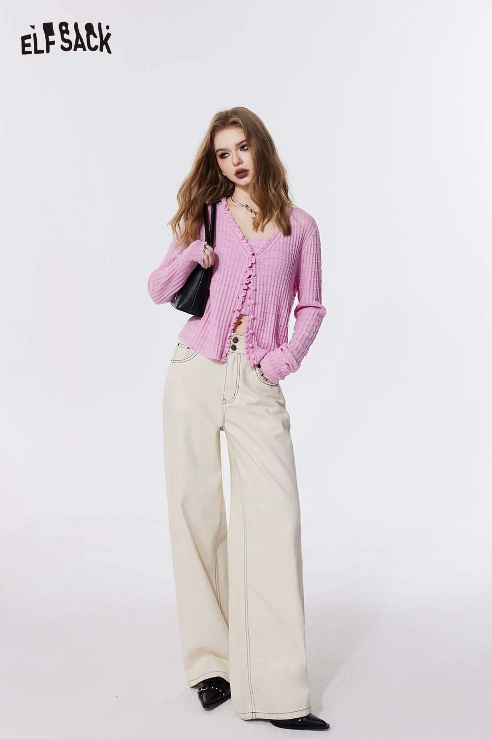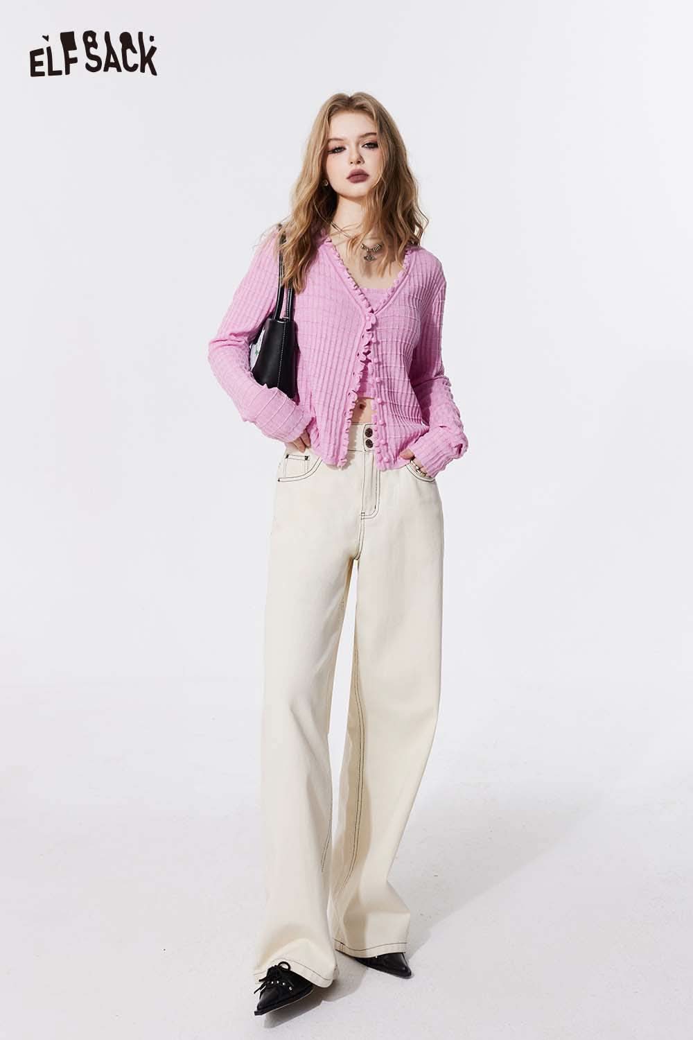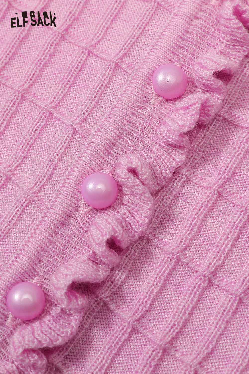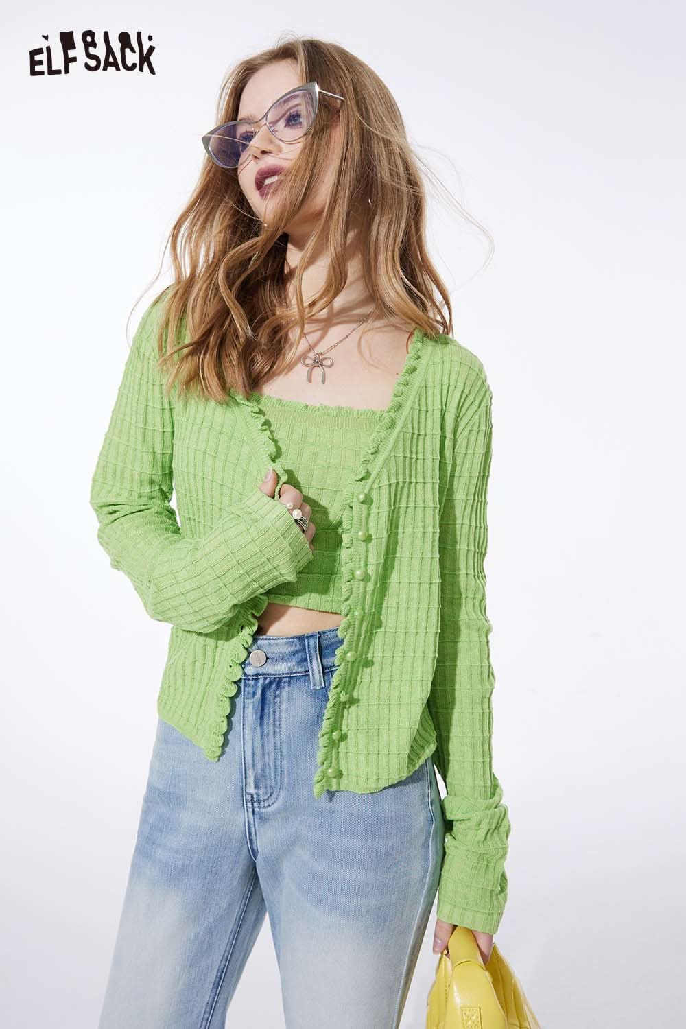 Ruffle V Neck Solid Cropped Knit Cardigan Slim Fit