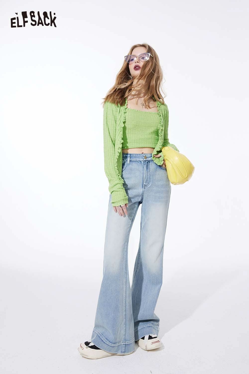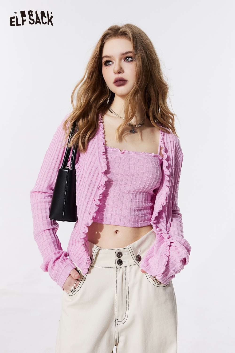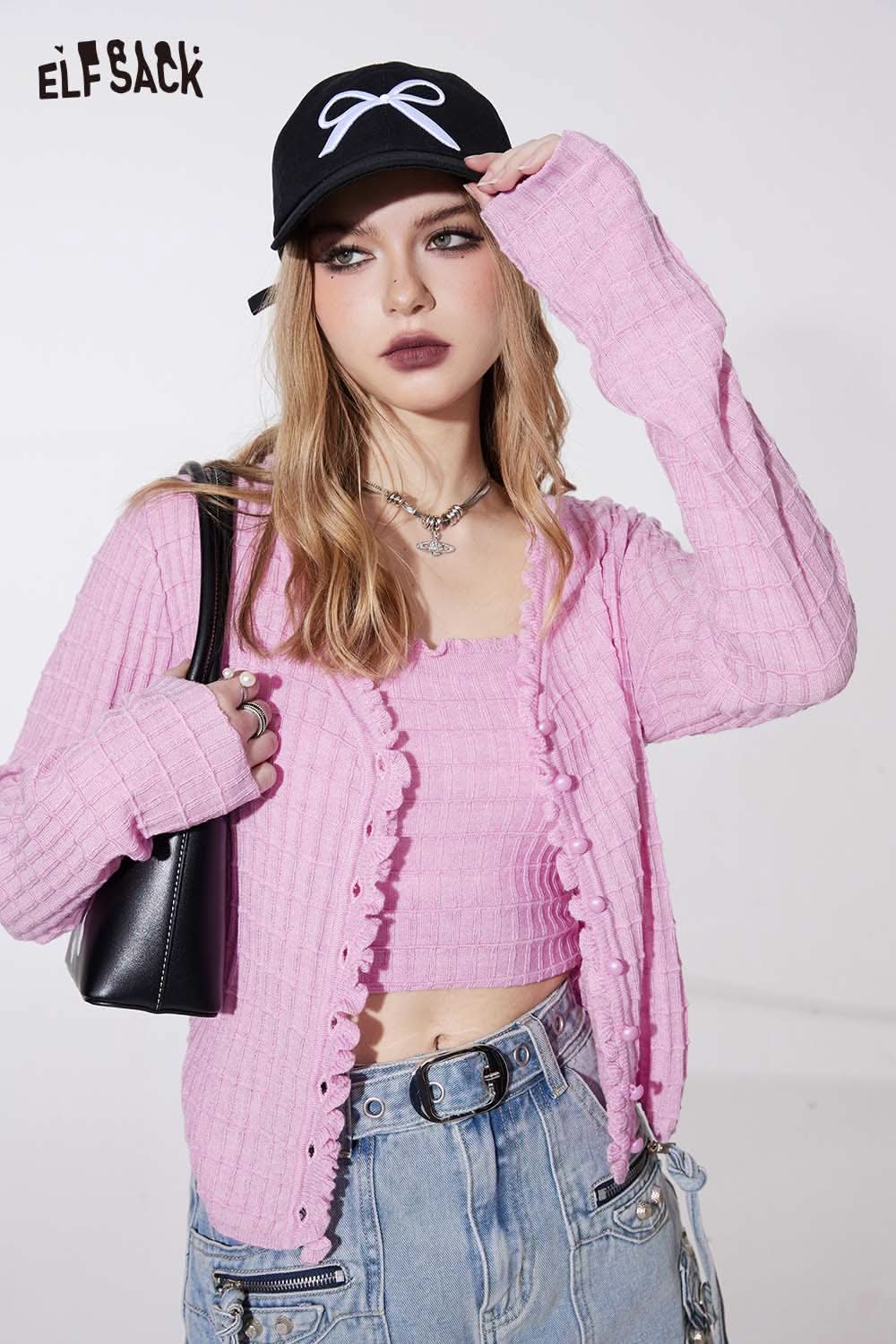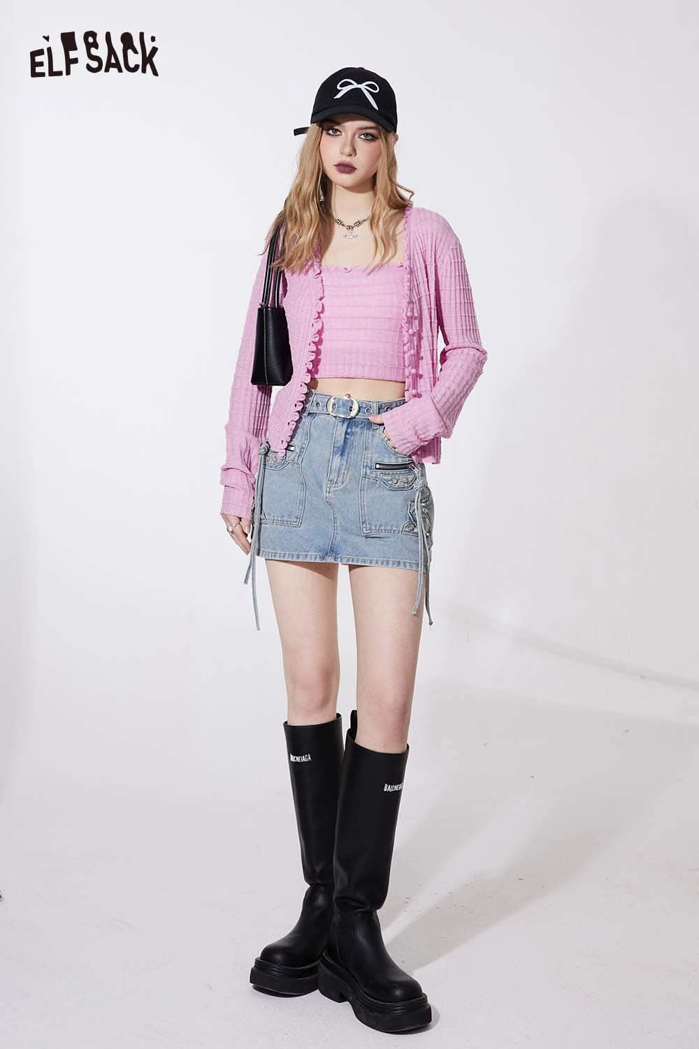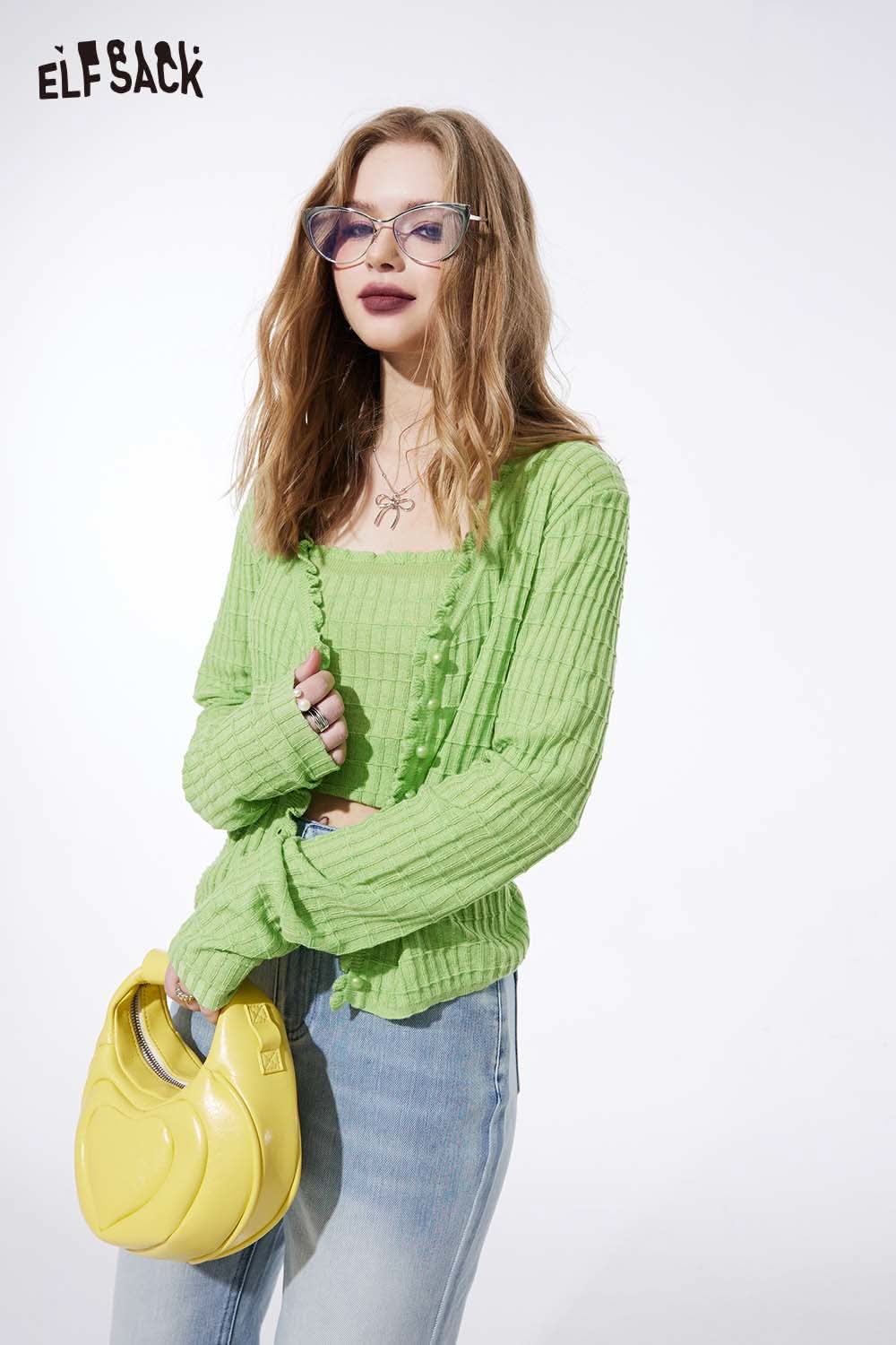 Ruffle V Neck Solid Cropped Knit Cardigan Slim Fit