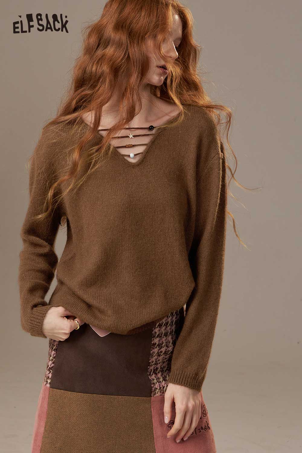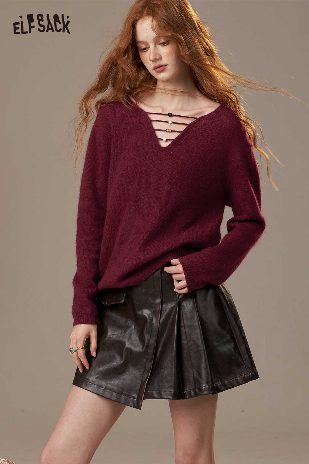 Soft Knit Lace-up Beaded V-Neck Loose Fit Sweater
