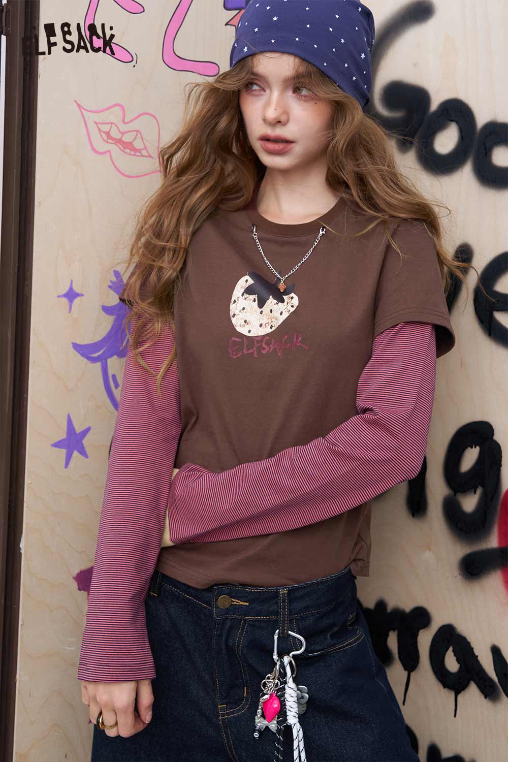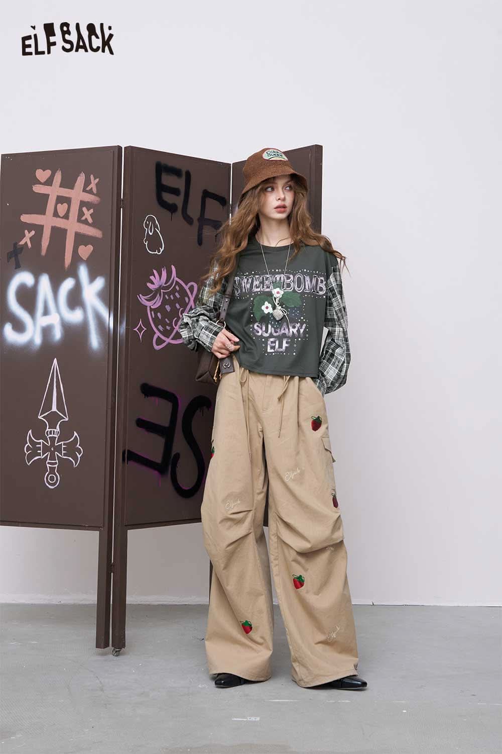 ELFSACK model wearing a burgundy luminous strawberry embroidered tee with layered plaid sleeves