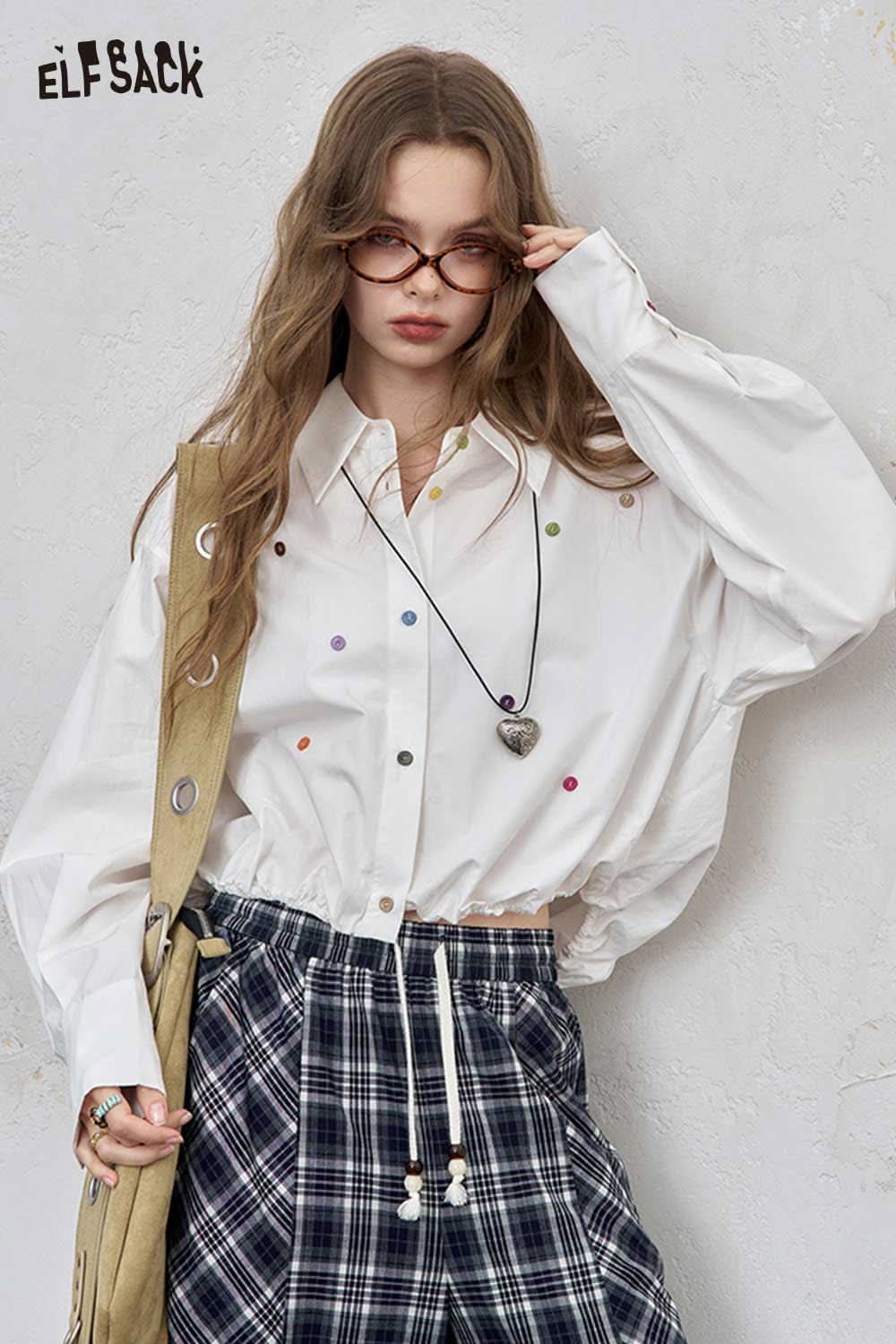 ELFSACK model wearing linen blend embroidery tee for women white long sleeve henley with chest embroidery