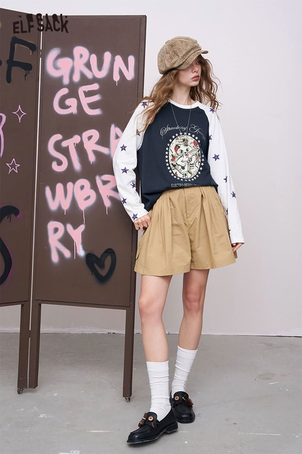 ELFSACK oversized daisy graphic tee for women long sleeve brown relaxed fit on model wearing sunglasses